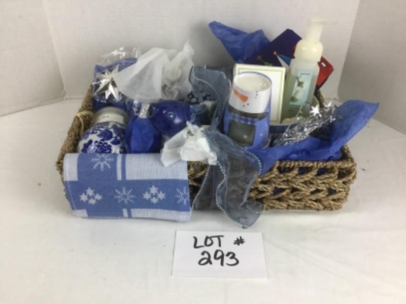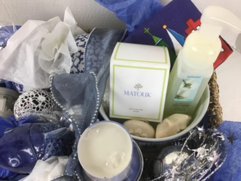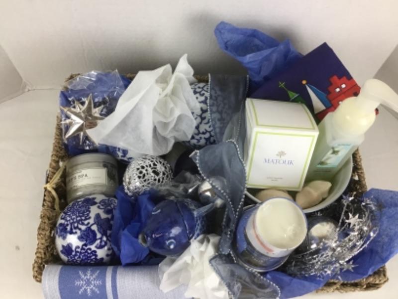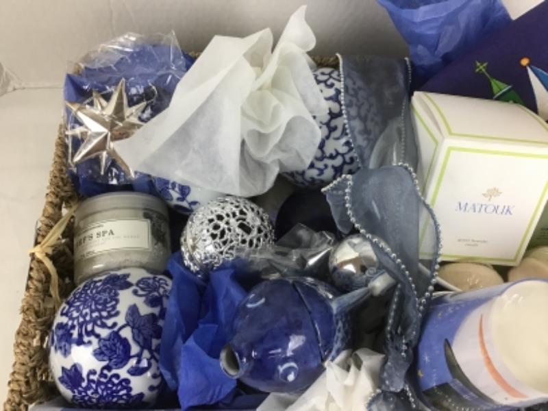 Glass Blue and white bulbs, spa treatment , for your hands, silver ornaments, tea towels, soups, paper products, tea towels, soaps, paper products, tea towels, ceramic blue and white decorative balls, and candles