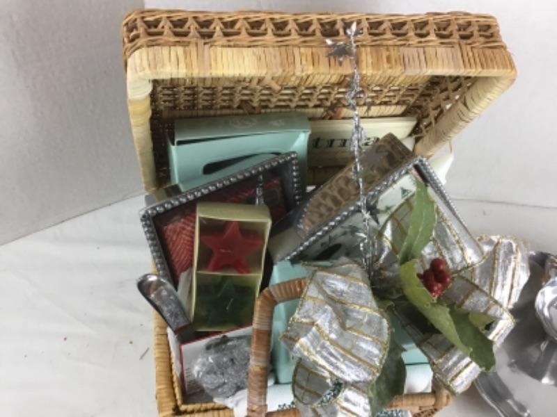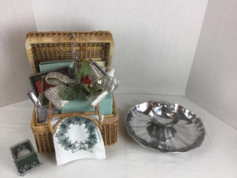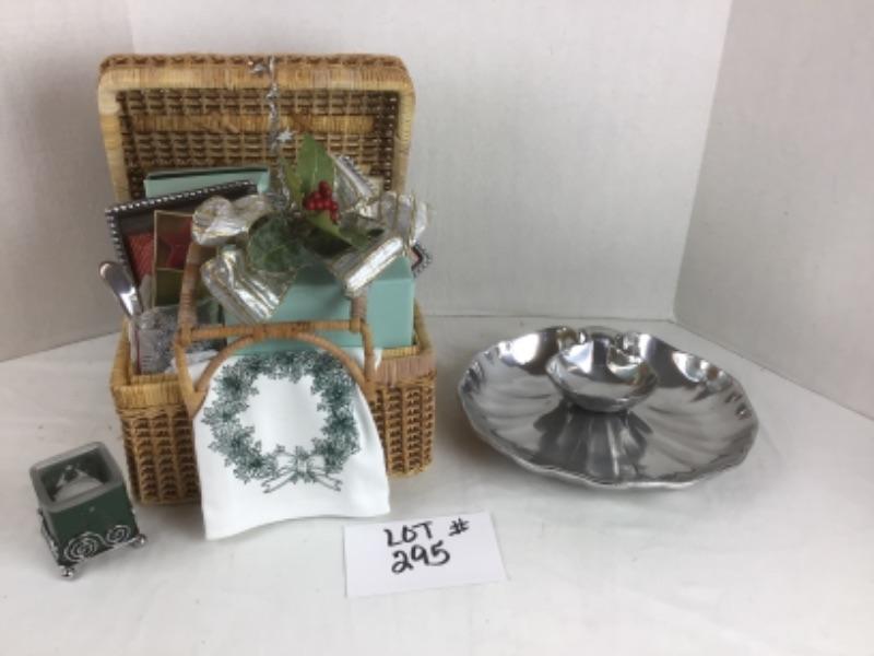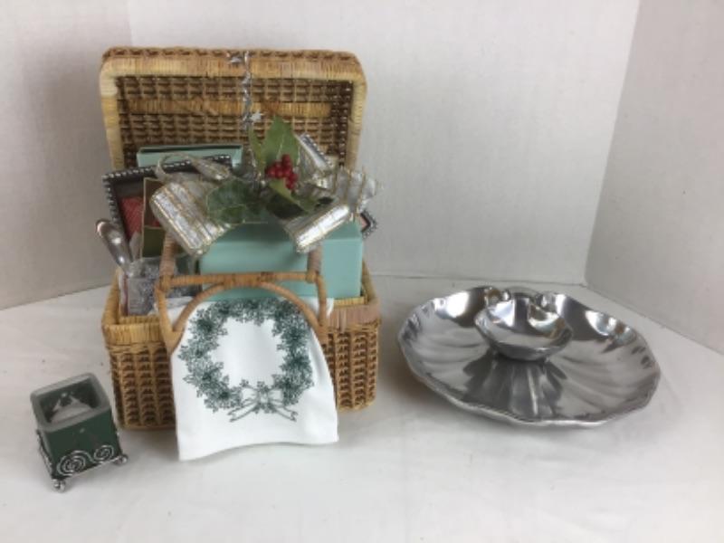 Mariposa Basket with shell chip and dip bowl (not Mariposa), candles, 2 Mariposa napkin holders, with napkins and Mariposa napkin weight, ornaments, sign, spreader, tea towels, hand sanitizers