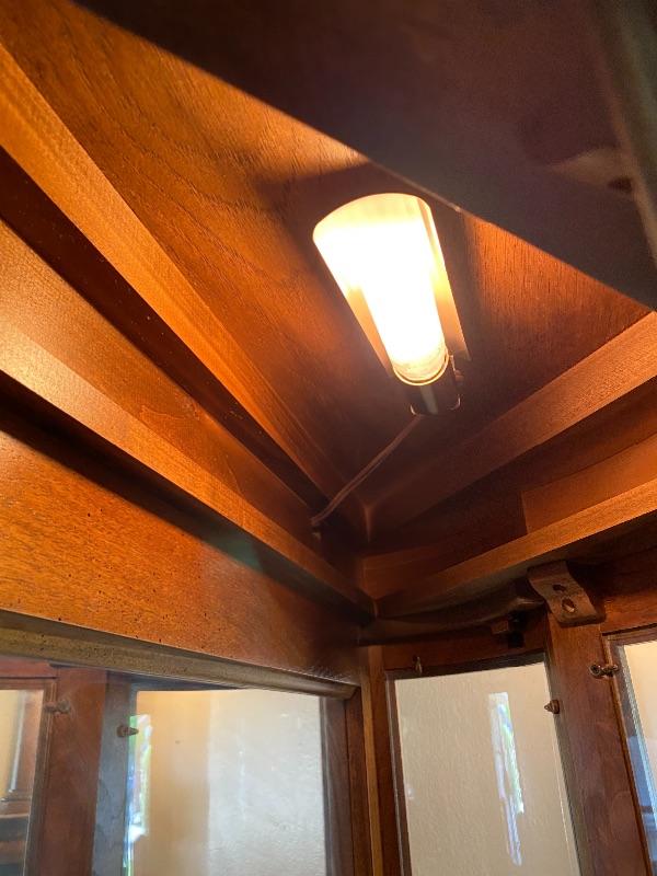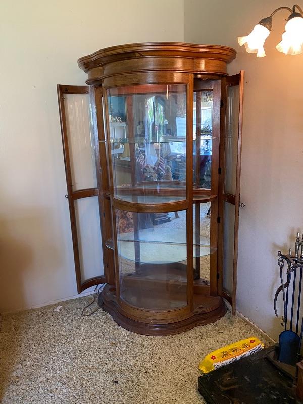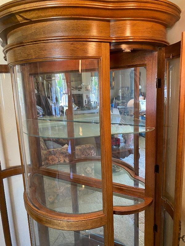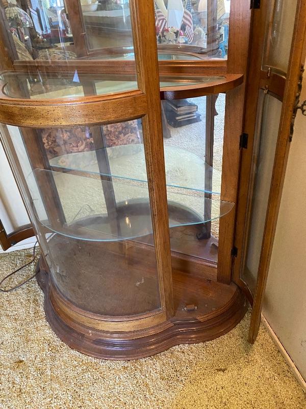 Beautiful mirrored back curved glass curio cabinet. Glass shelves, light inside. Doors open on the side. In good condition. About 6' tall. #030-1031