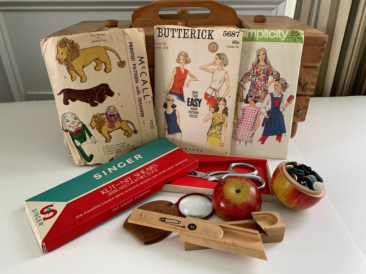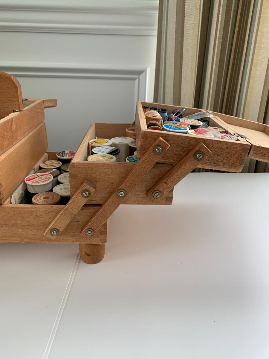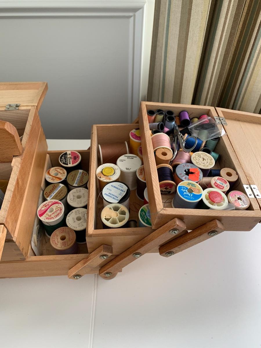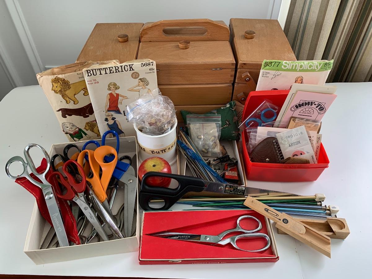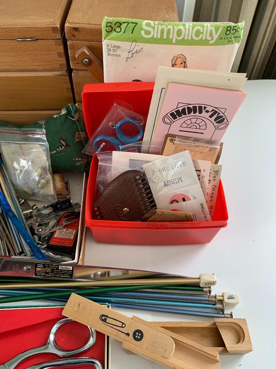 Fold out sewing box filled with sewing notions, Scissors, Knitting & Crochet Needles and more'