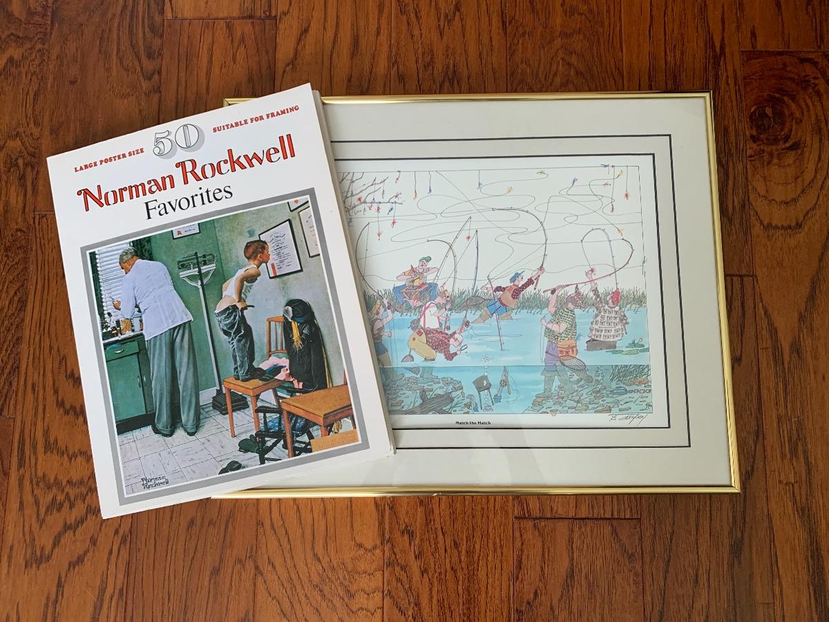 Lot 118: Framed Match the Hatch Print & Norman Rockwell Poster Book