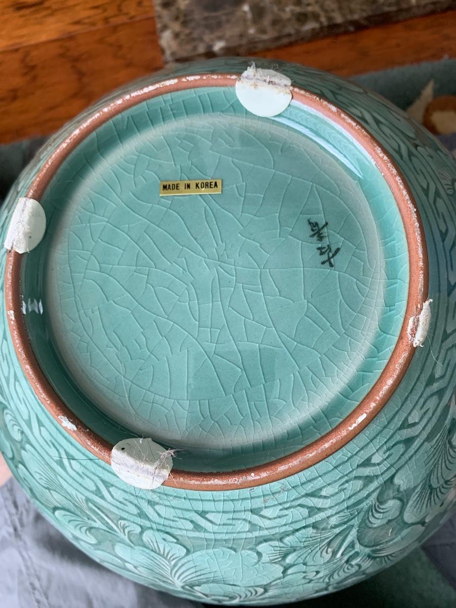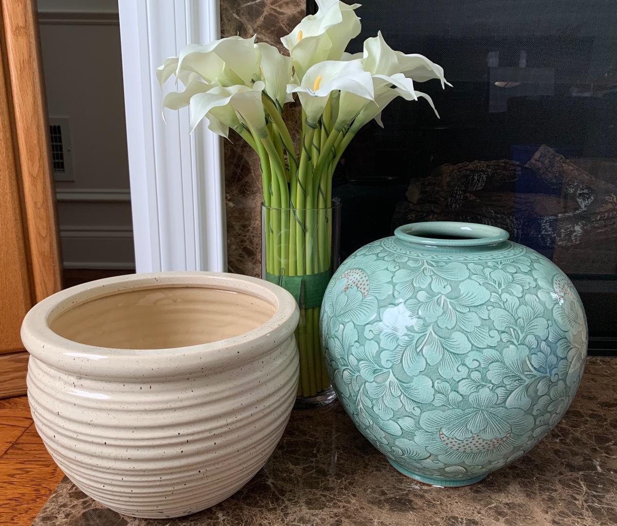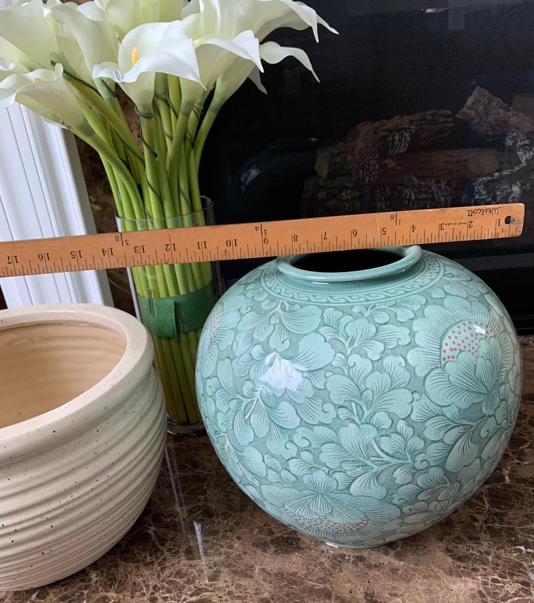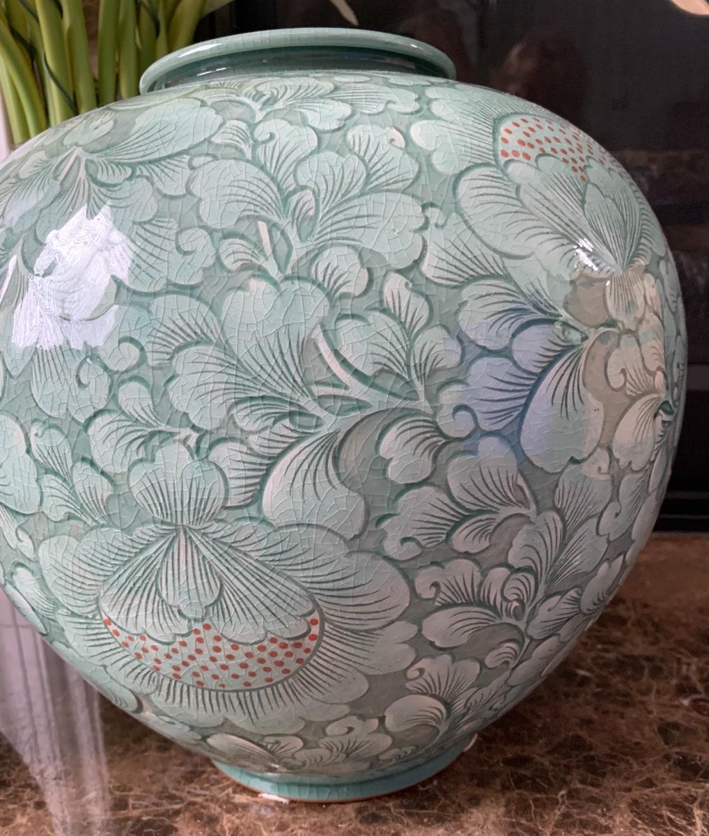Large Mint Green made in Korea planter with Asian Design, faux lillies in vase, and planter.