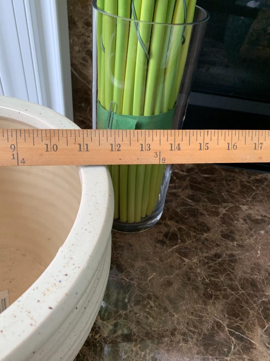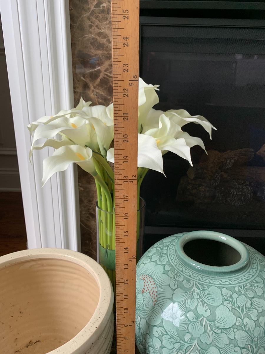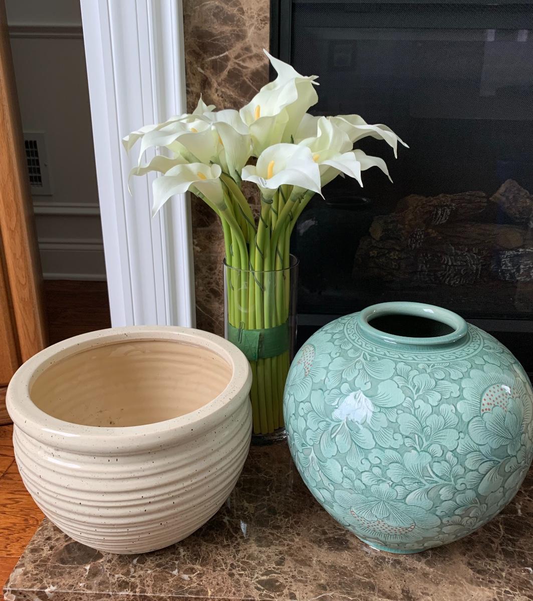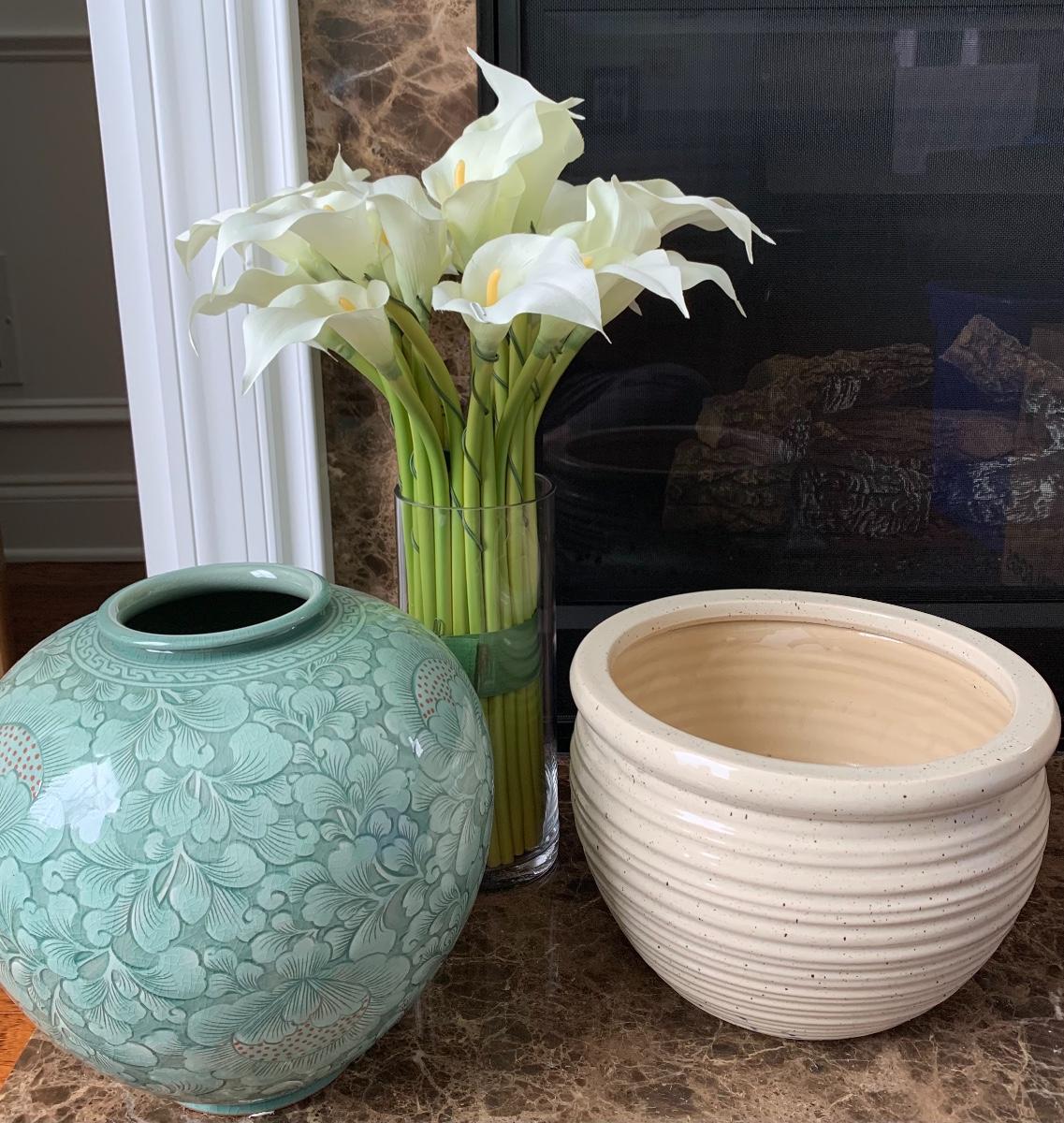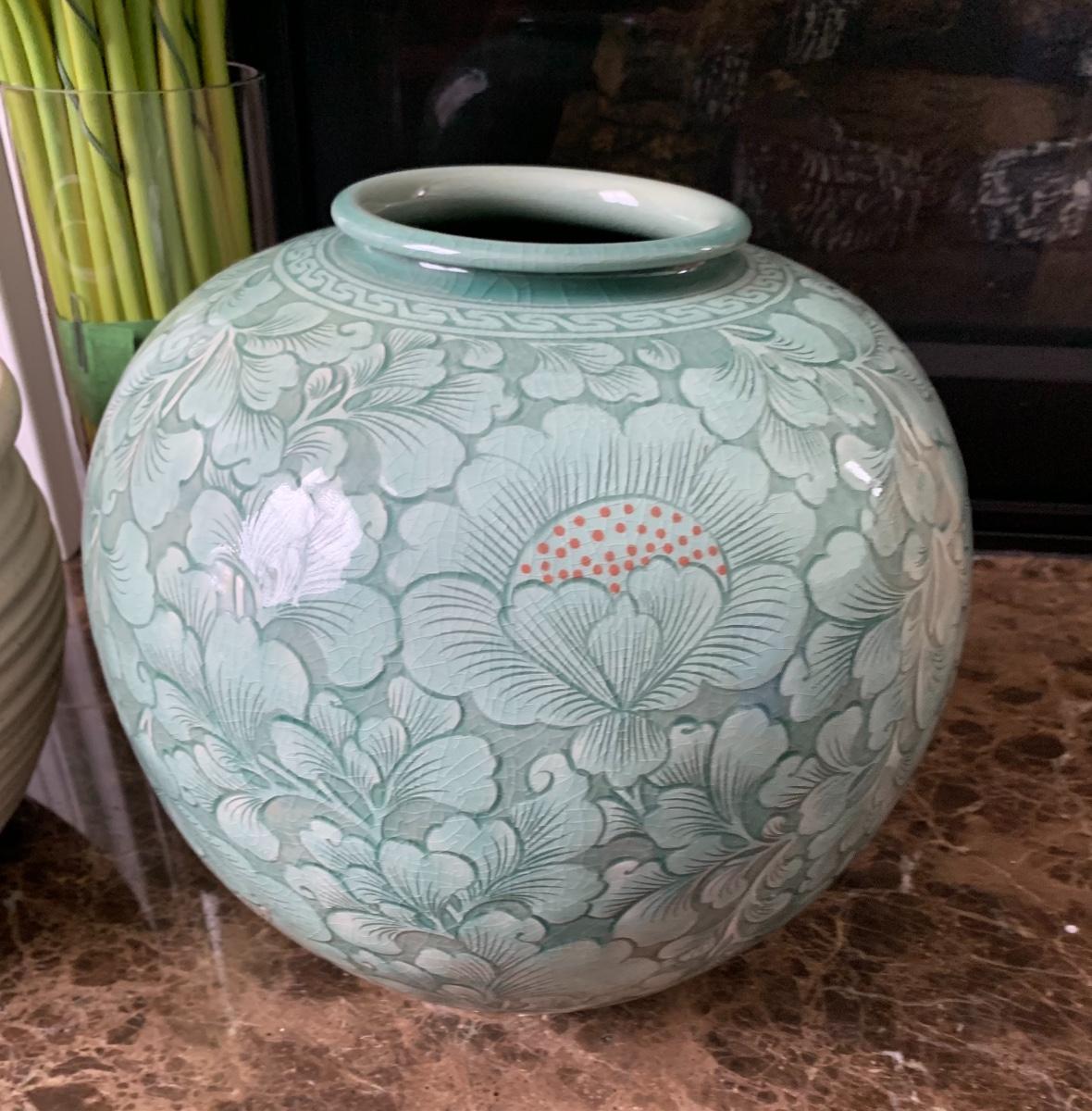 Large Mint Green made in Korea planter with Asian Design, faux lillies in vase, and planter.