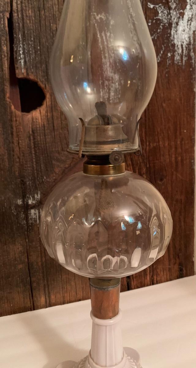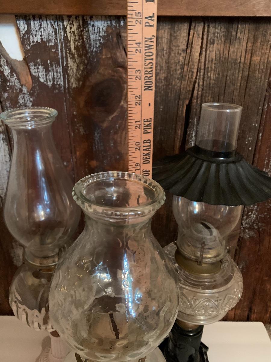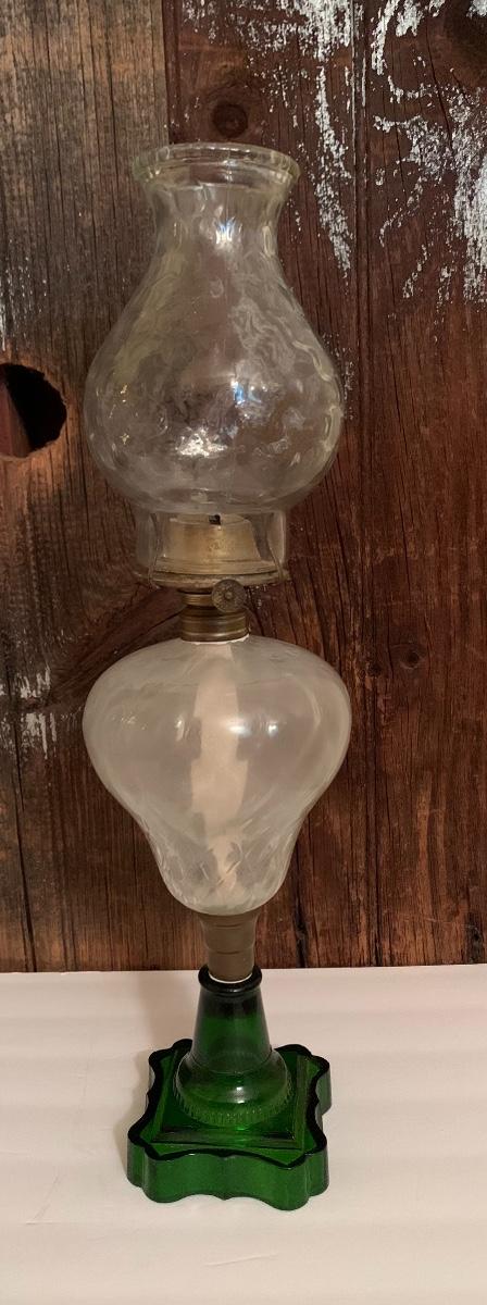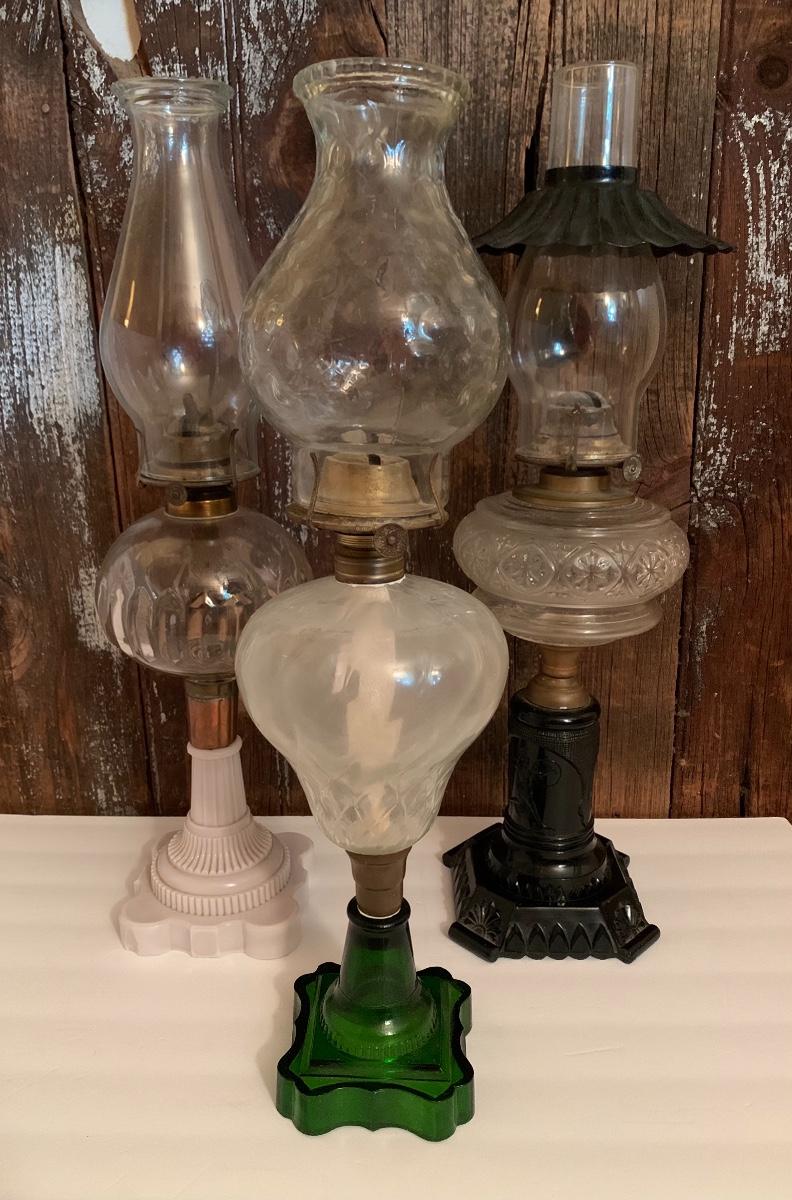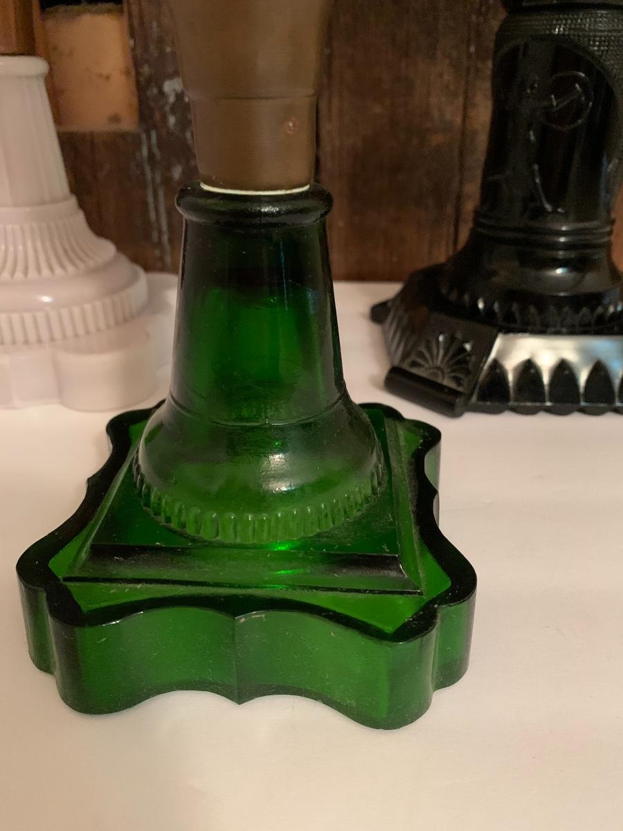 Antique/Vintage green, black and milk glass oil lamps.. More ornate/decorative than the average oil lamp.