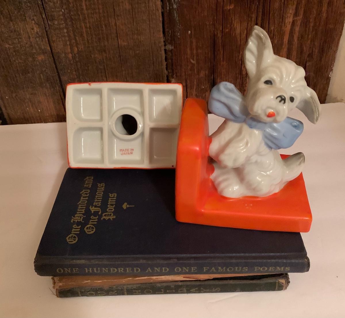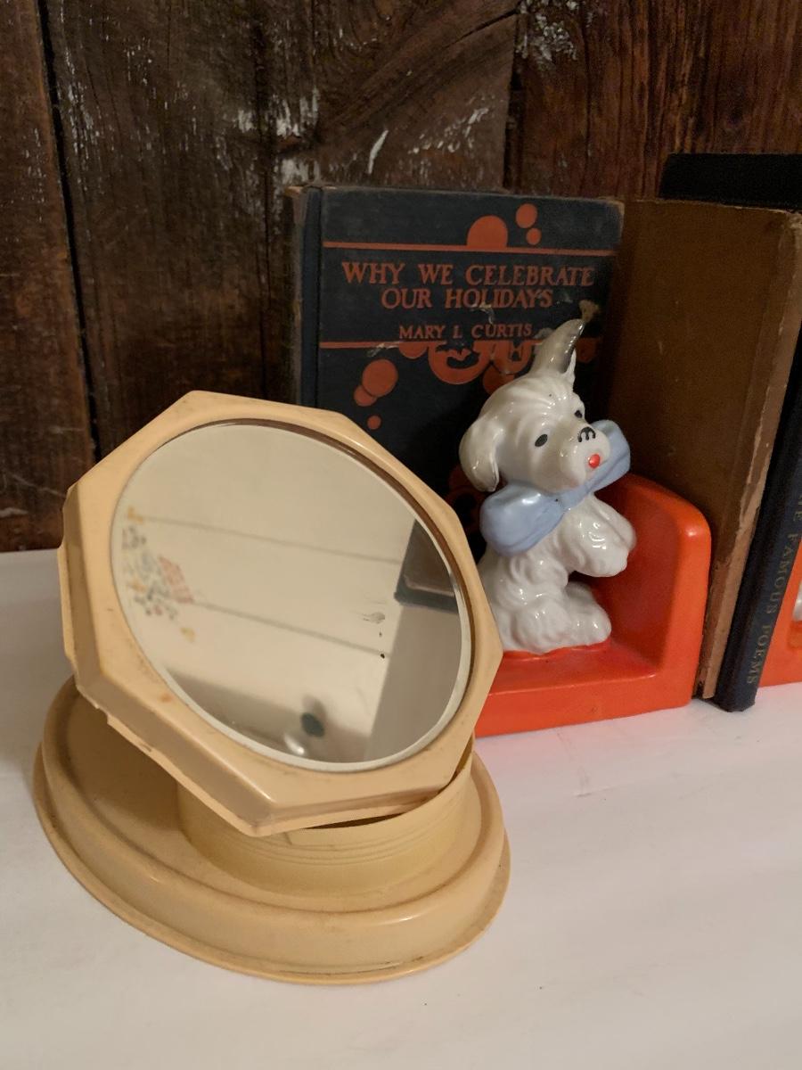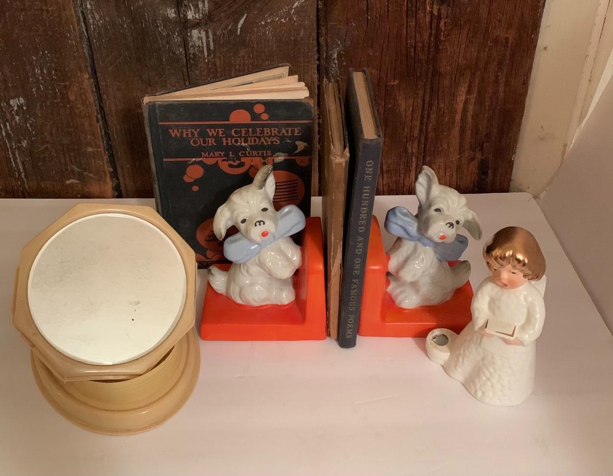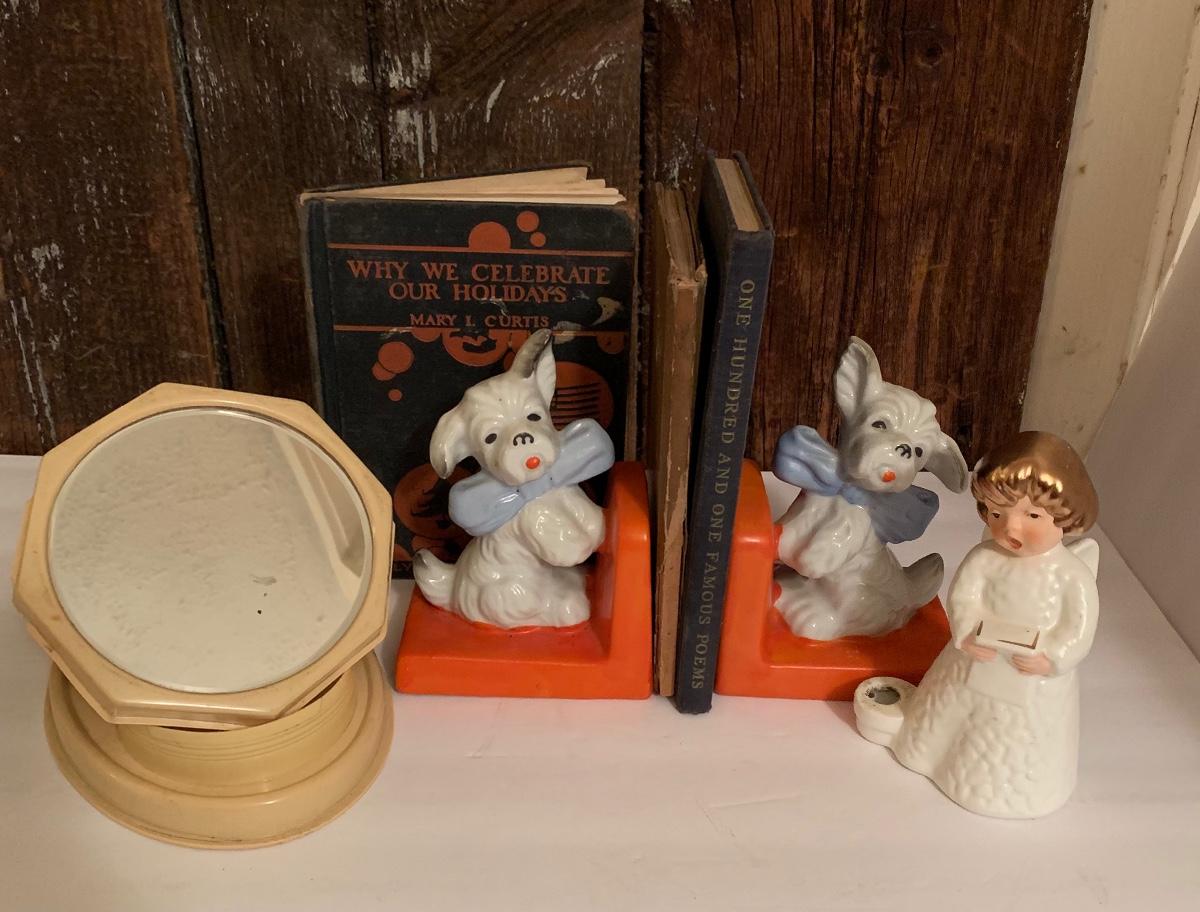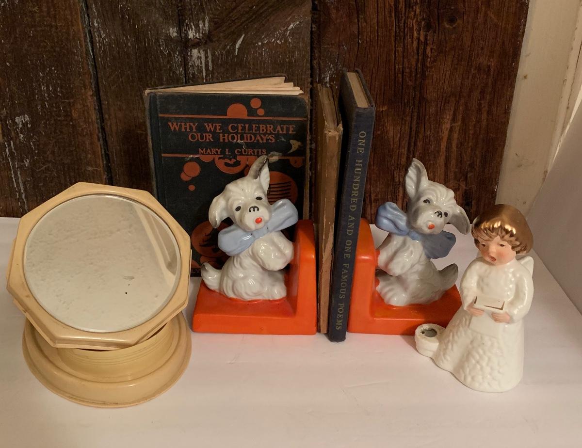 Vintage Japan Scottish Terrier ceramic bookends Goebel Angel with Gold Hair Candle Holder. Vintage books. Plastic dresser Mirror. Please see all pictures for content of the lot, condition of the lot, and measurements if taken. Pictures are the best representation of the items listed and items are untested unless indicated in description. Thank you for looking and have fun bidding!