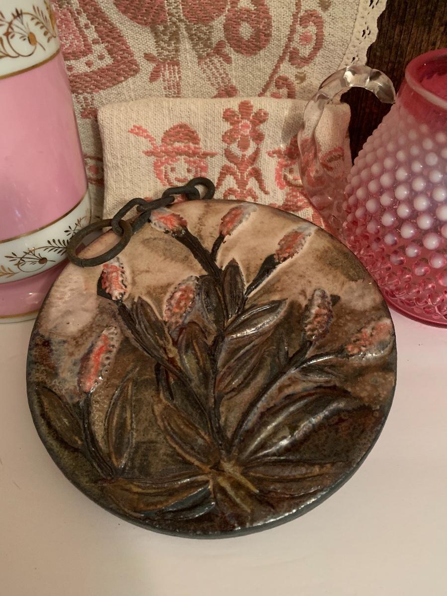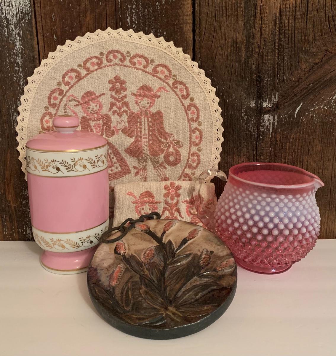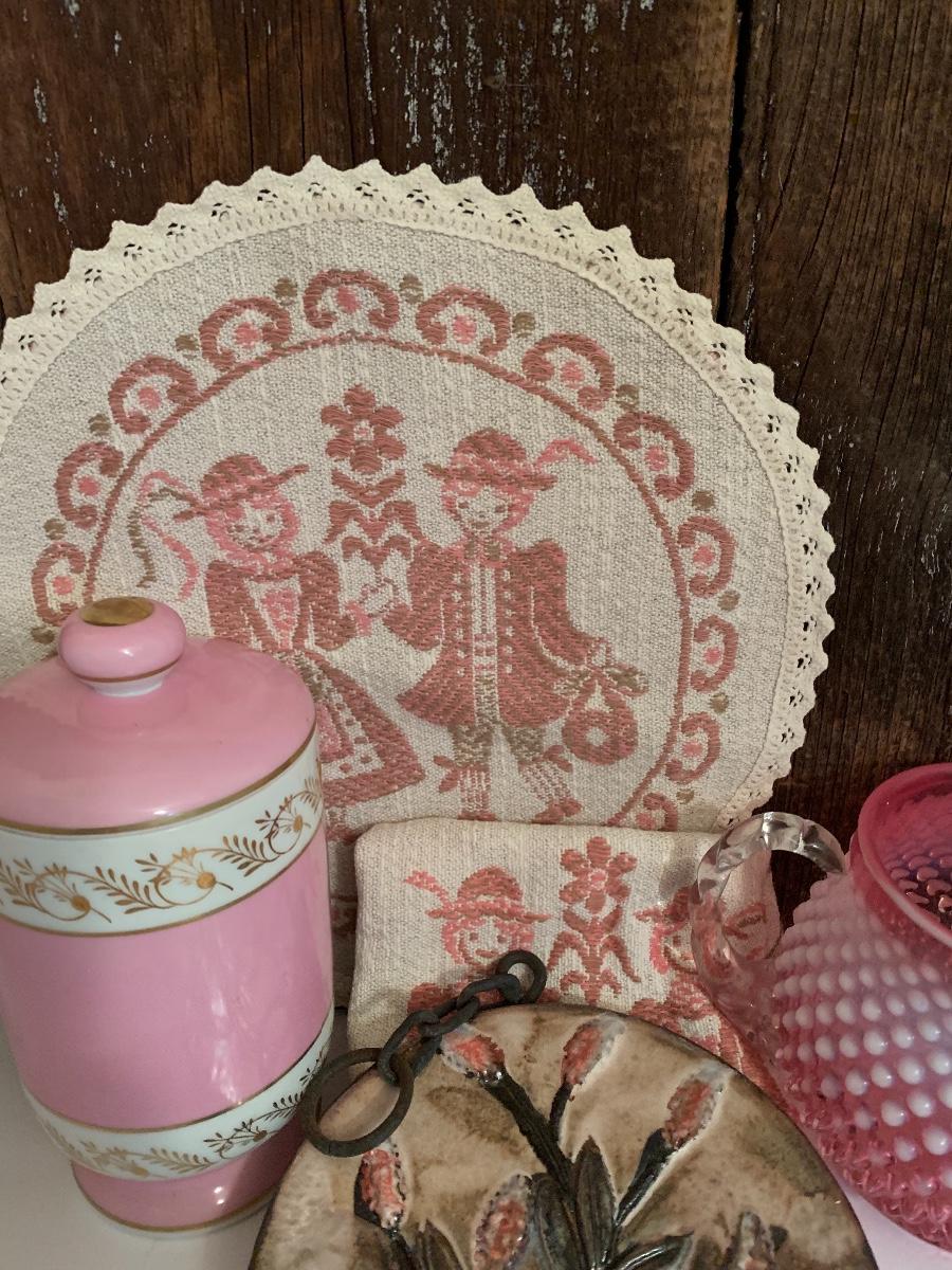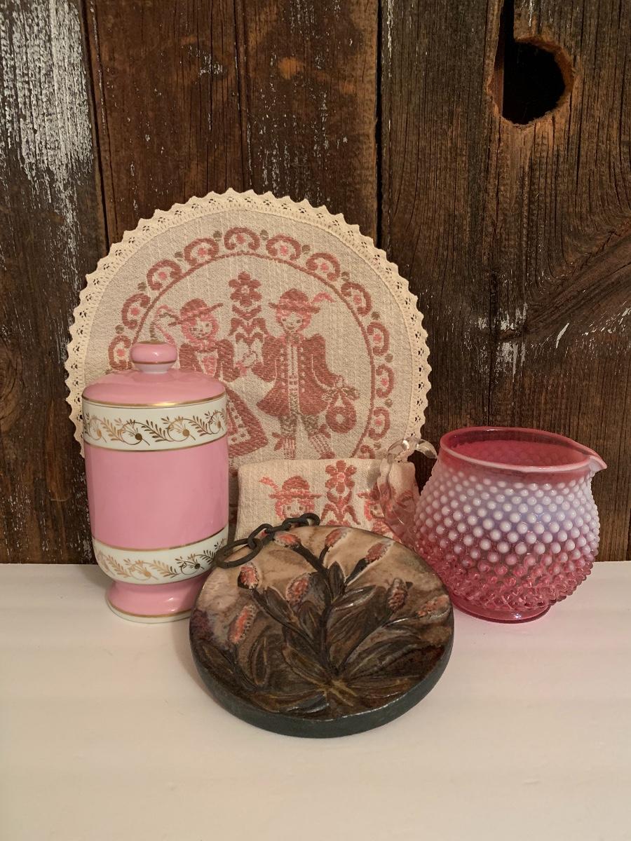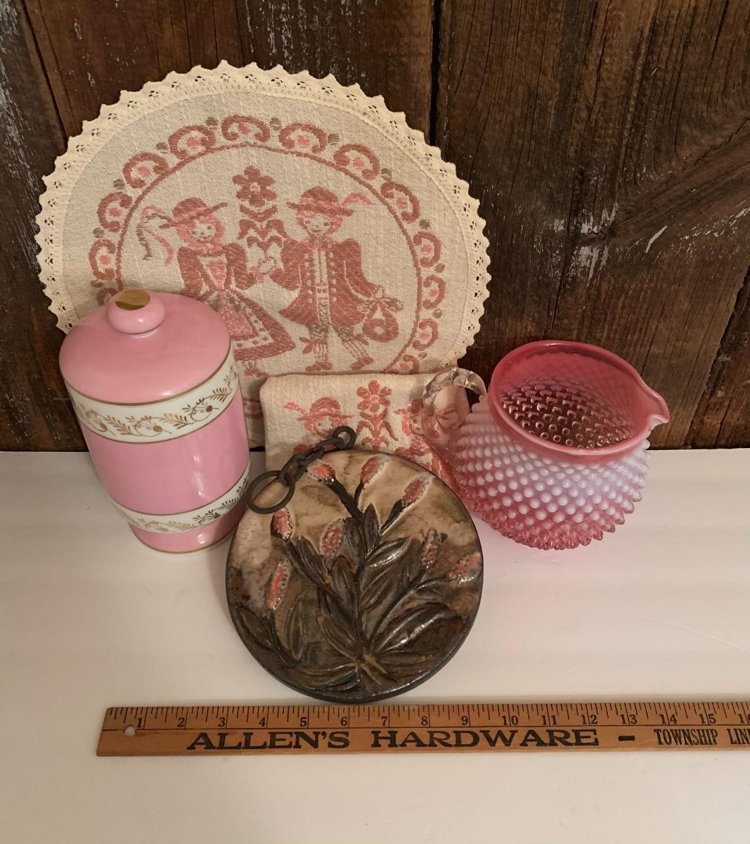 Vintage Fabric Doilies, Plaster Floral Wall Hanging, Hobnail Pitcher and Pink Jar.