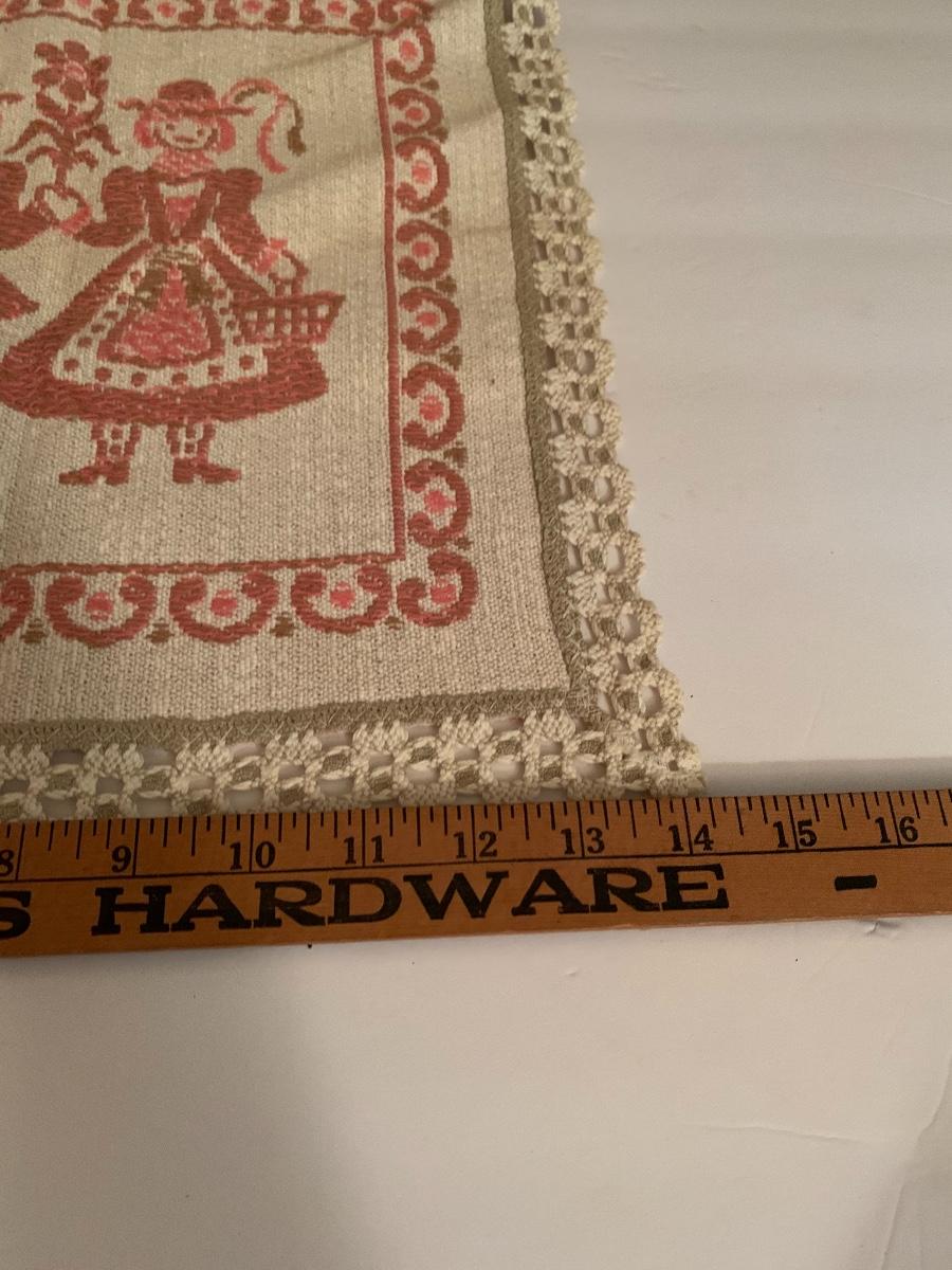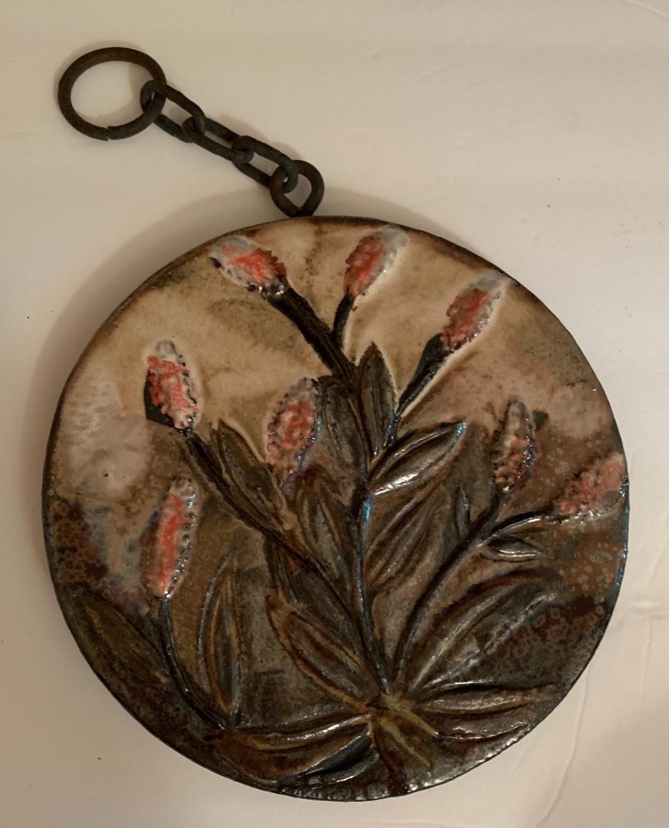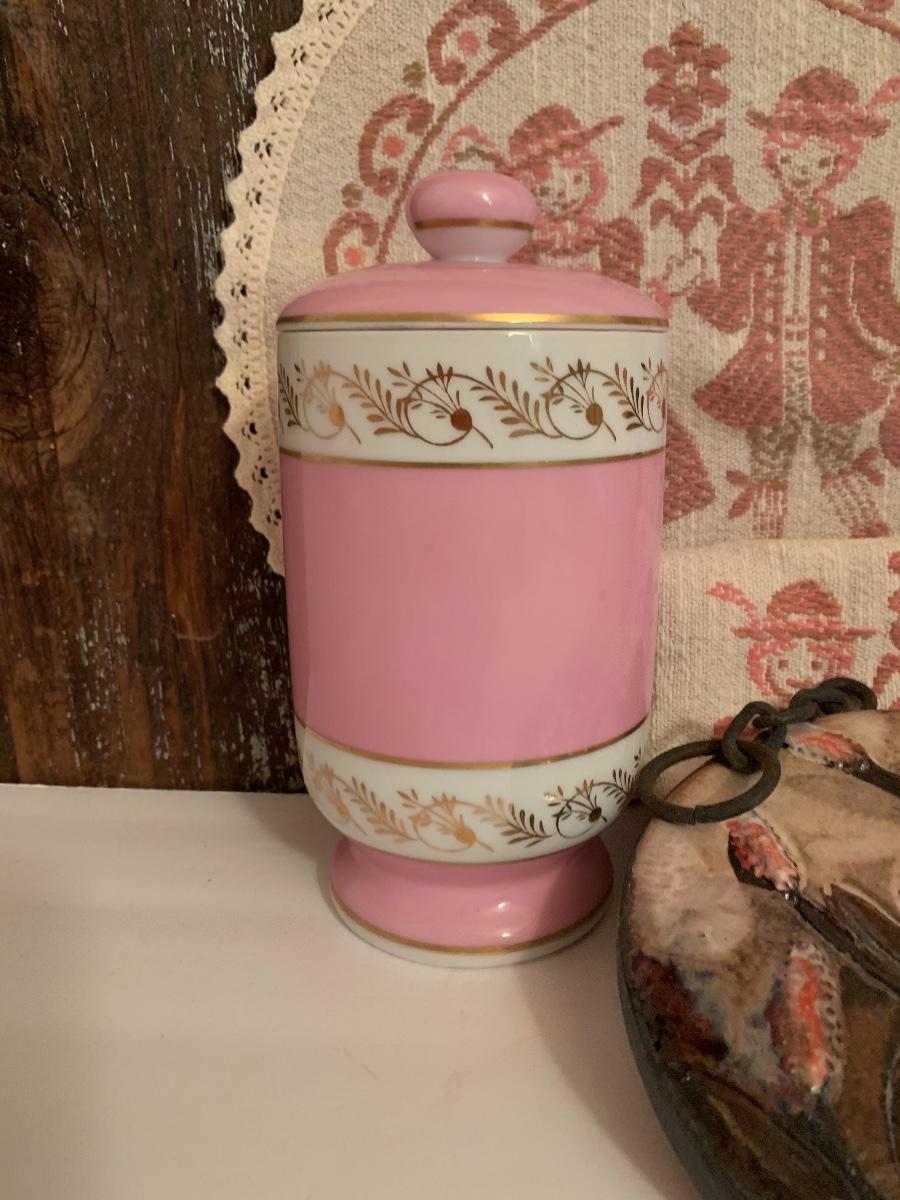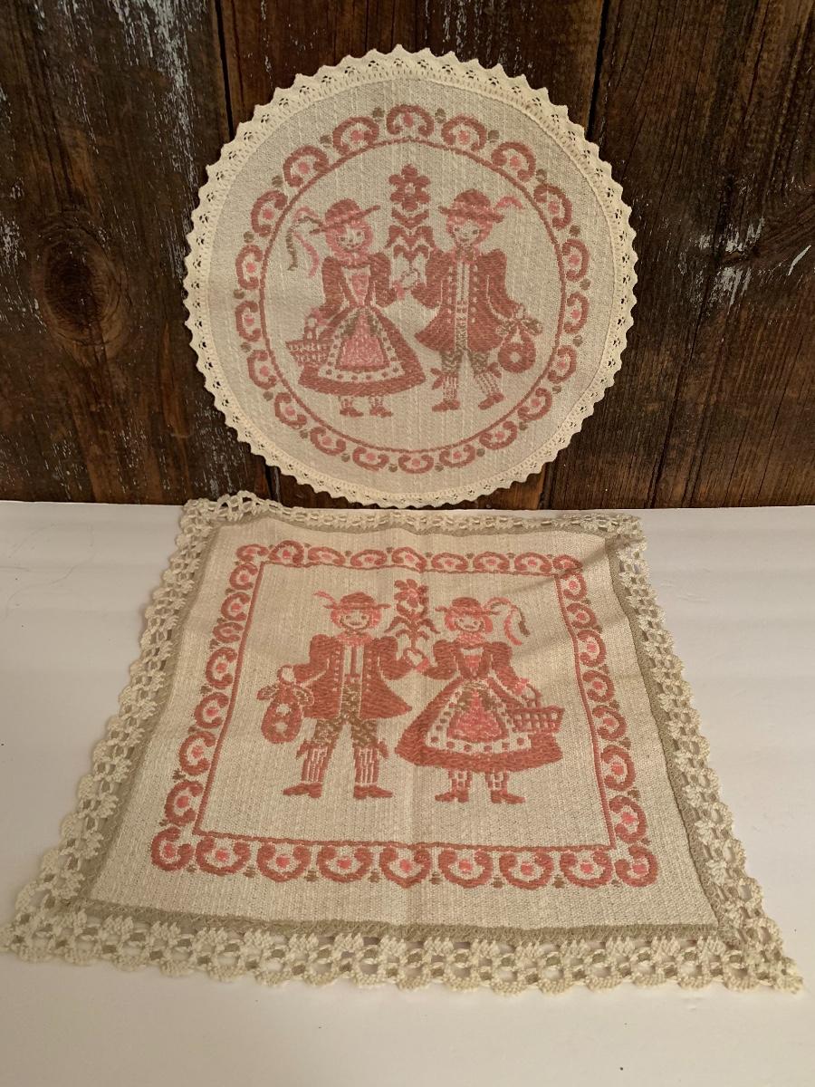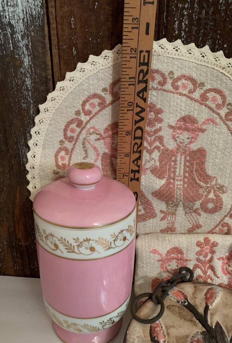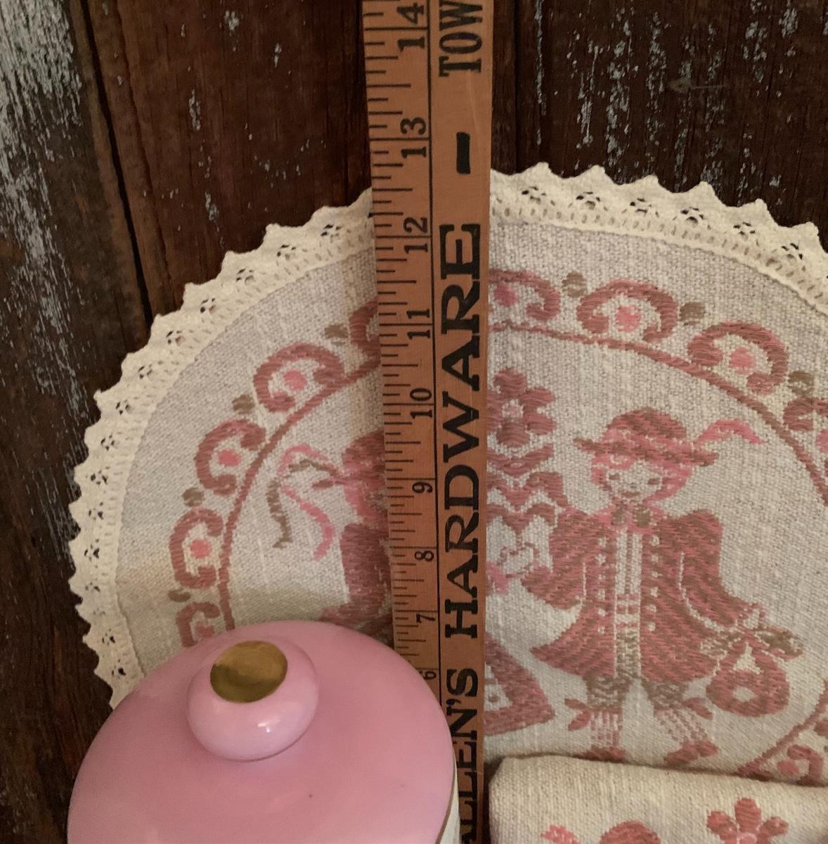 Vintage Fabric Doilies, Plaster Floral Wall Hanging, Hobnail Pitcher and Pink Jar.