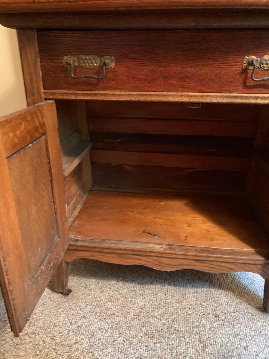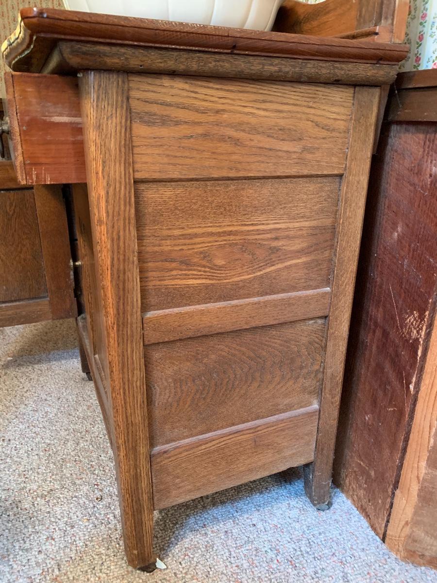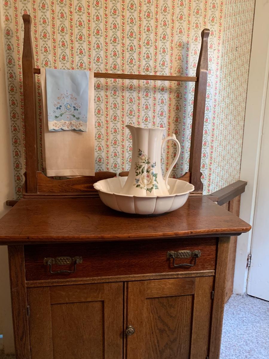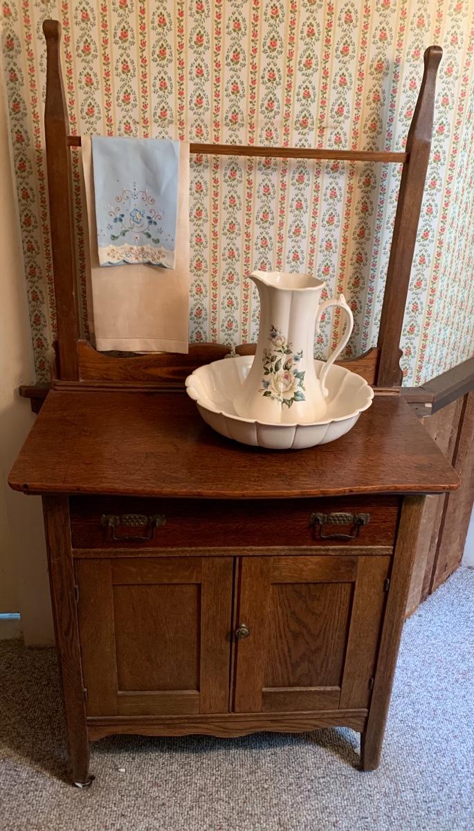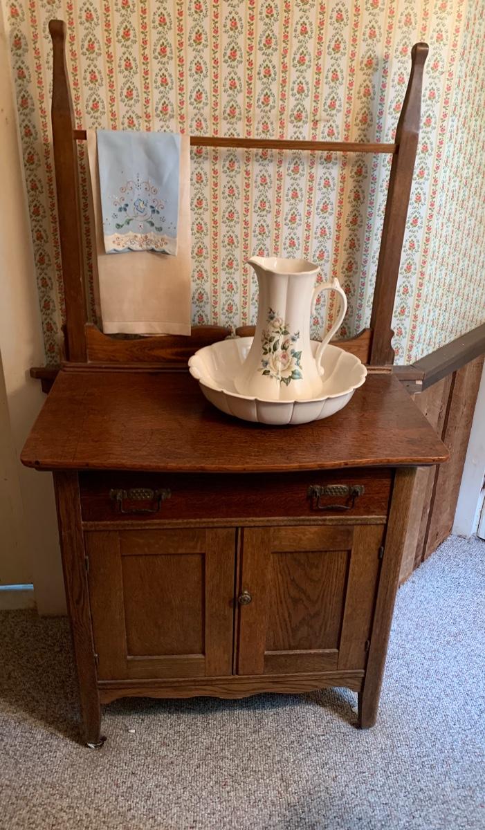 Vintage Oak Washstand along with Handmade Pitcher & Bowl Set.