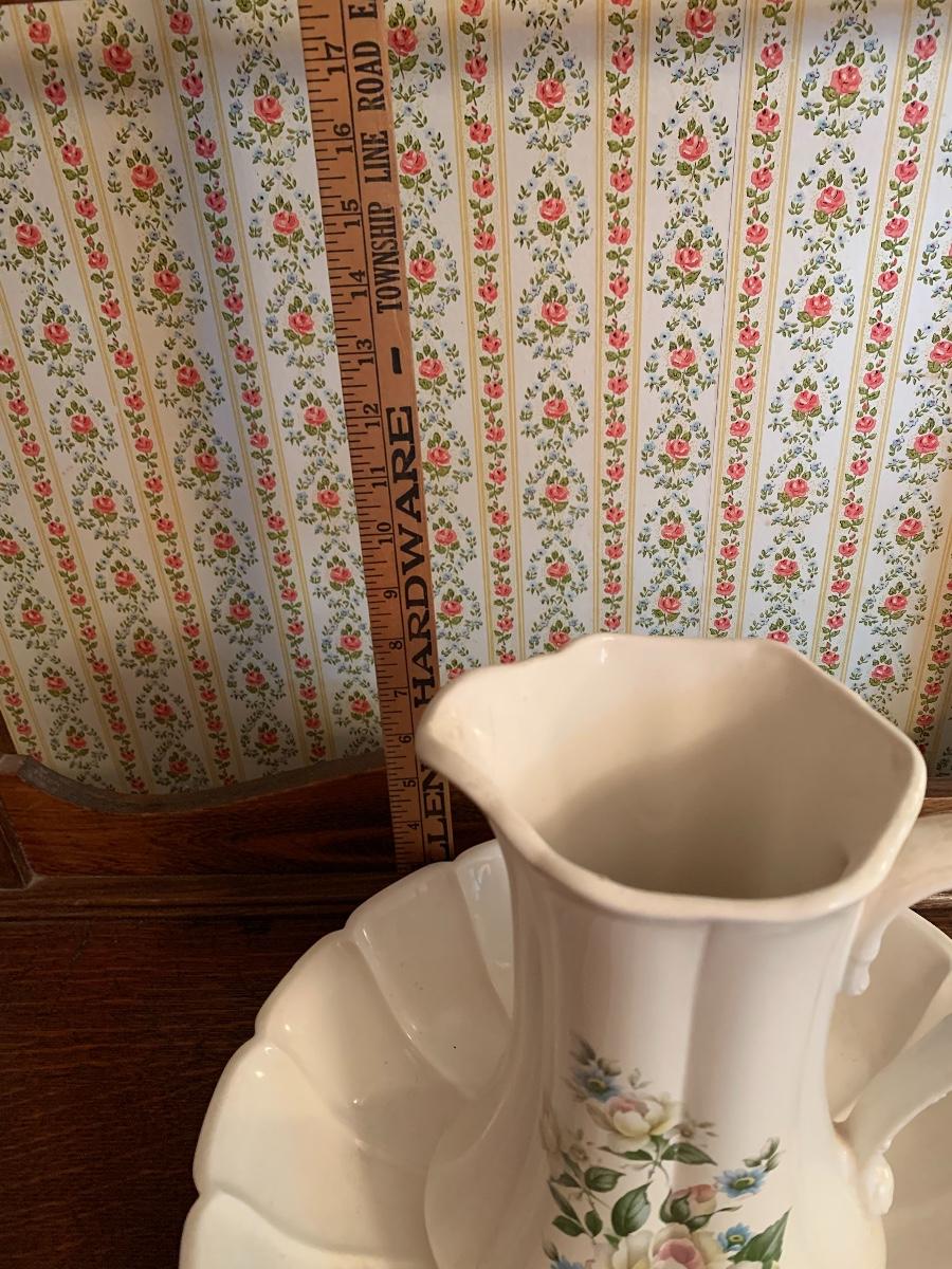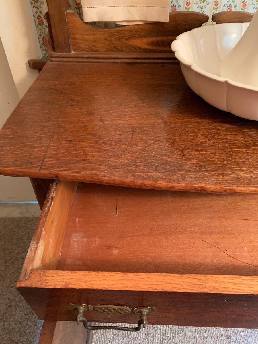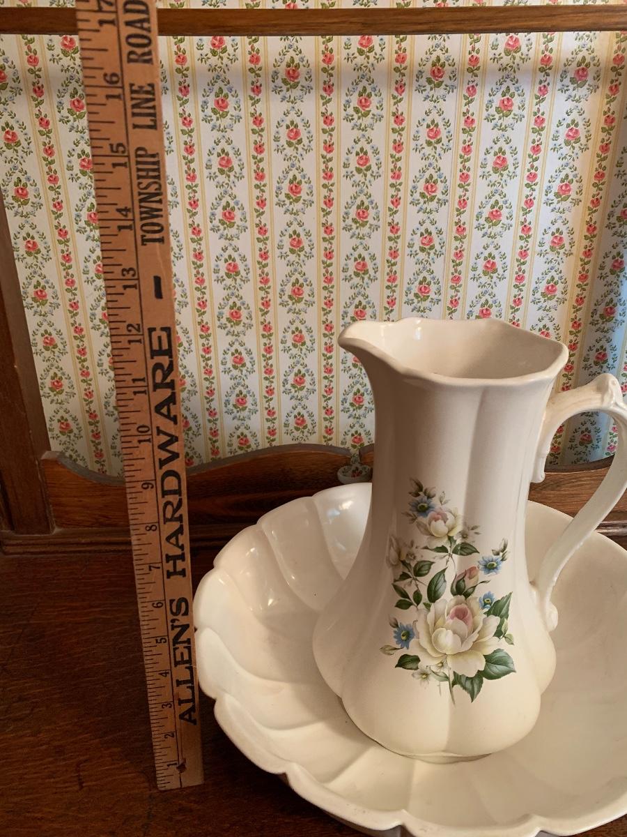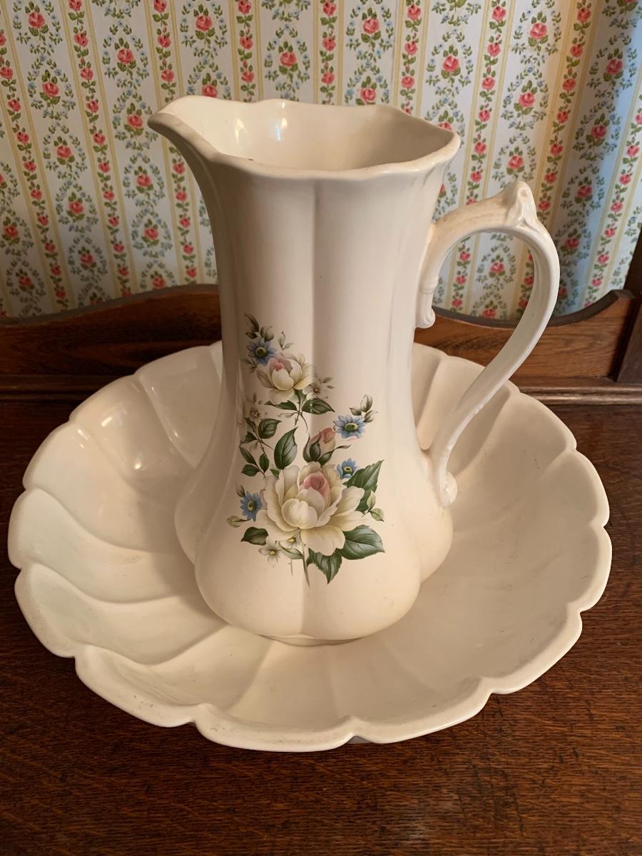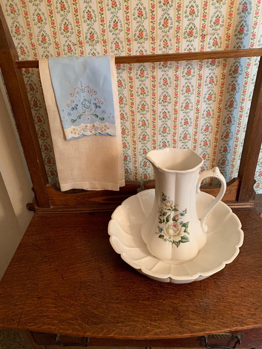 Vintage Oak Washstand along with Handmade Pitcher & Bowl Set.