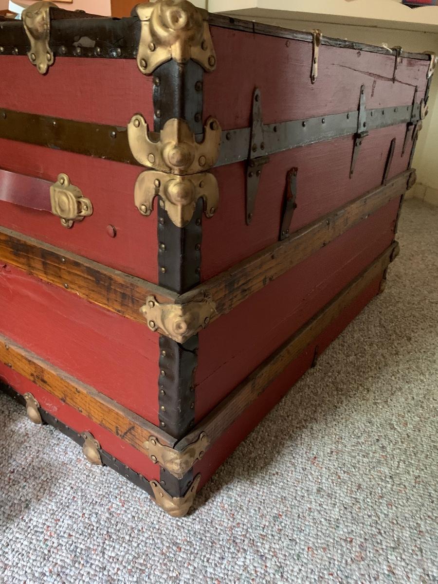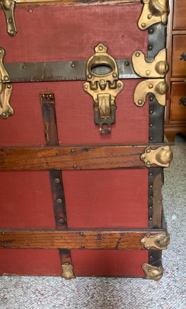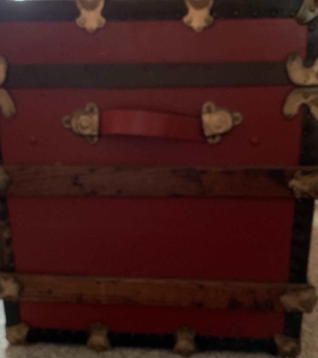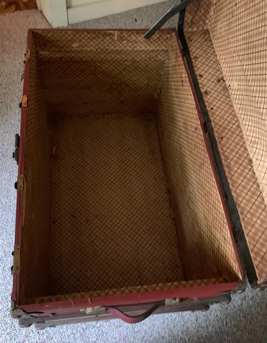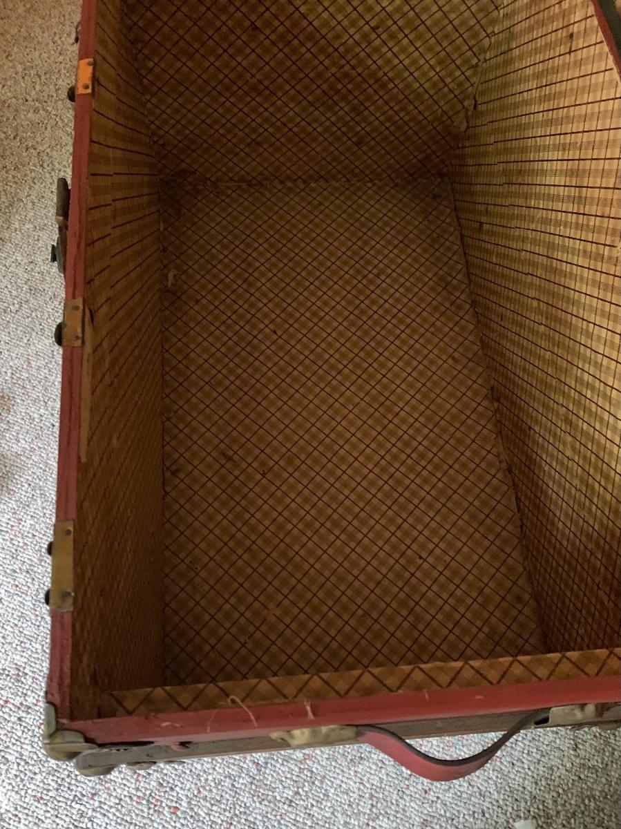 34 x 20 x 22 trunk in a beautiful color, Exterior appears to be in very good shape - interior condition. is ok (see pictures) The exterior wood frame is gorgeous and the color pops against the brass colored findings.