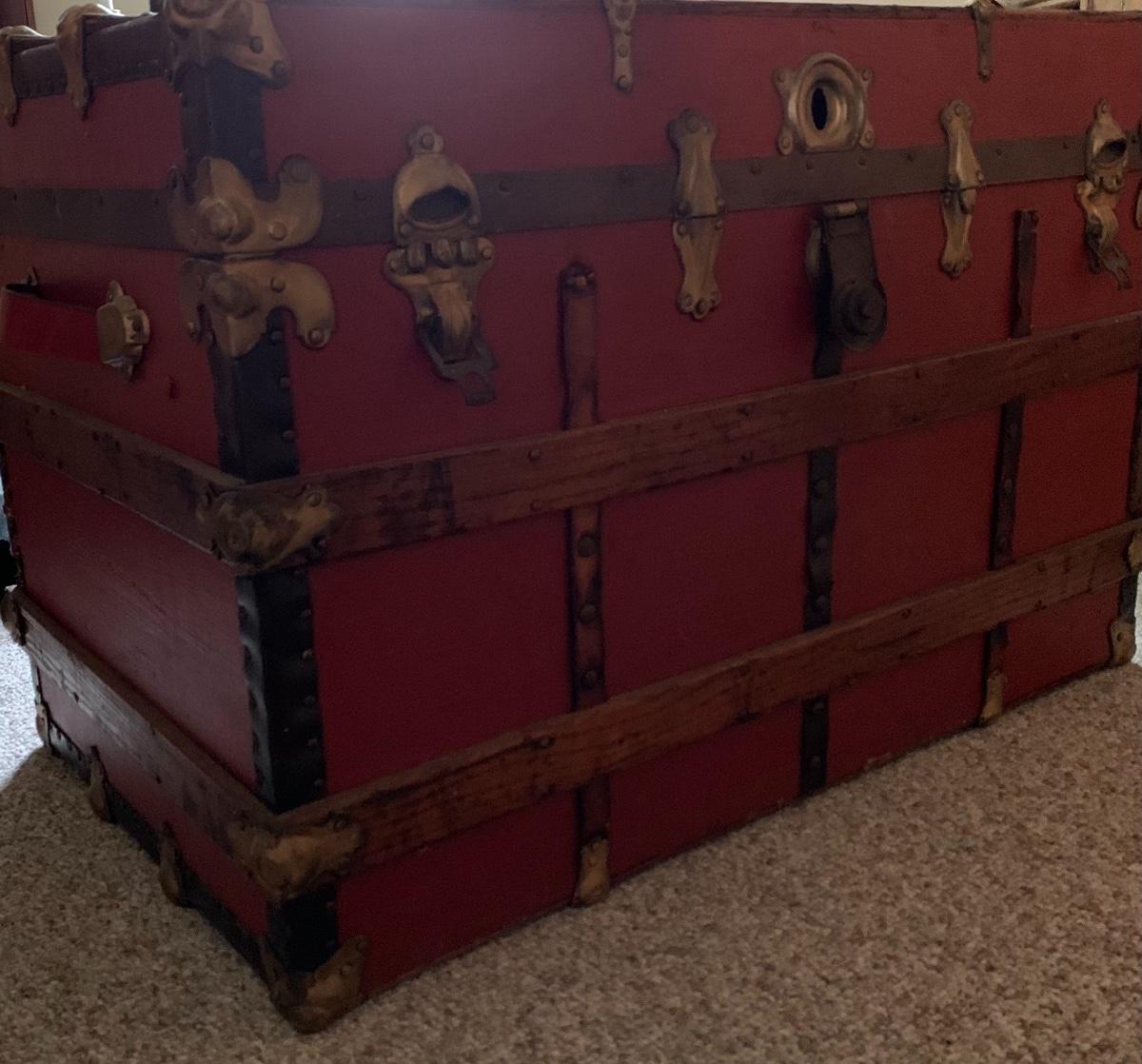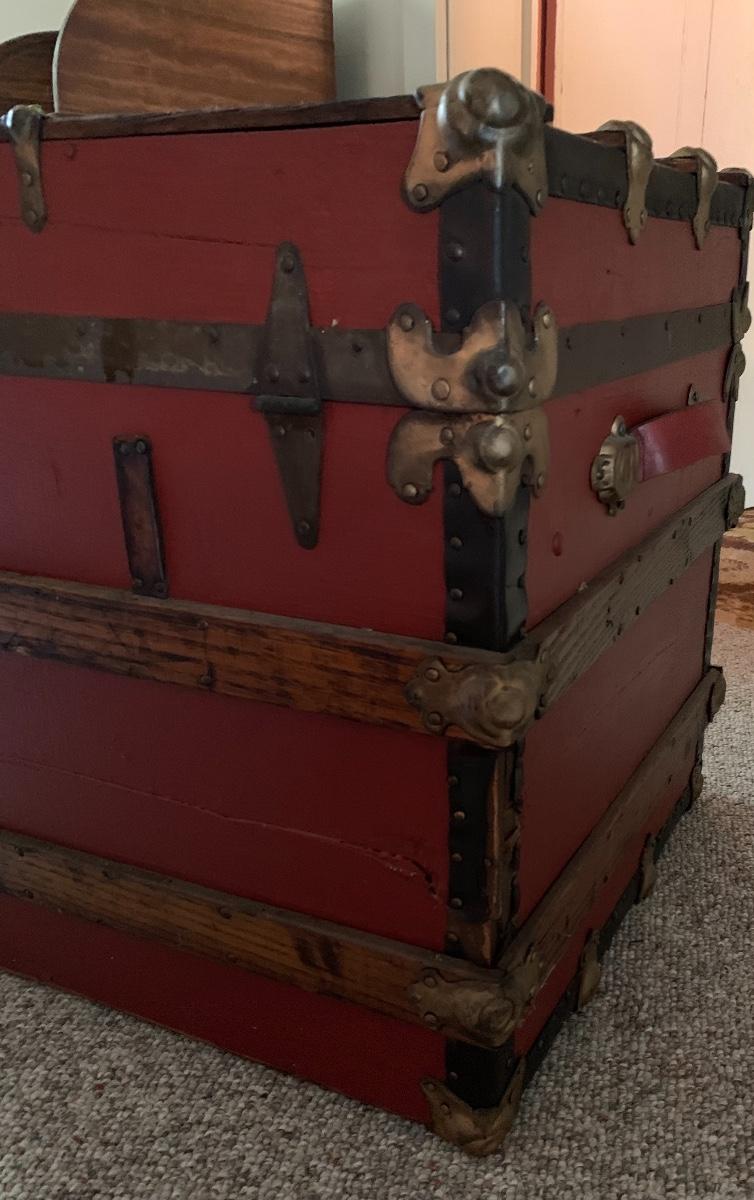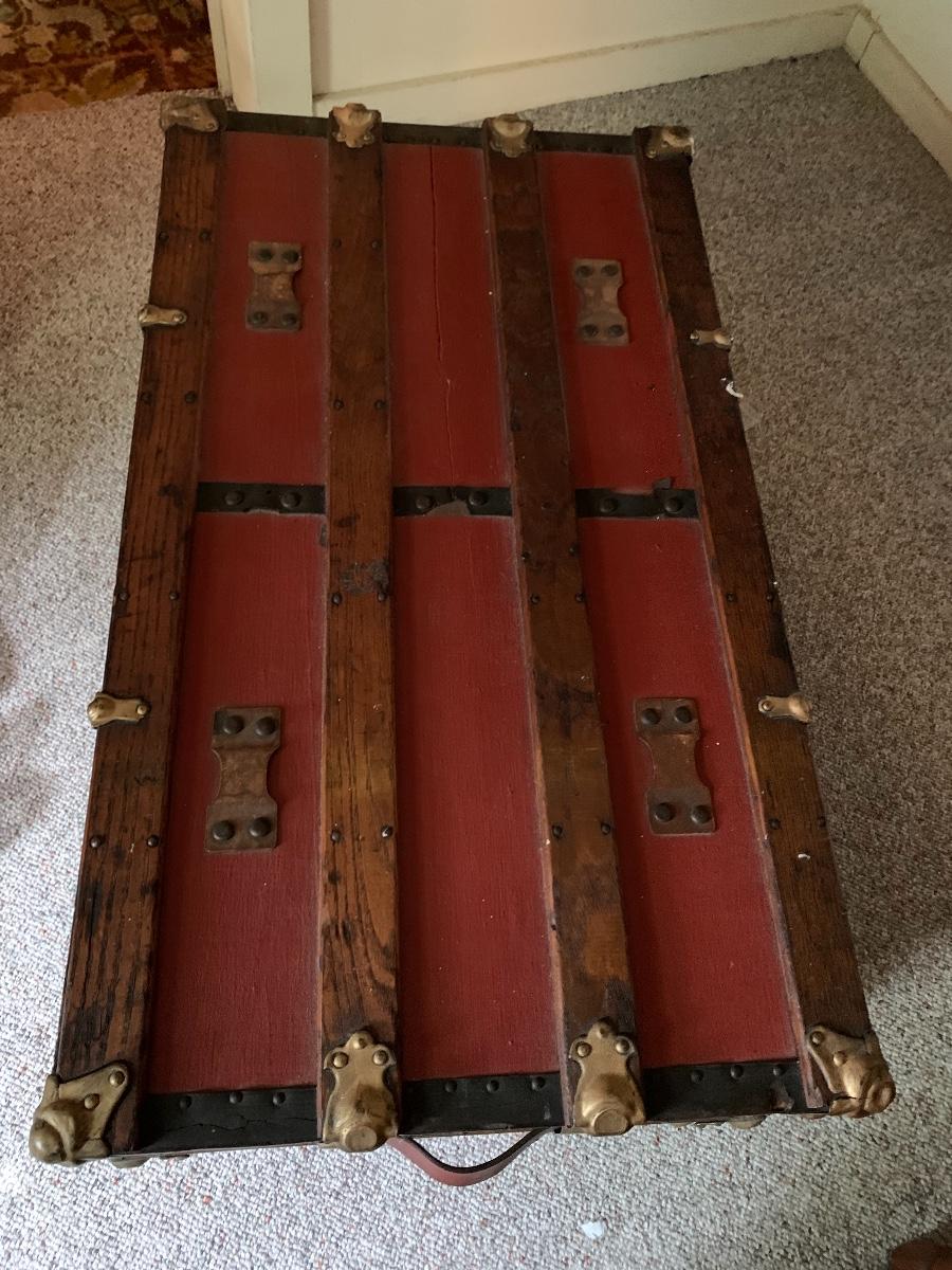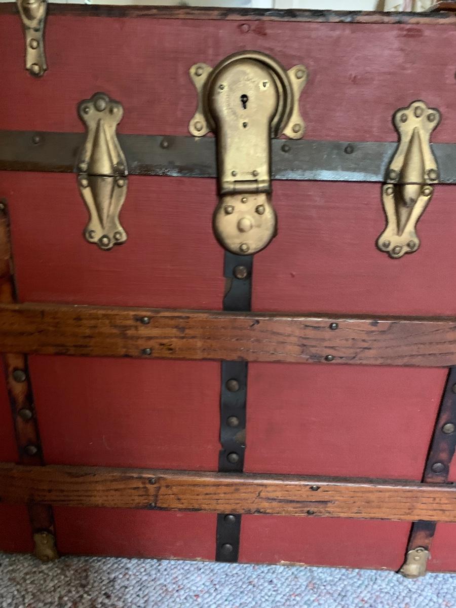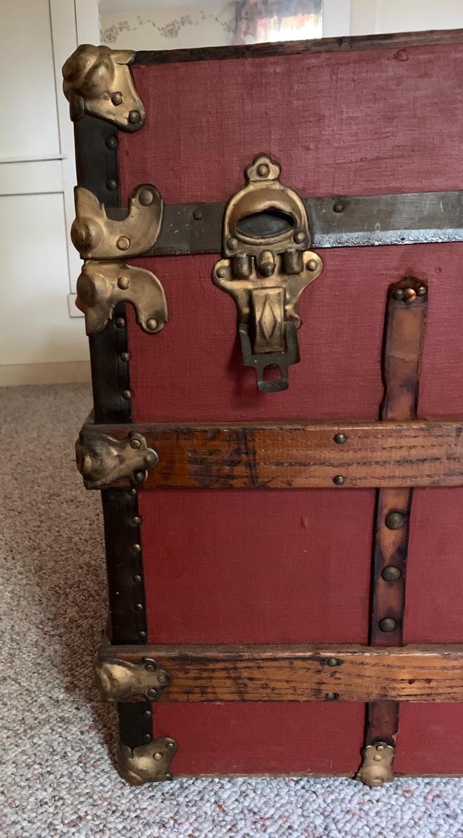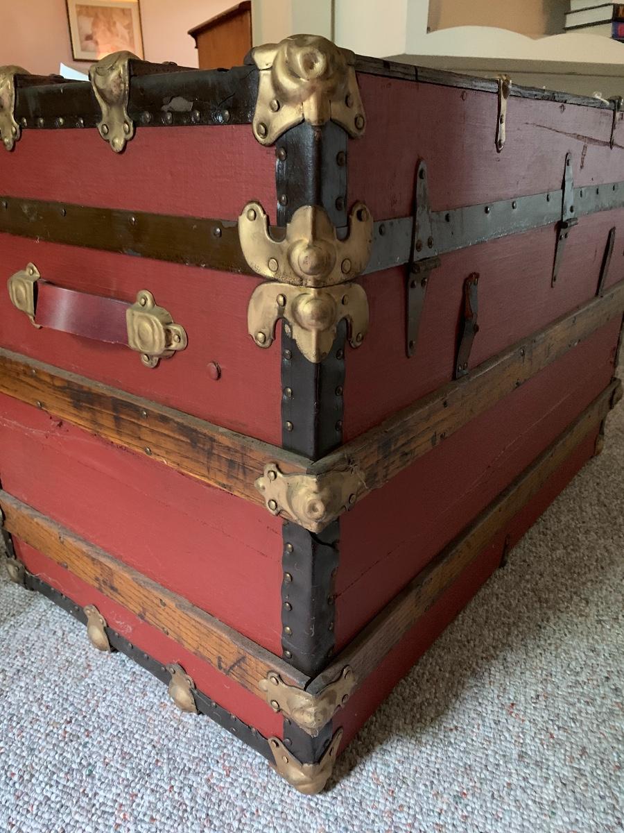 34 x 20 x 22 trunk in a beautiful color, Exterior appears to be in very good shape - interior condition. is ok (see pictures) The exterior wood frame is gorgeous and the color pops against the brass colored findings.