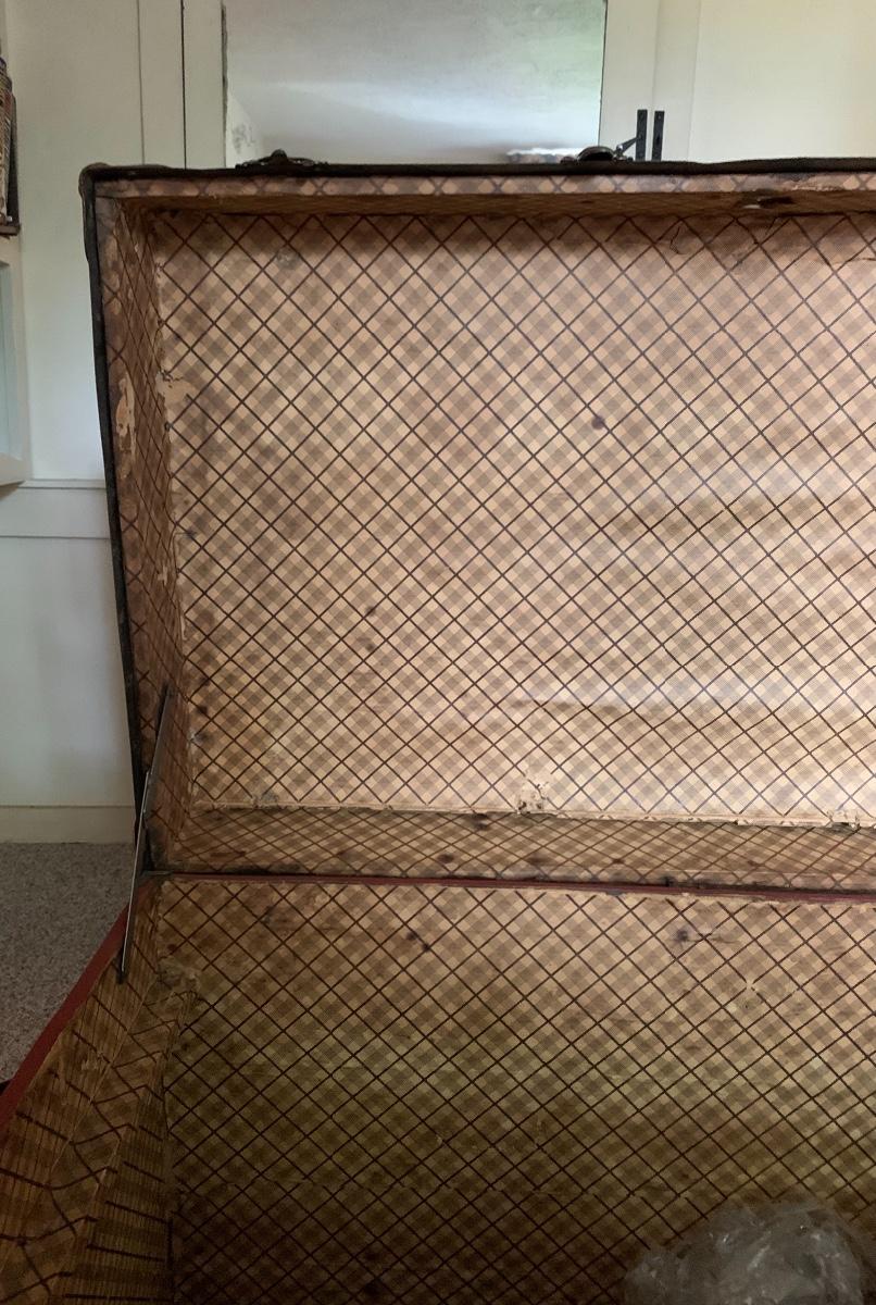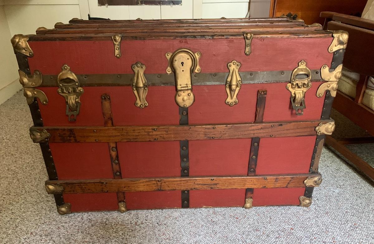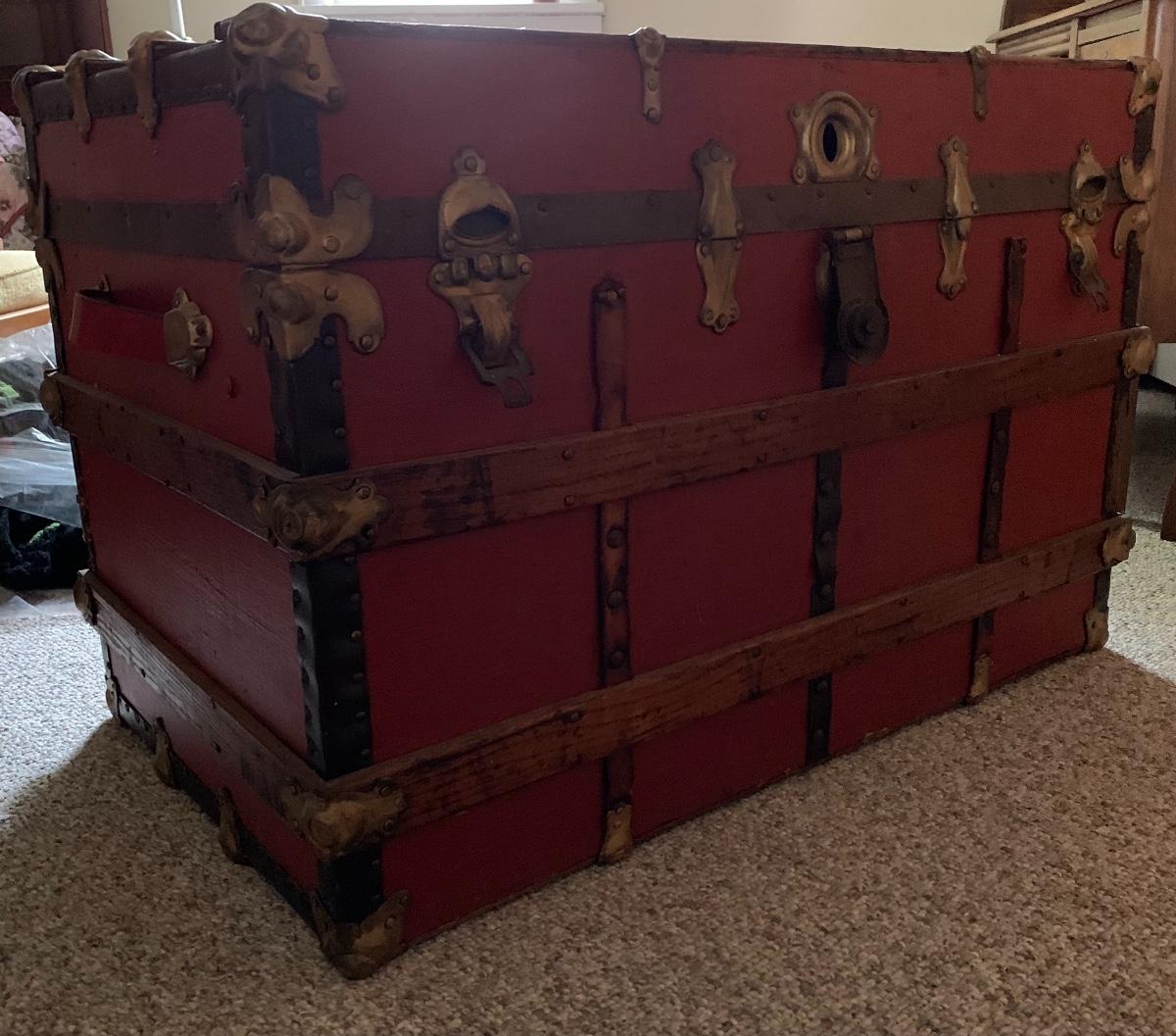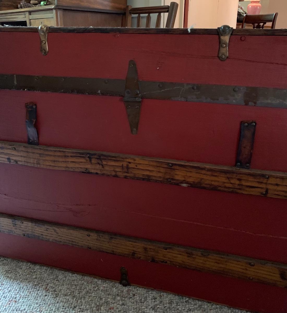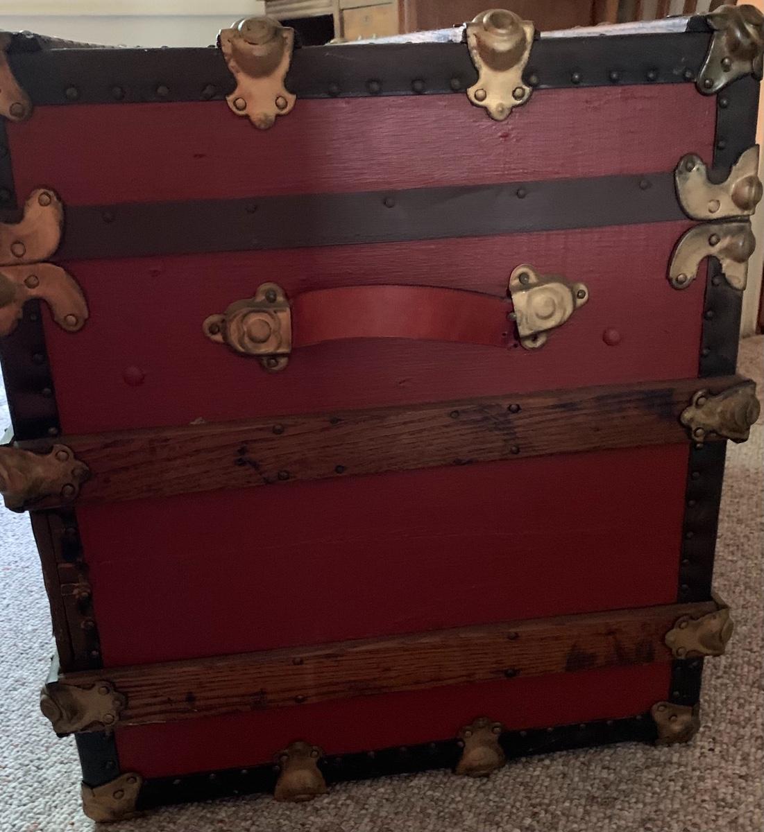 34 x 20 x 22 trunk in a beautiful color, Exterior appears to be in very good shape - interior condition. is ok (see pictures) The exterior wood frame is gorgeous and the color pops against the brass colored findings.