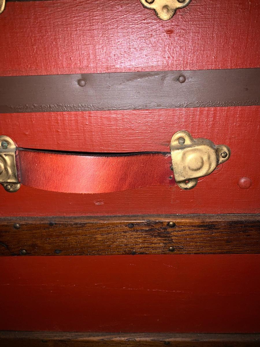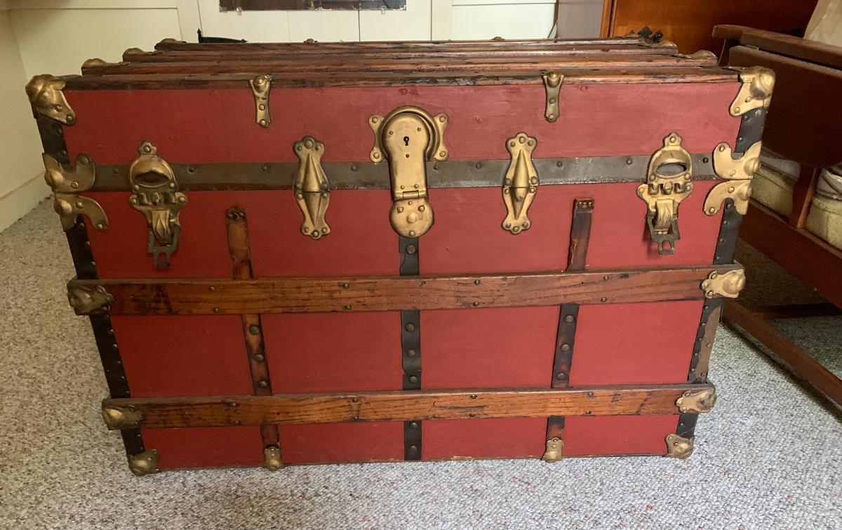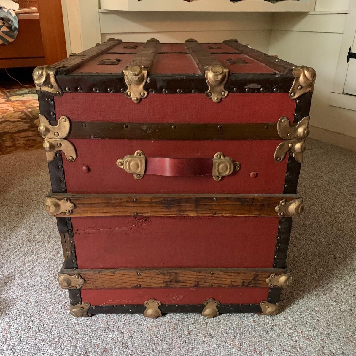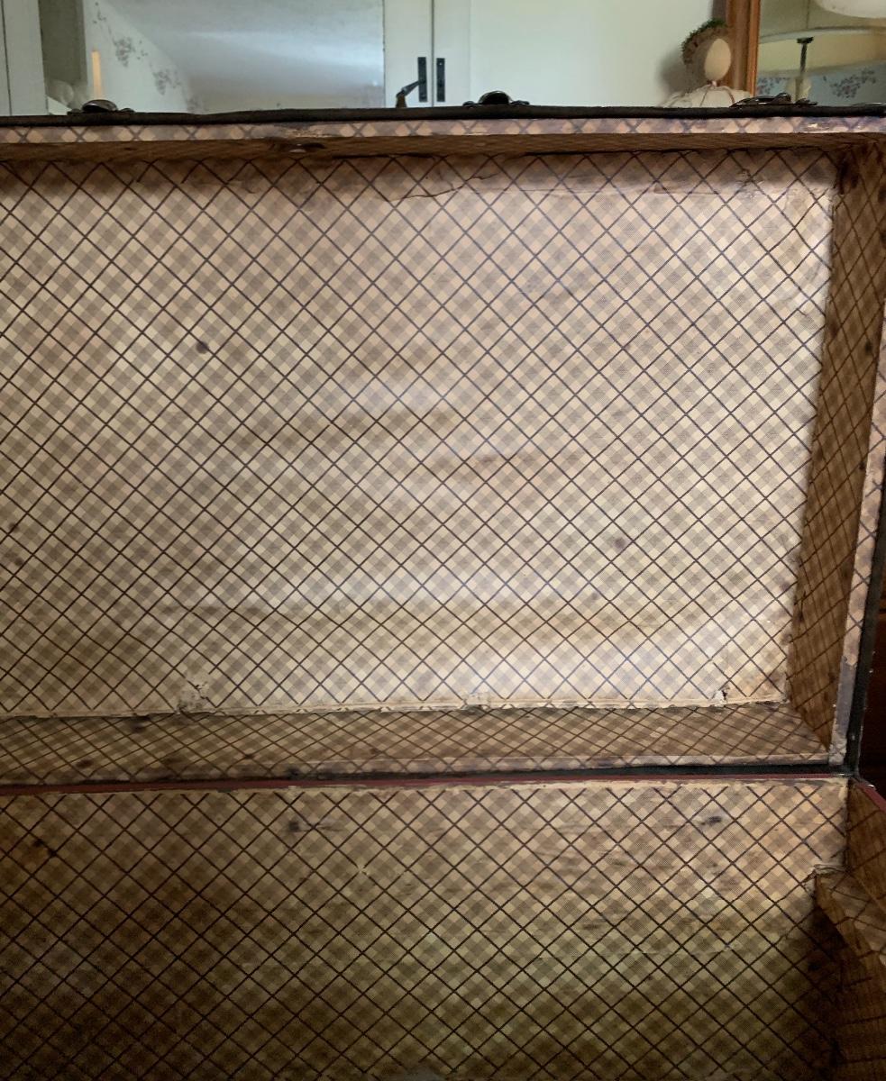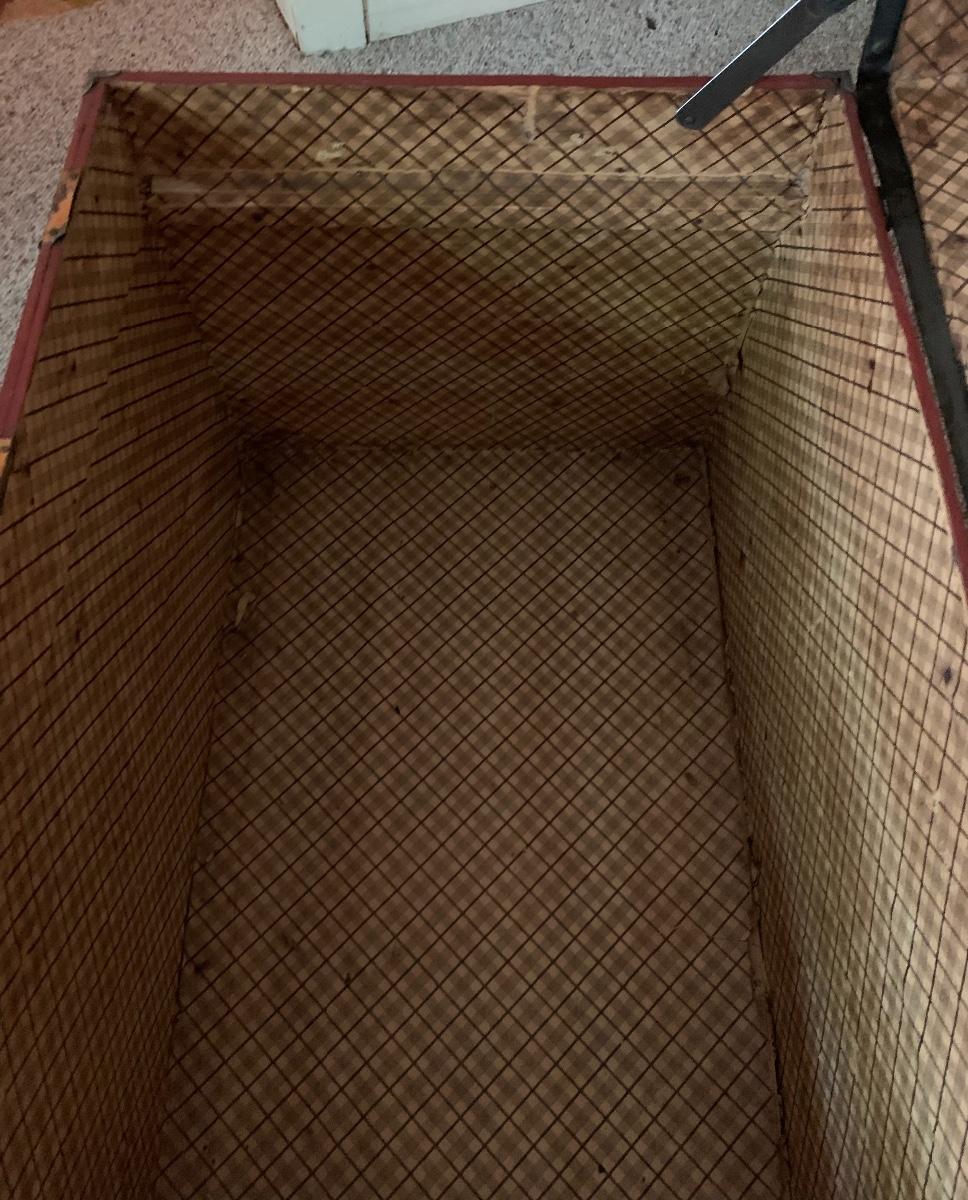 34 x 20 x 22 trunk in a beautiful color, Exterior appears to be in very good shape - interior condition. is ok (see pictures) The exterior wood frame is gorgeous and the color pops against the brass colored findings.