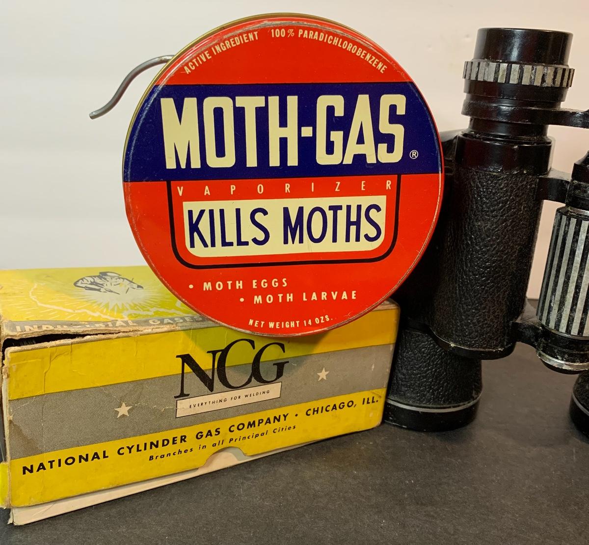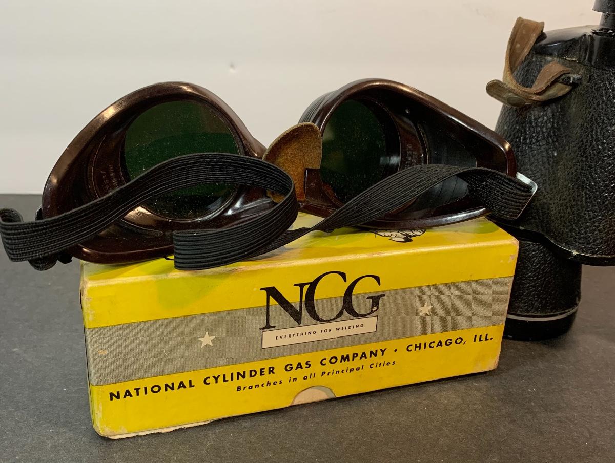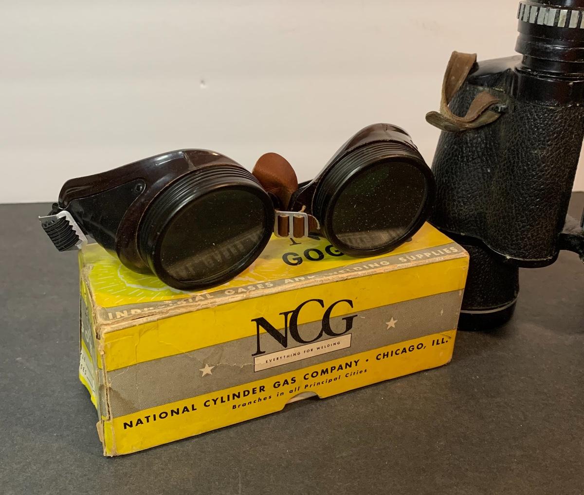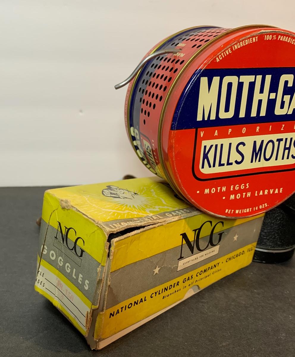 Vintage NCG Gas & Welding Googles, vintage MOTH-GAS TIN Lewy Chemical Co. NY - hangs(hook) and Binoculars