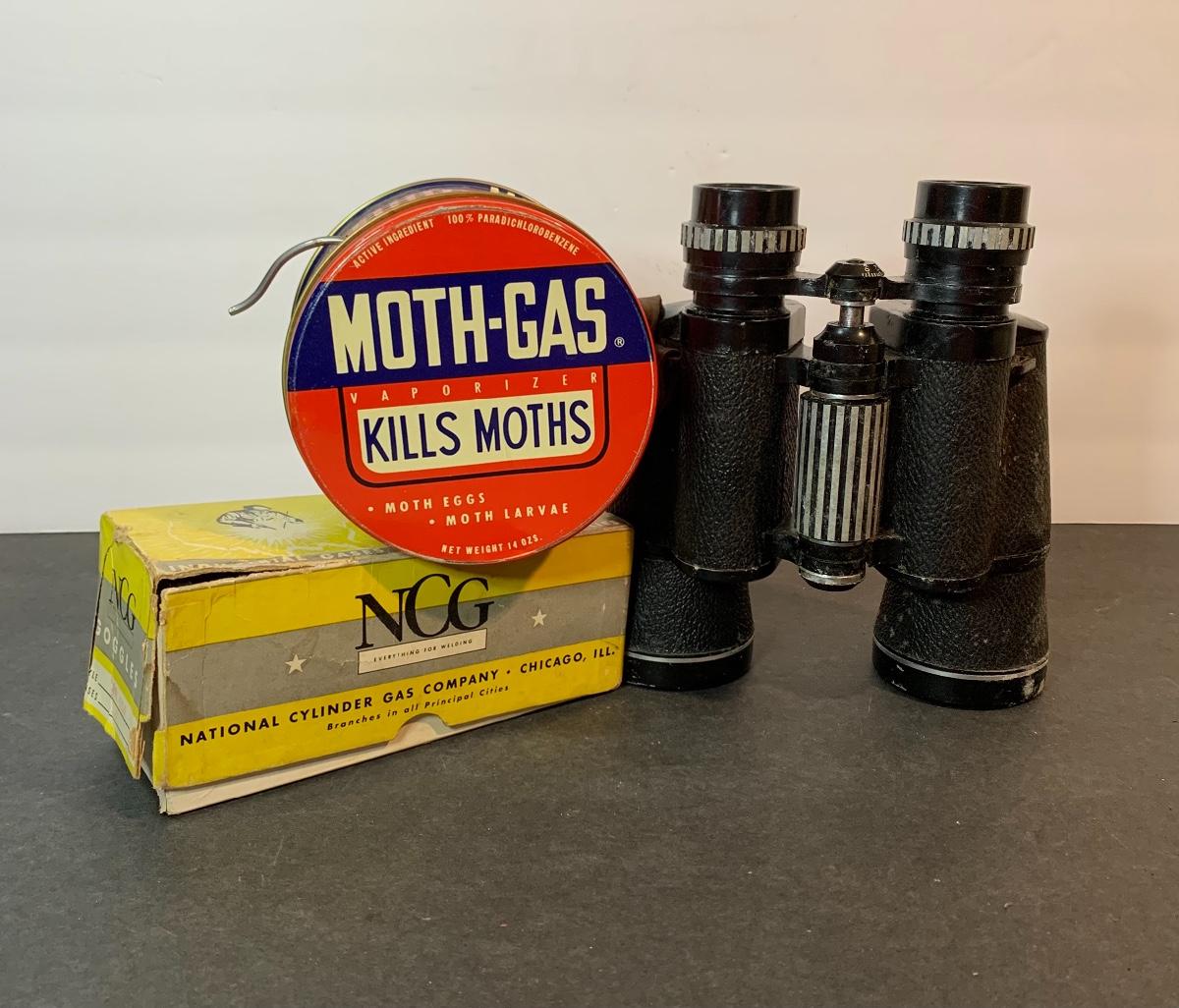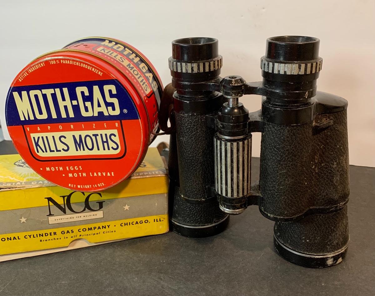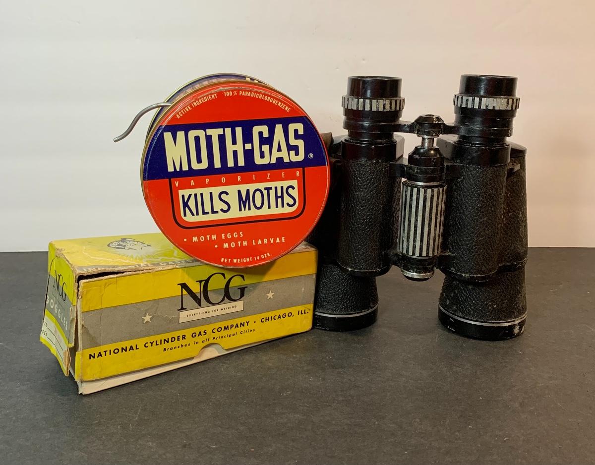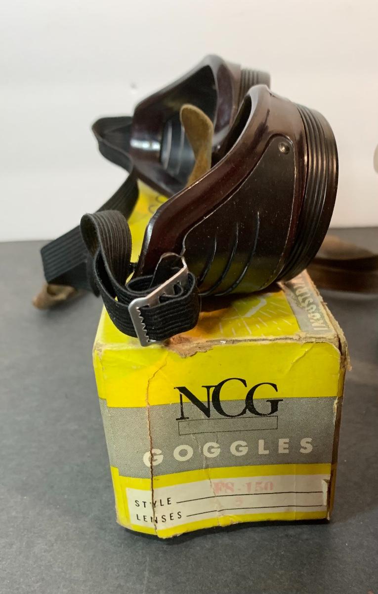 Vintage NCG Gas & Welding Googles, vintage MOTH-GAS TIN Lewy Chemical Co. NY - hangs(hook) and Binoculars