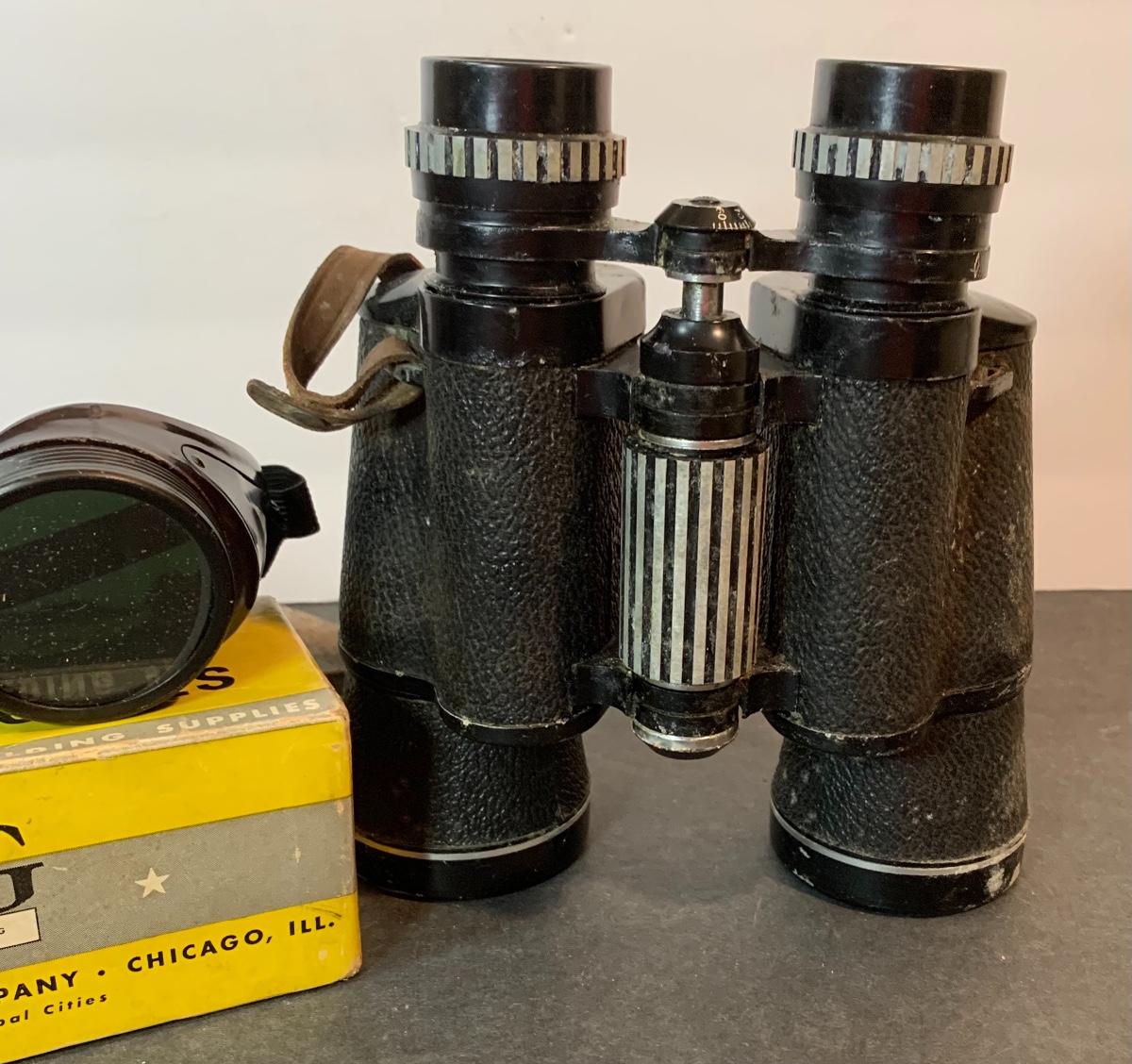 Lot 140:  Vintage Binoculars, NCG Steampunk Welding Goggles and Tin