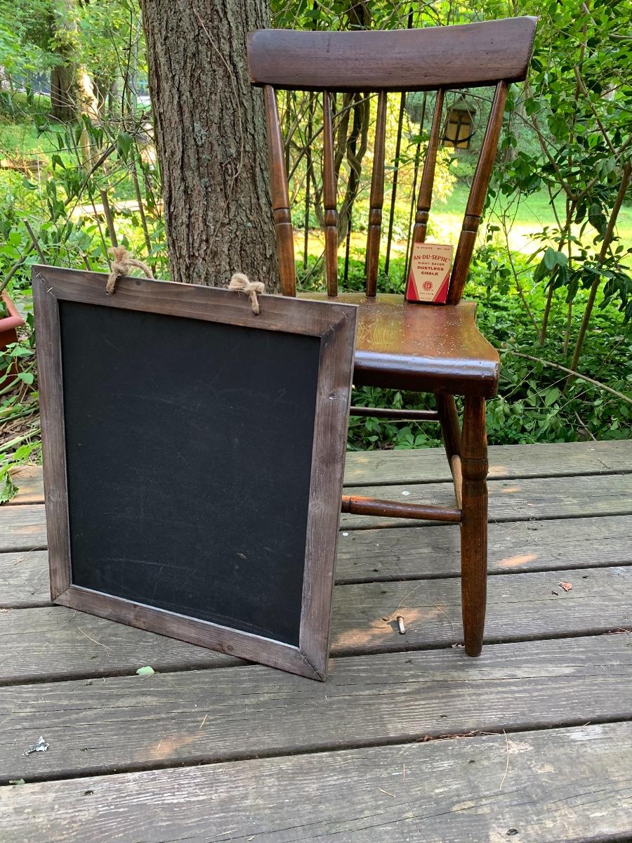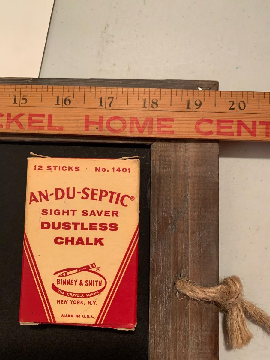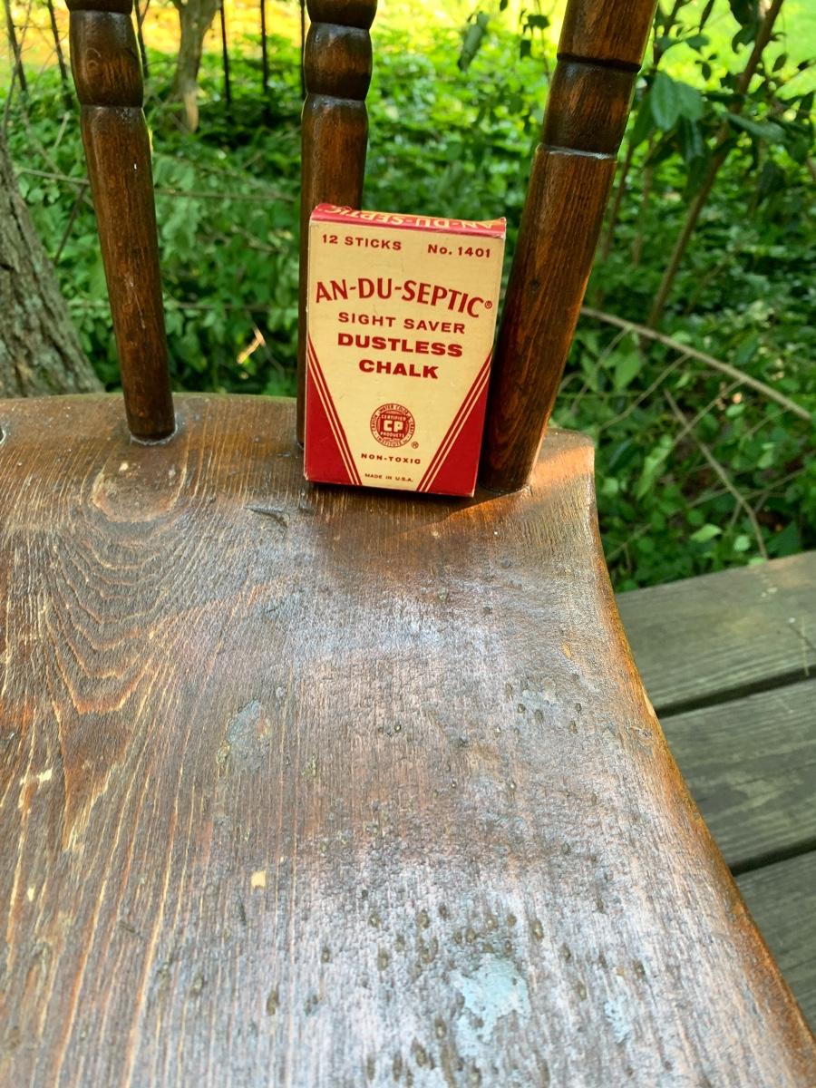 School House Lot complete with Vintage Chair , Chalk Board & An-Du-Septic Dustless Chalk by Binney & Smith (The Crayola Makers) box of chalk.