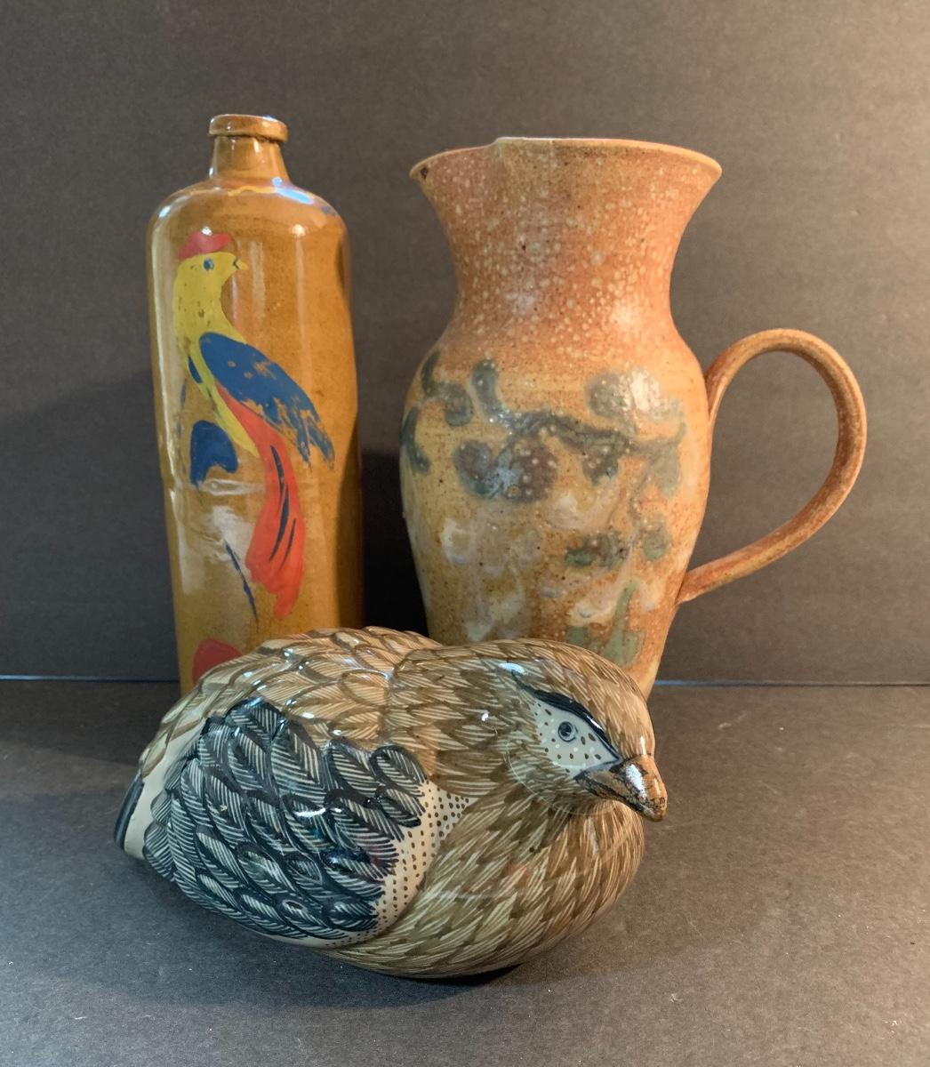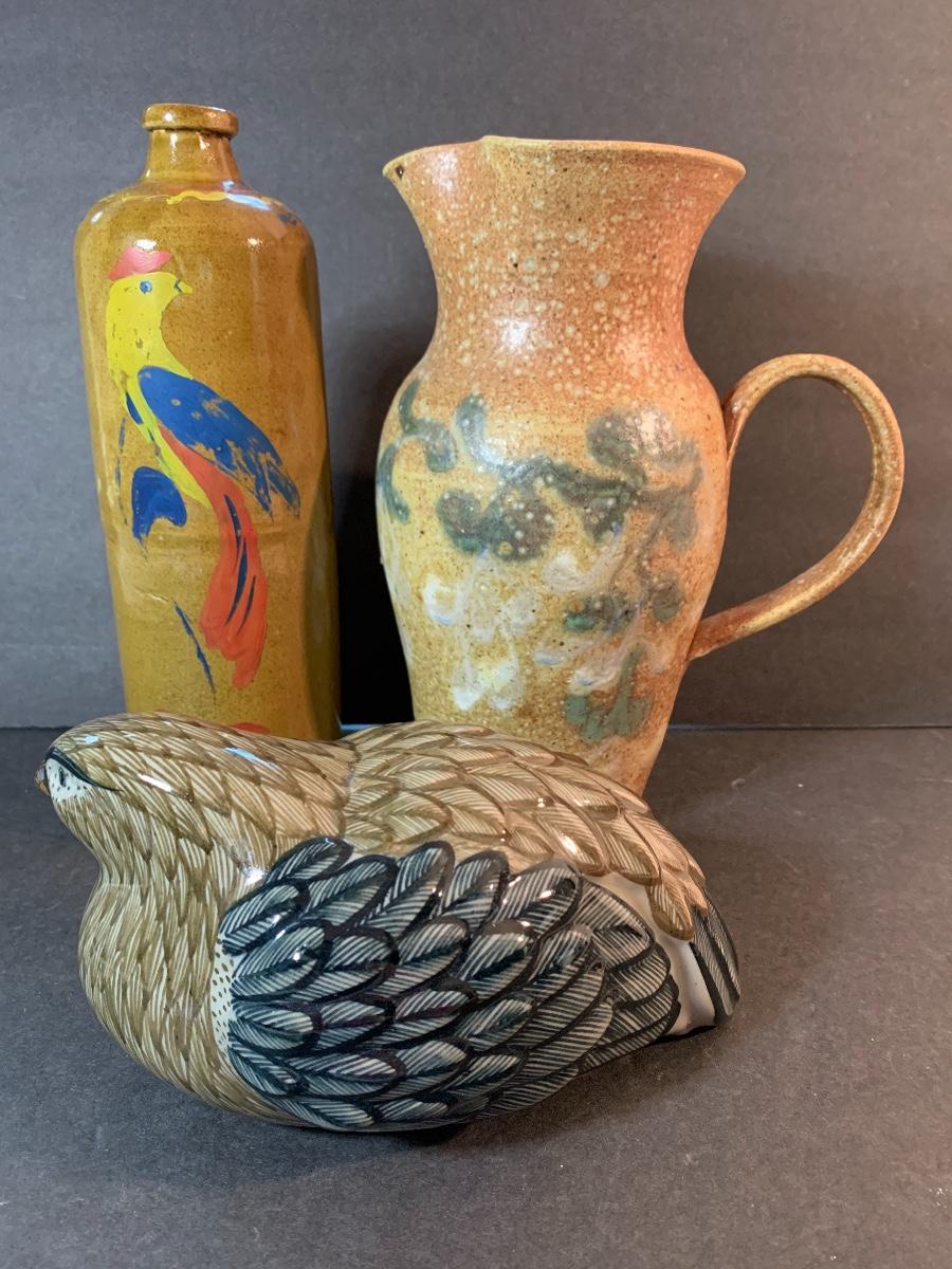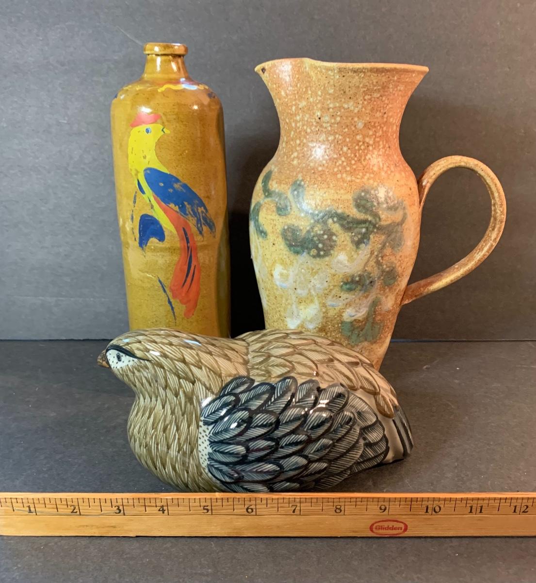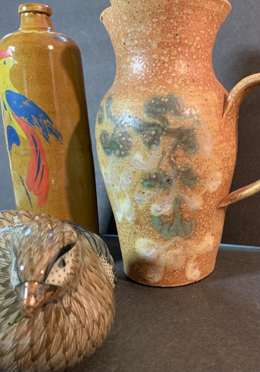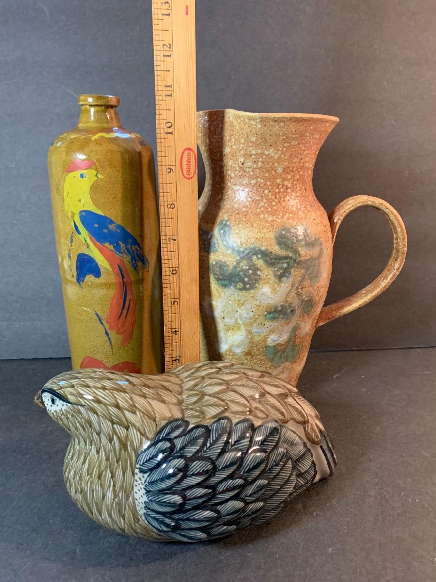Vintage Salt Glaze Bottle with painted bird, gorgeous laying bird signed, and signed handled pitcher. Please see pictures as they are the best representation of the item, the condition of the item, and the size of the item.