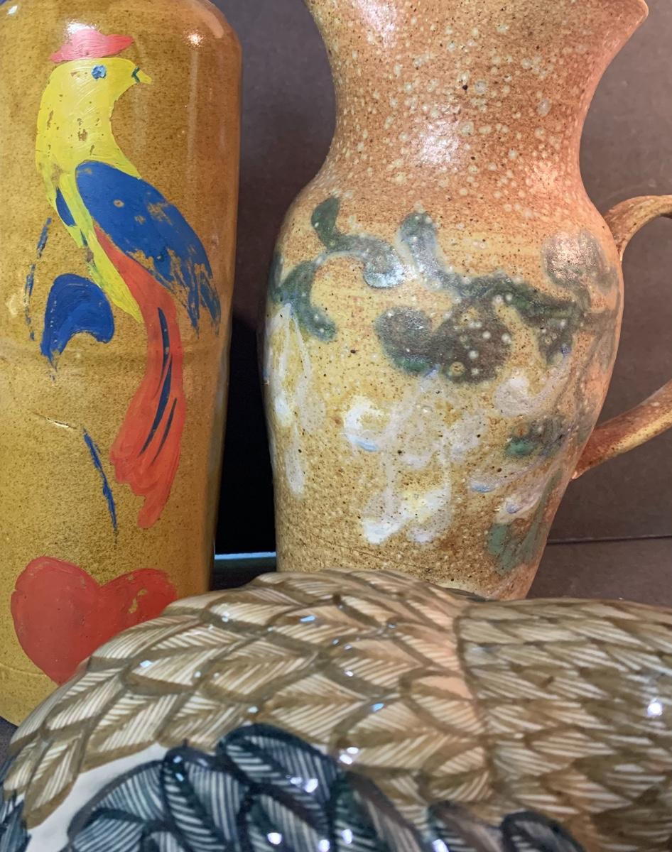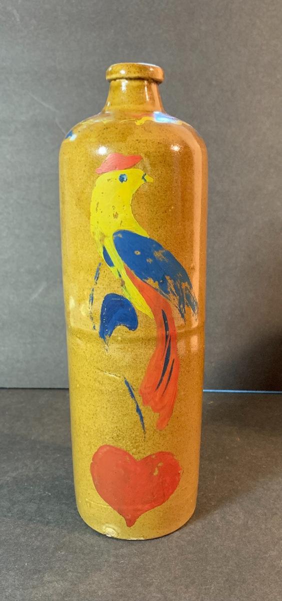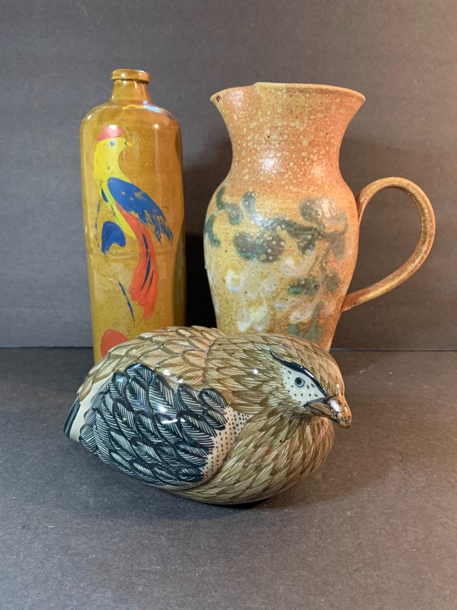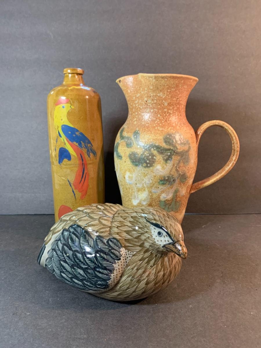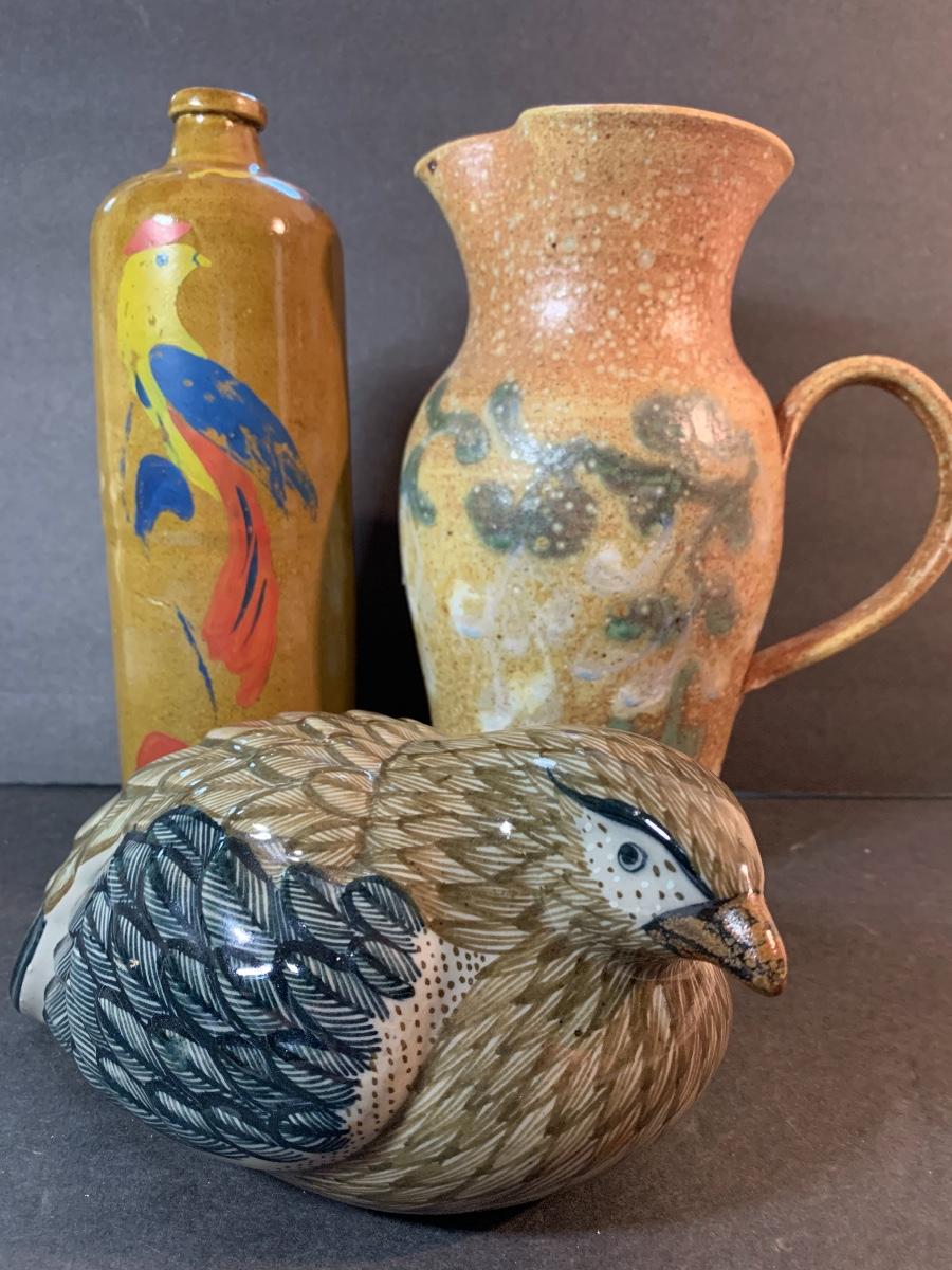 Vintage Salt Glaze Bottle with painted bird, gorgeous laying bird signed, and signed handled pitcher. Please see pictures as they are the best representation of the item, the condition of the item, and the size of the item.