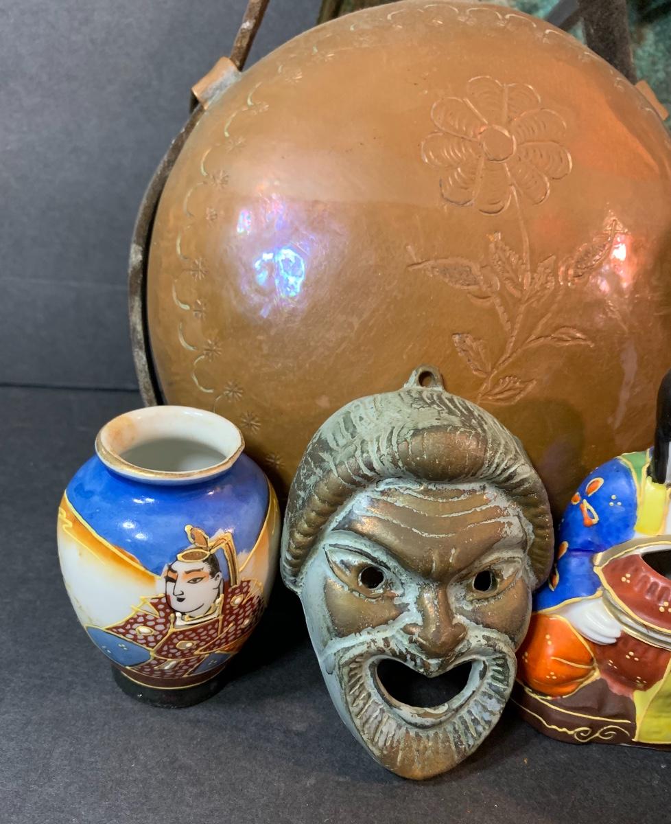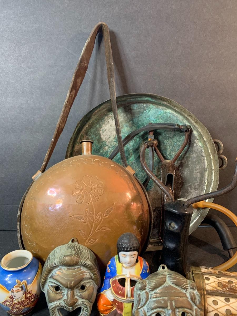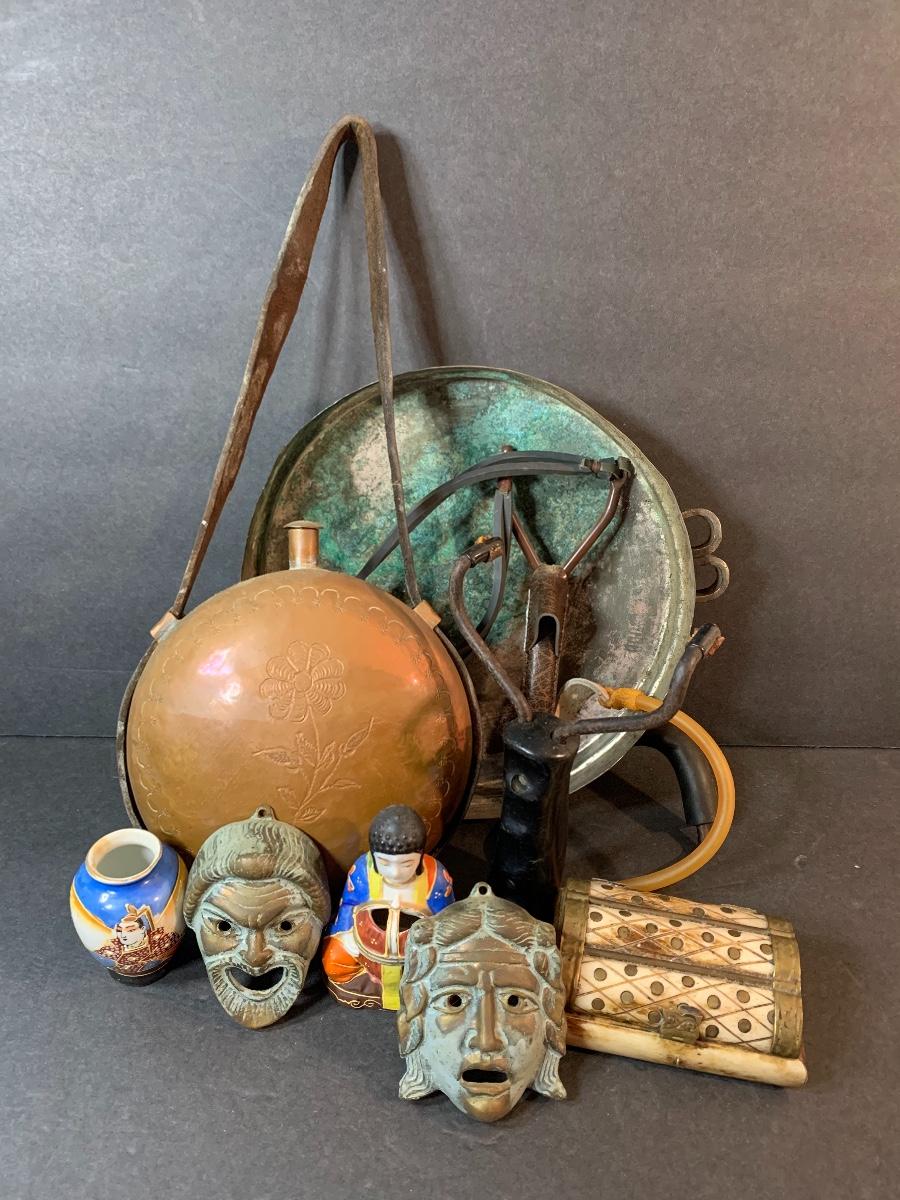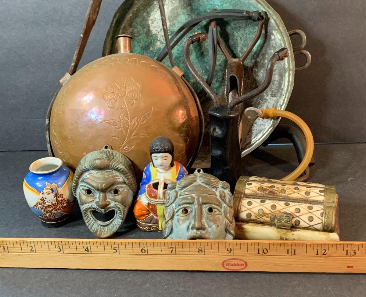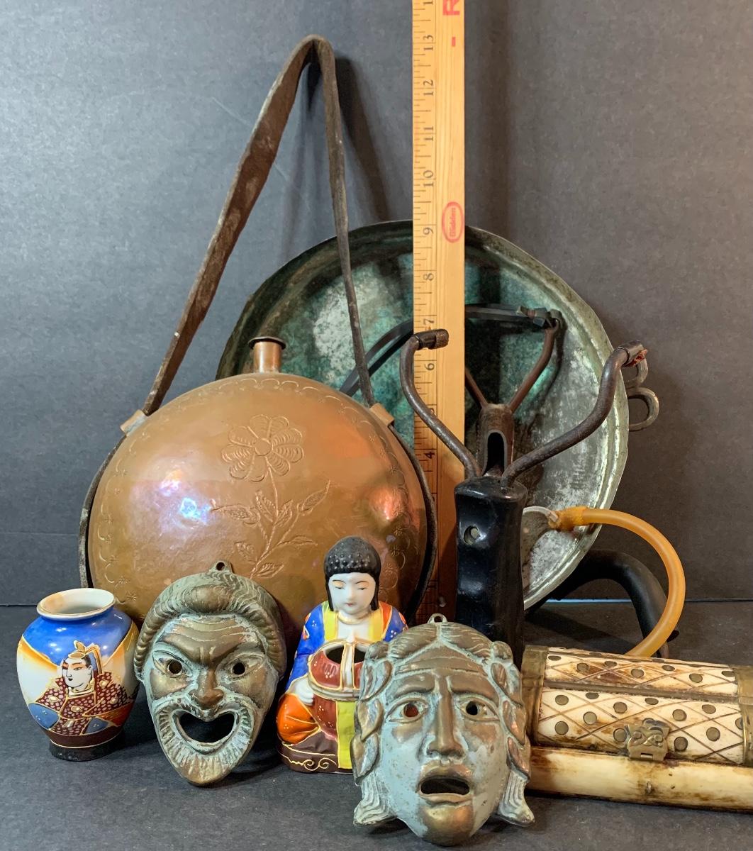 Lot  130: Occupied Japan Figurines, Brass Faces, Copper Canteen, Antique Slingshot and More