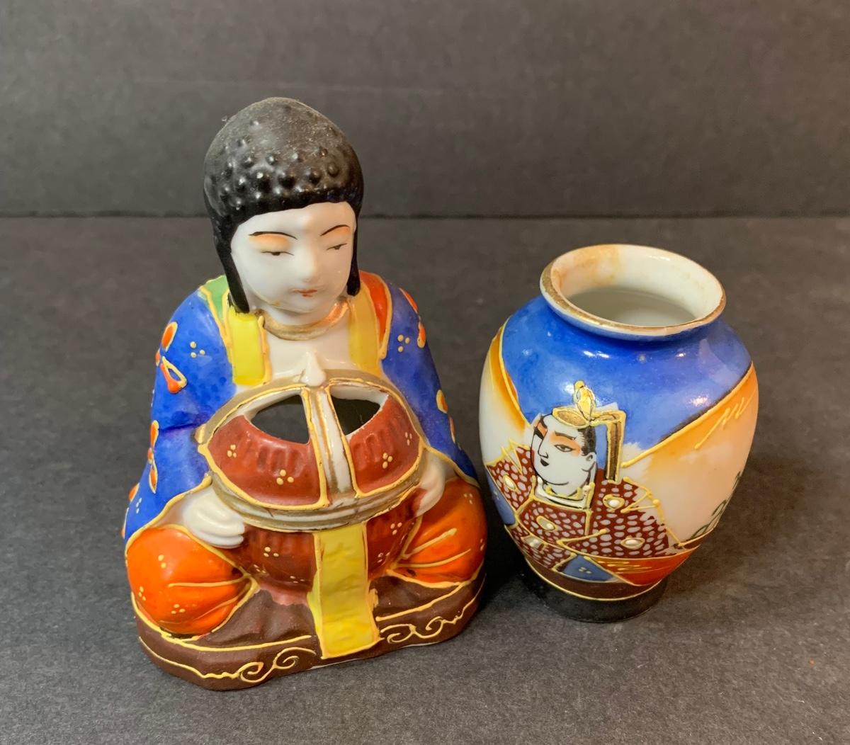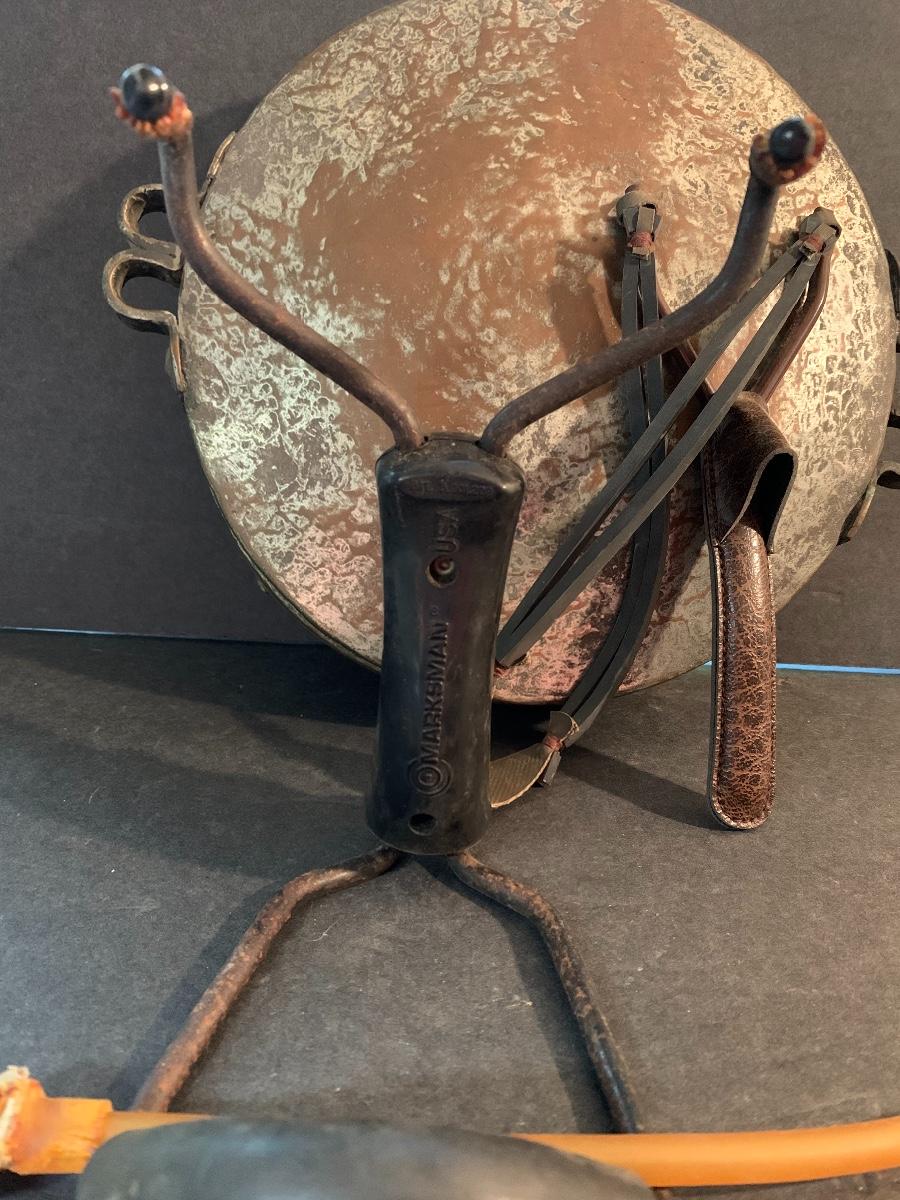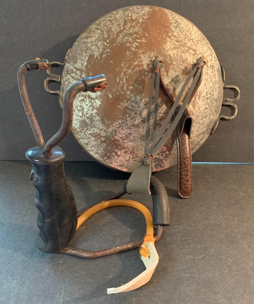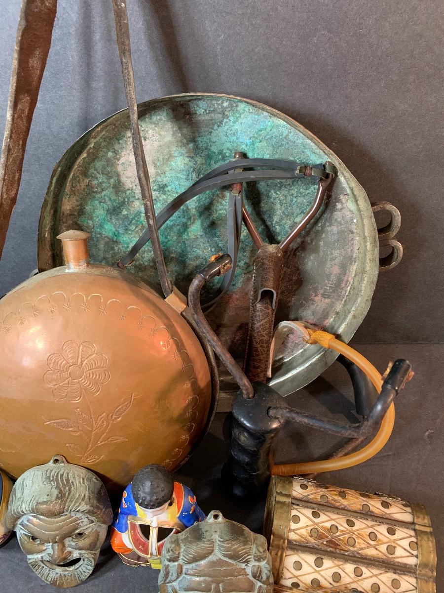 Lot  130: Occupied Japan Figurines, Brass Faces, Copper Canteen, Antique Slingshot and More