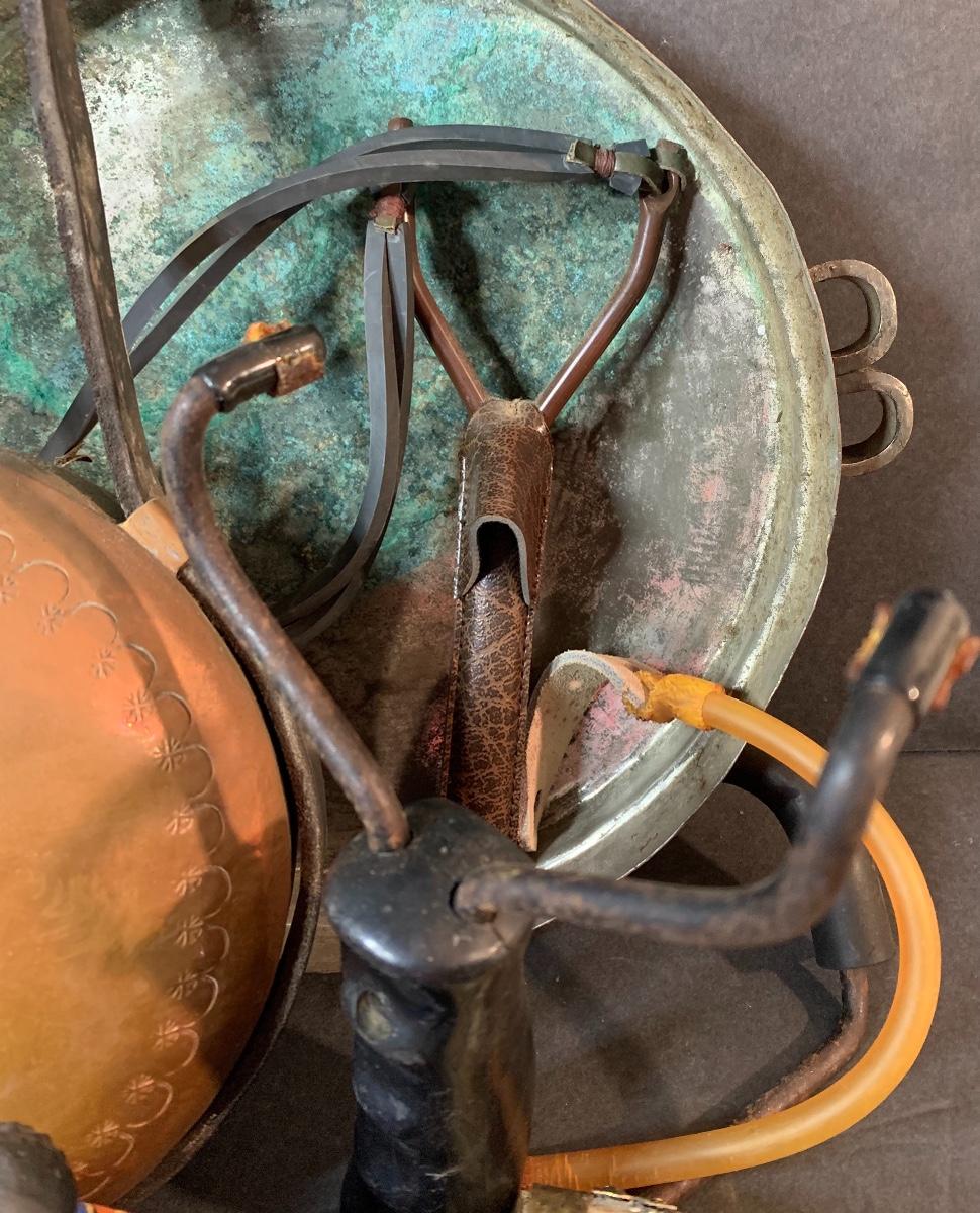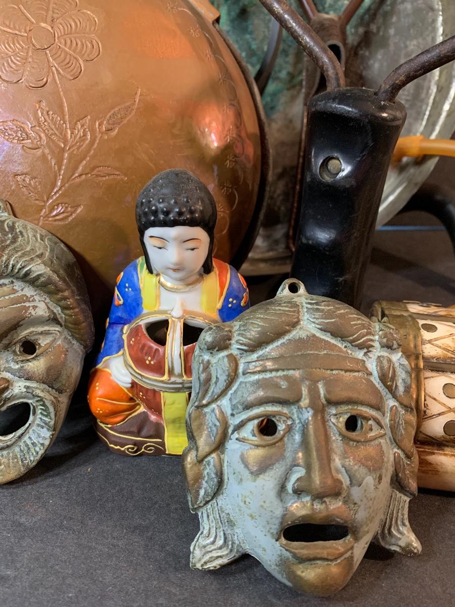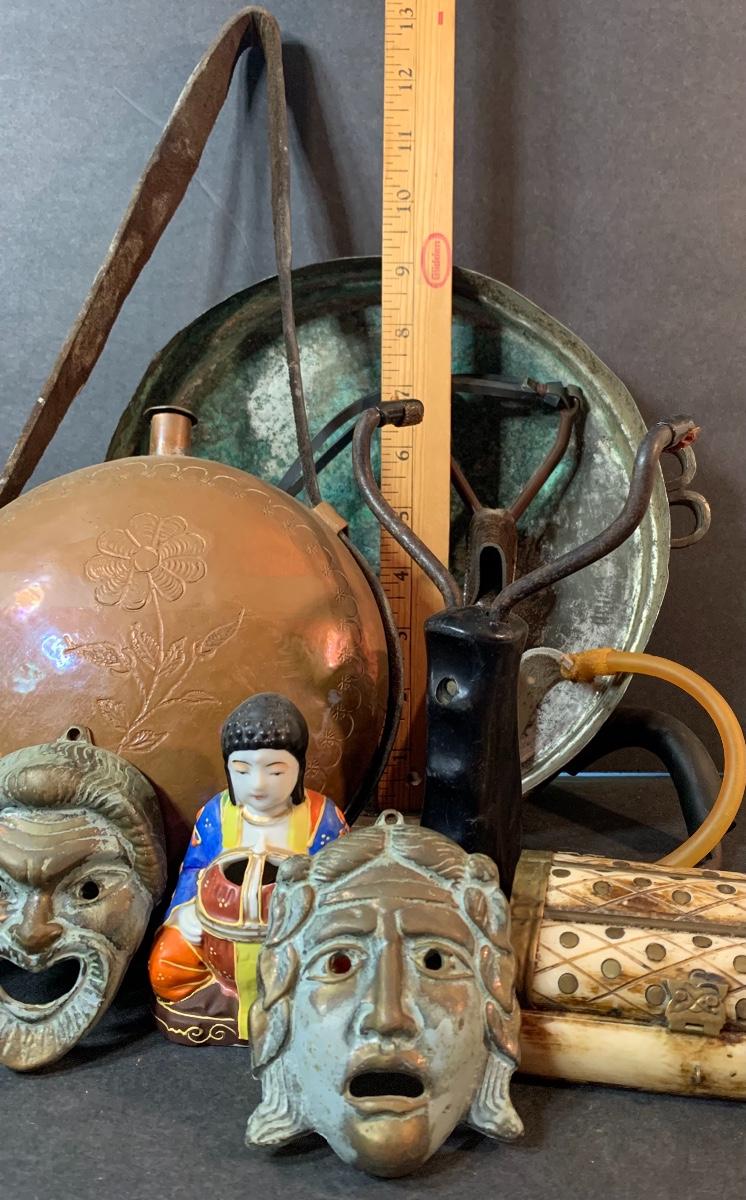 Lot 130: Occupied Japan Figurines, Brass Faces, Copper Canteen, Antique Slingshot and More