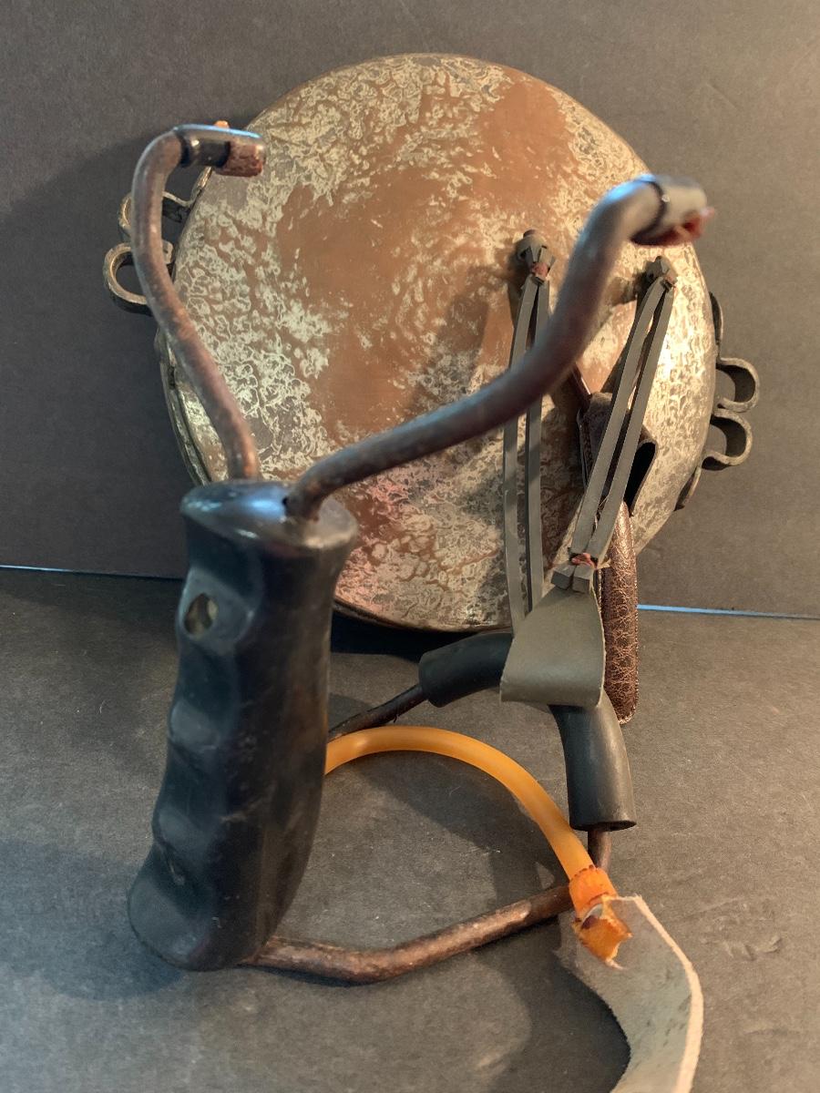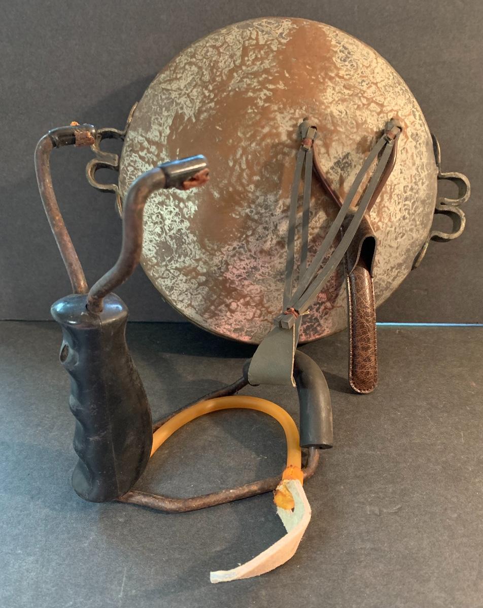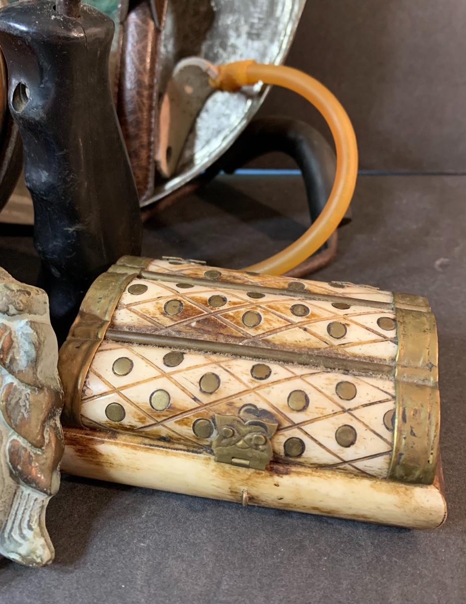 Lot 130: Occupied Japan Figurines, Brass Faces, Copper Canteen, Antique Slingshot and More