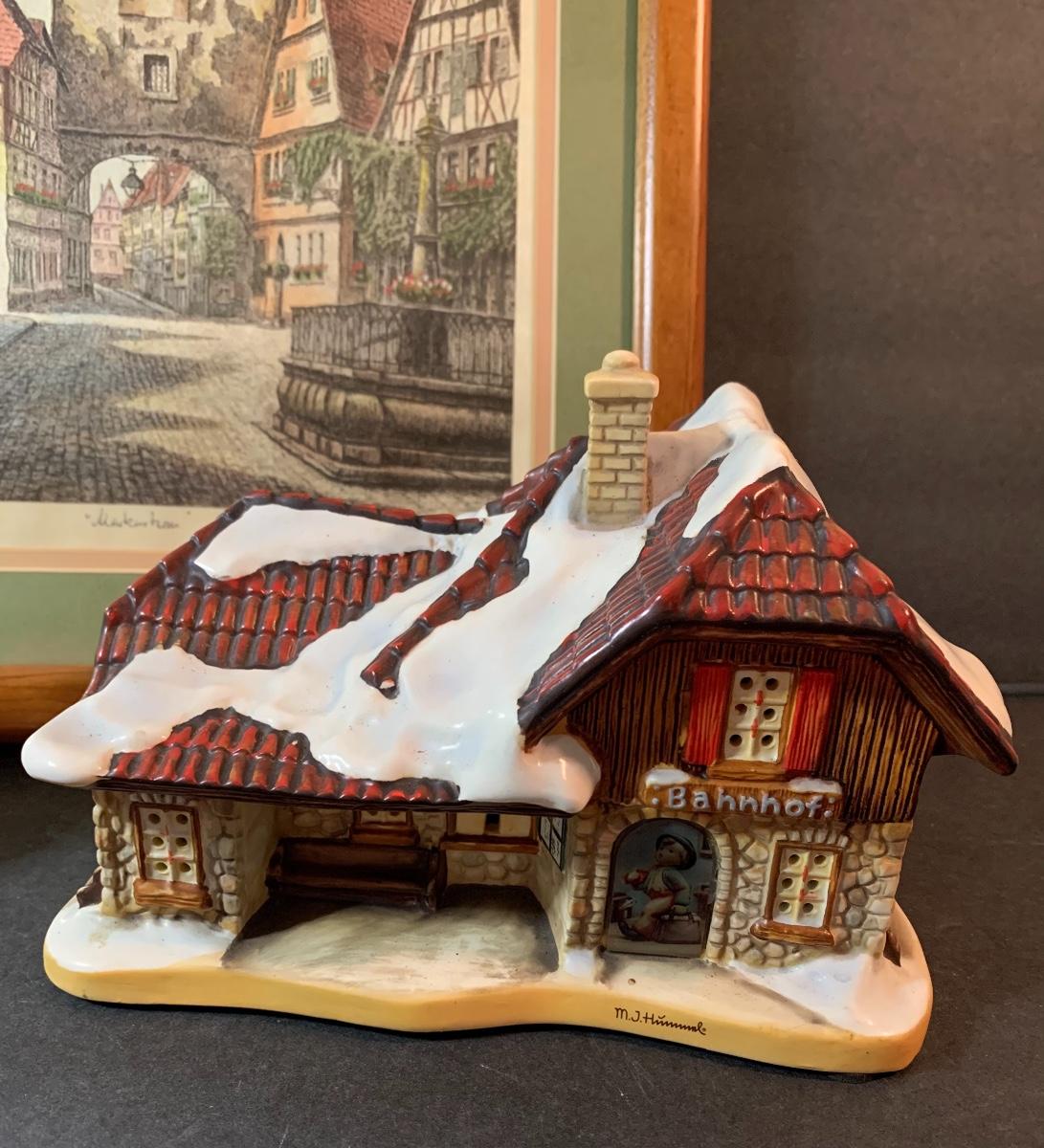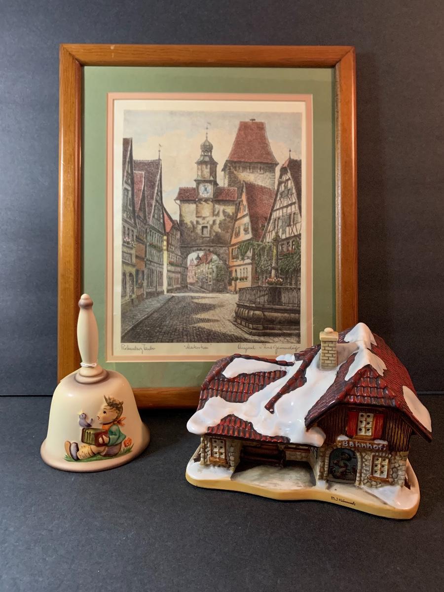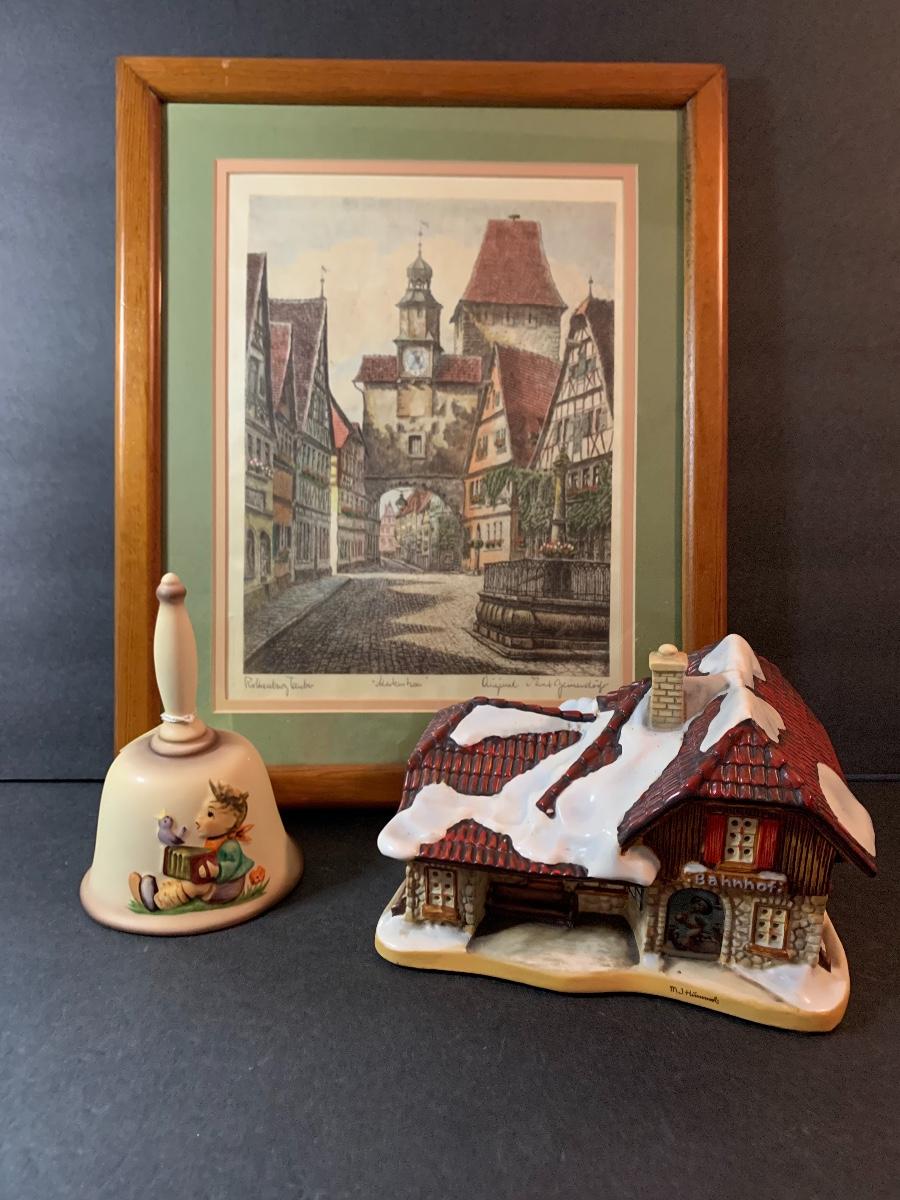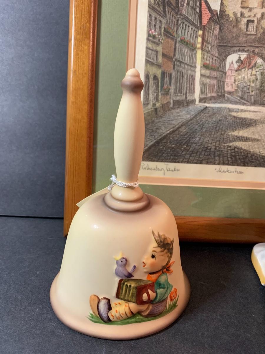 Lot 128: Hummel Lighted Cottage, Goebel Bell and signed Pencil Drawing.