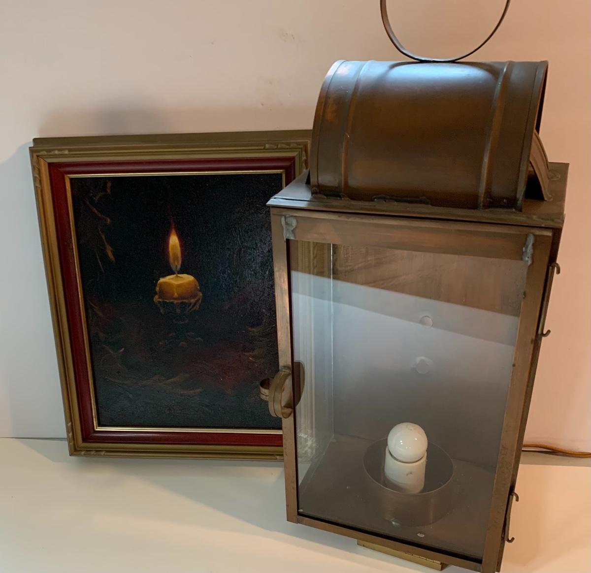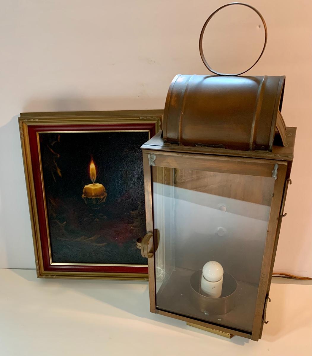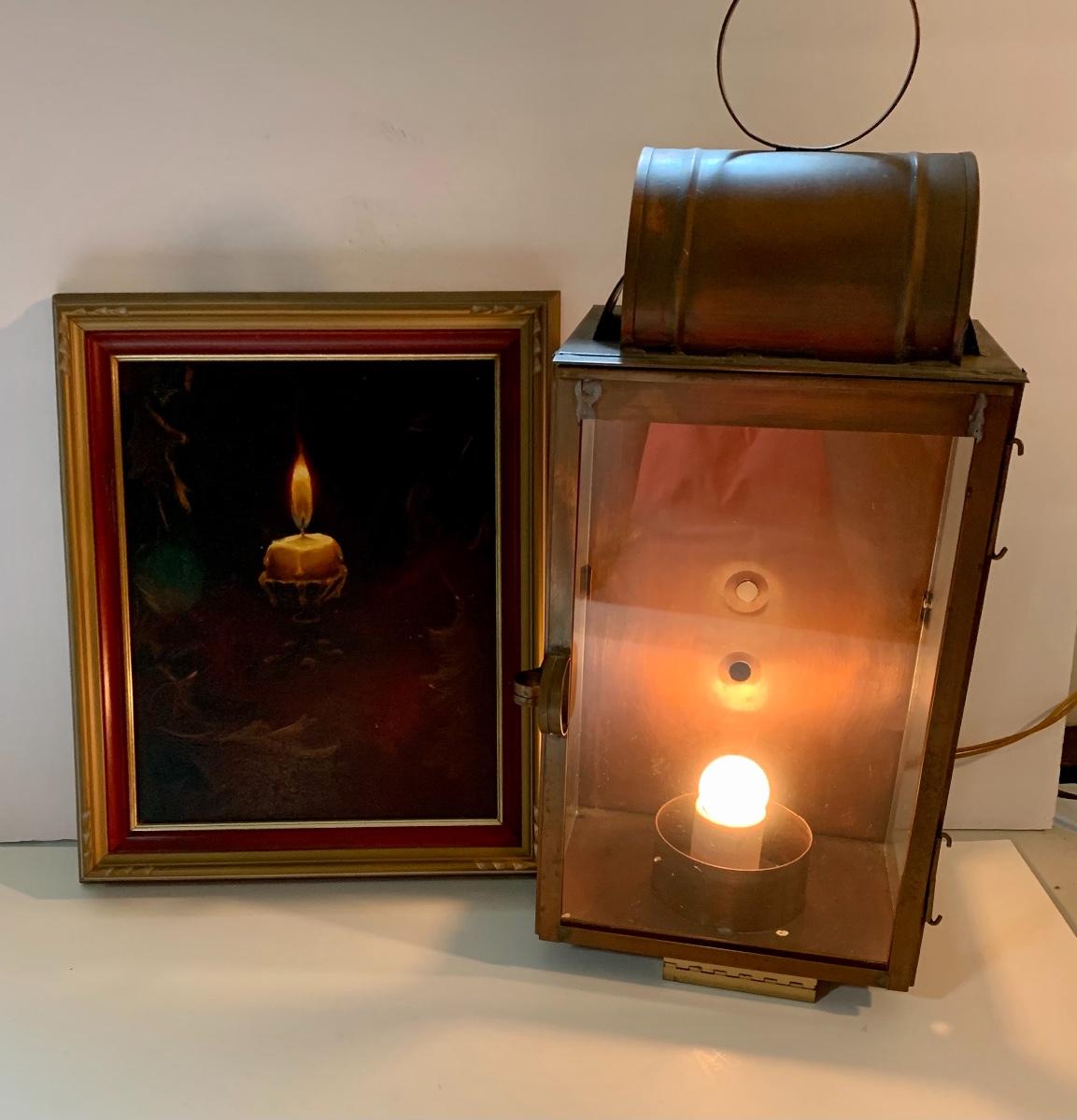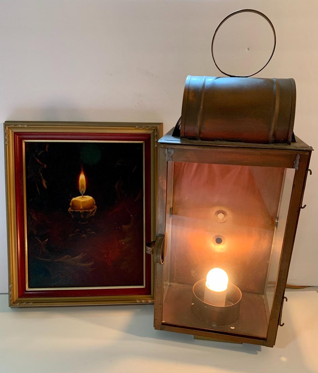 This painting is gorgeous, but unsure of medium as it looks to be on corrugated thin wood. The candle glows when the right light hits it. The lantern has been rewired to be used as wall lantern. Please see all pictures for content of the lot, condition of the lot, and measurements if taken. Pictures are the best representation of the items listed and items are untested unless indicated in description. Thank you for looking and have fun bidding!