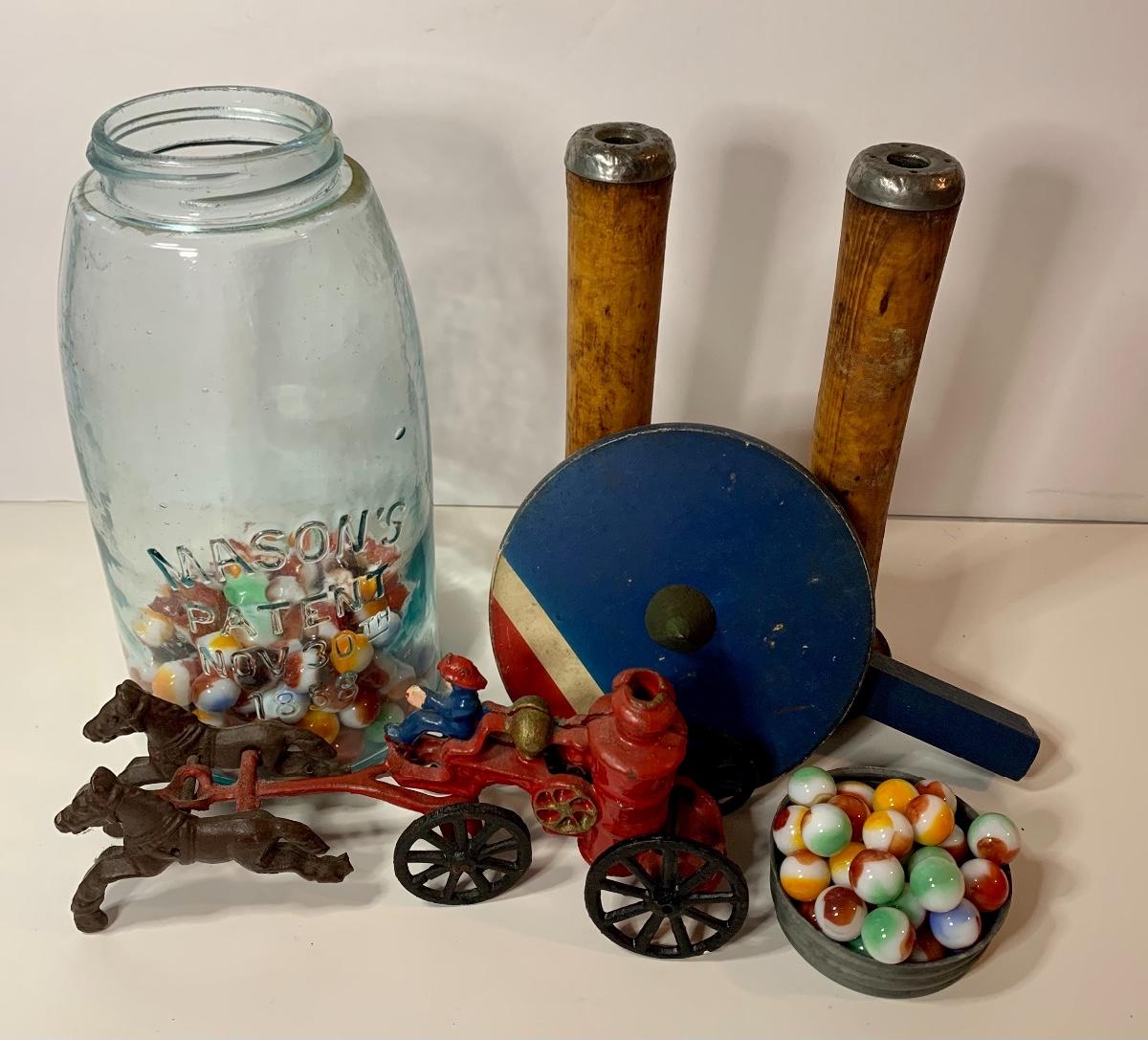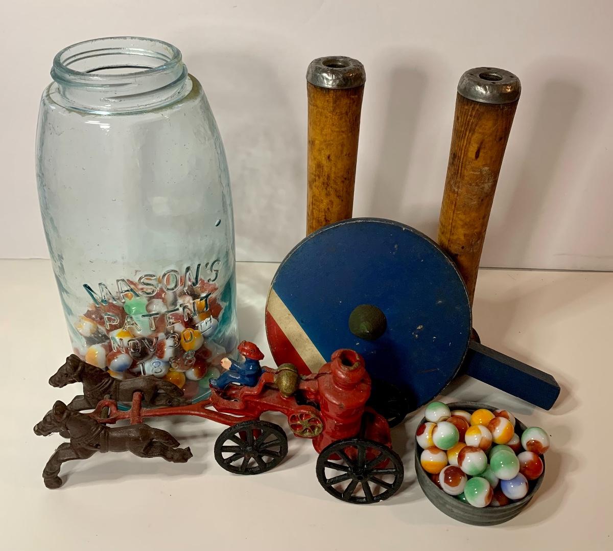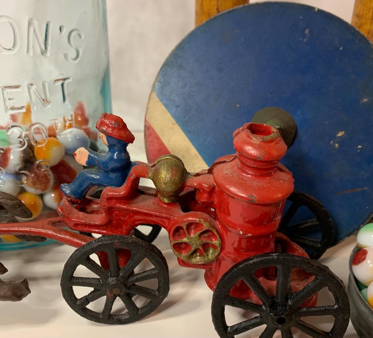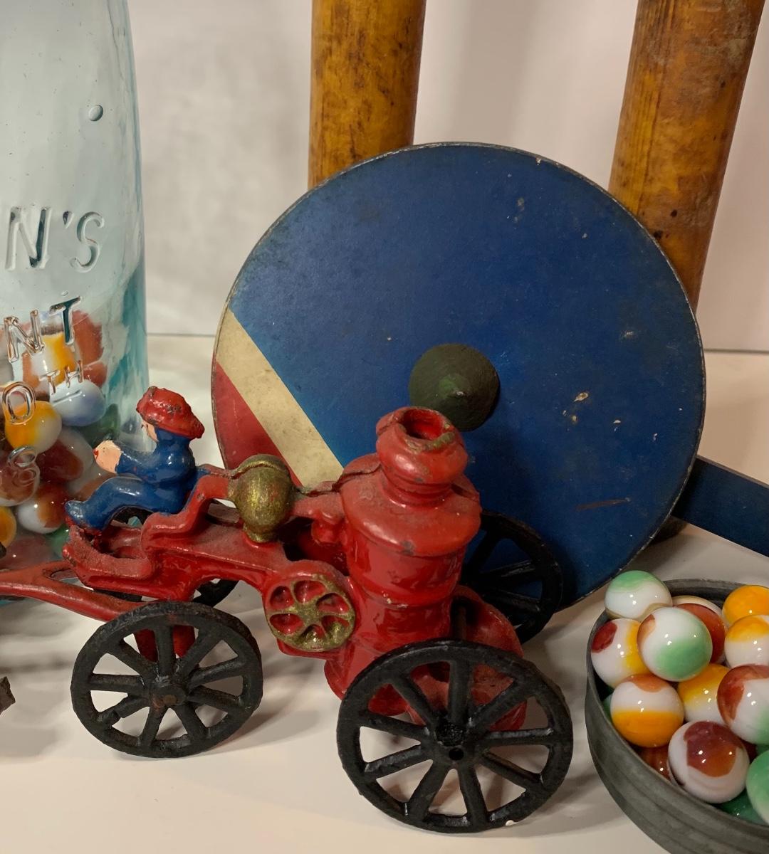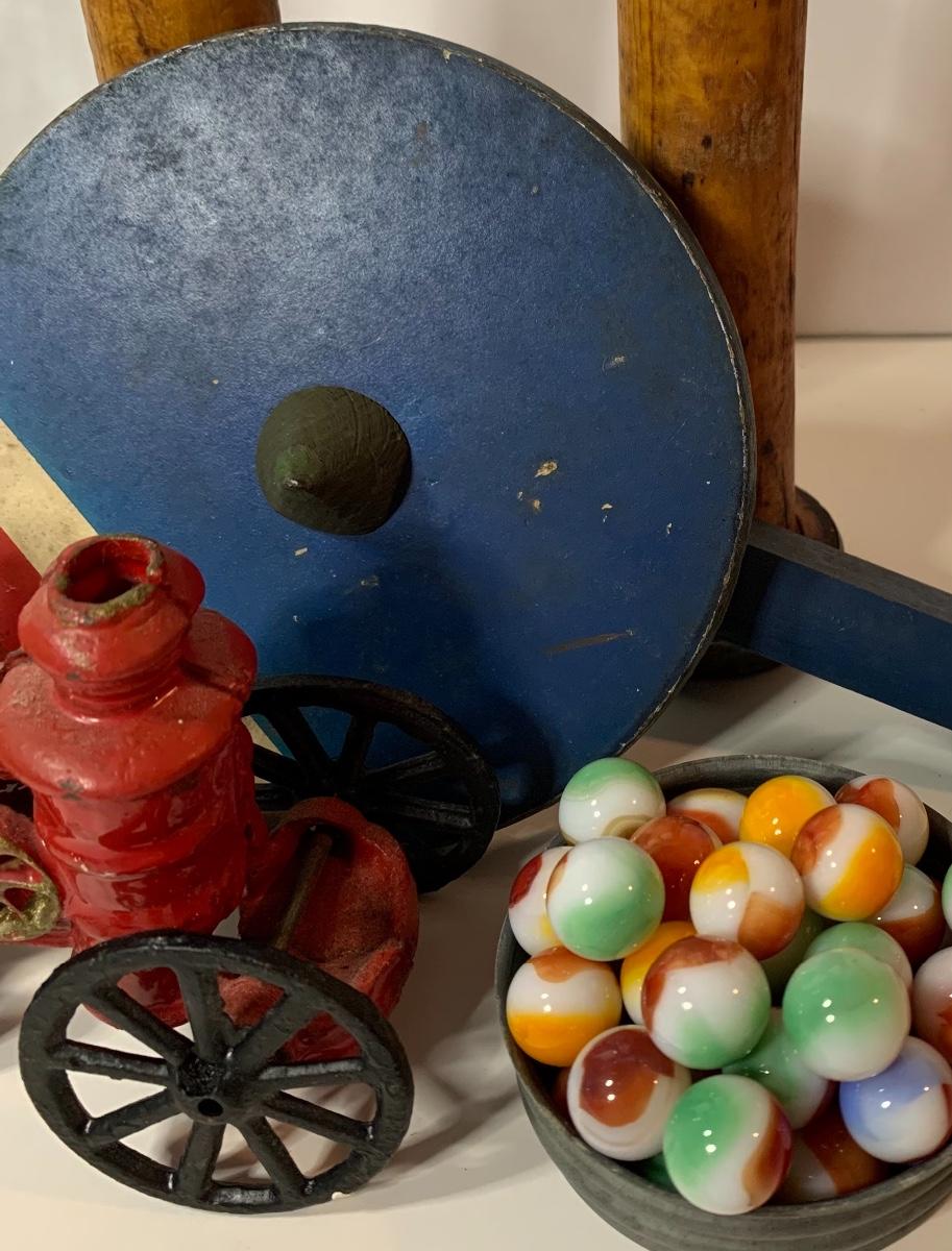 Lot 121: Vintage Marbles, Cast Iron Firetruck, Primitive Painted Spinning Top and More