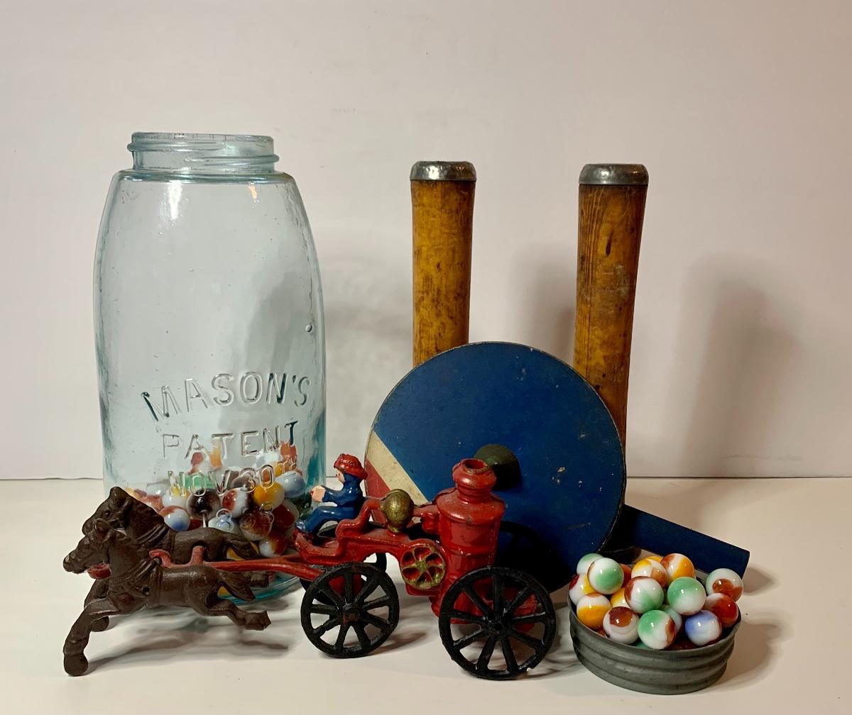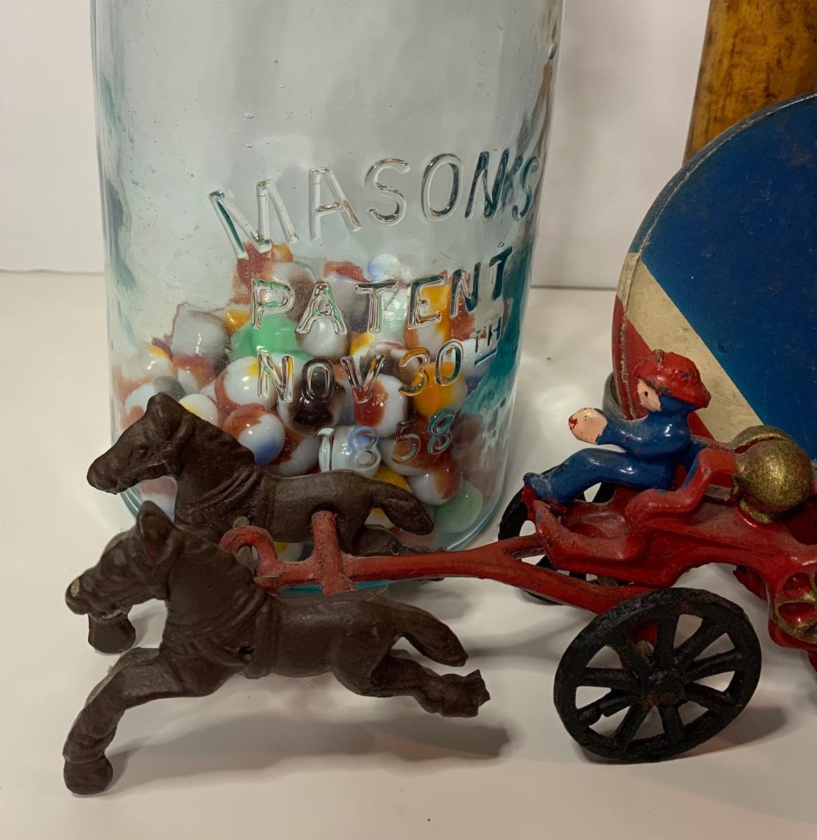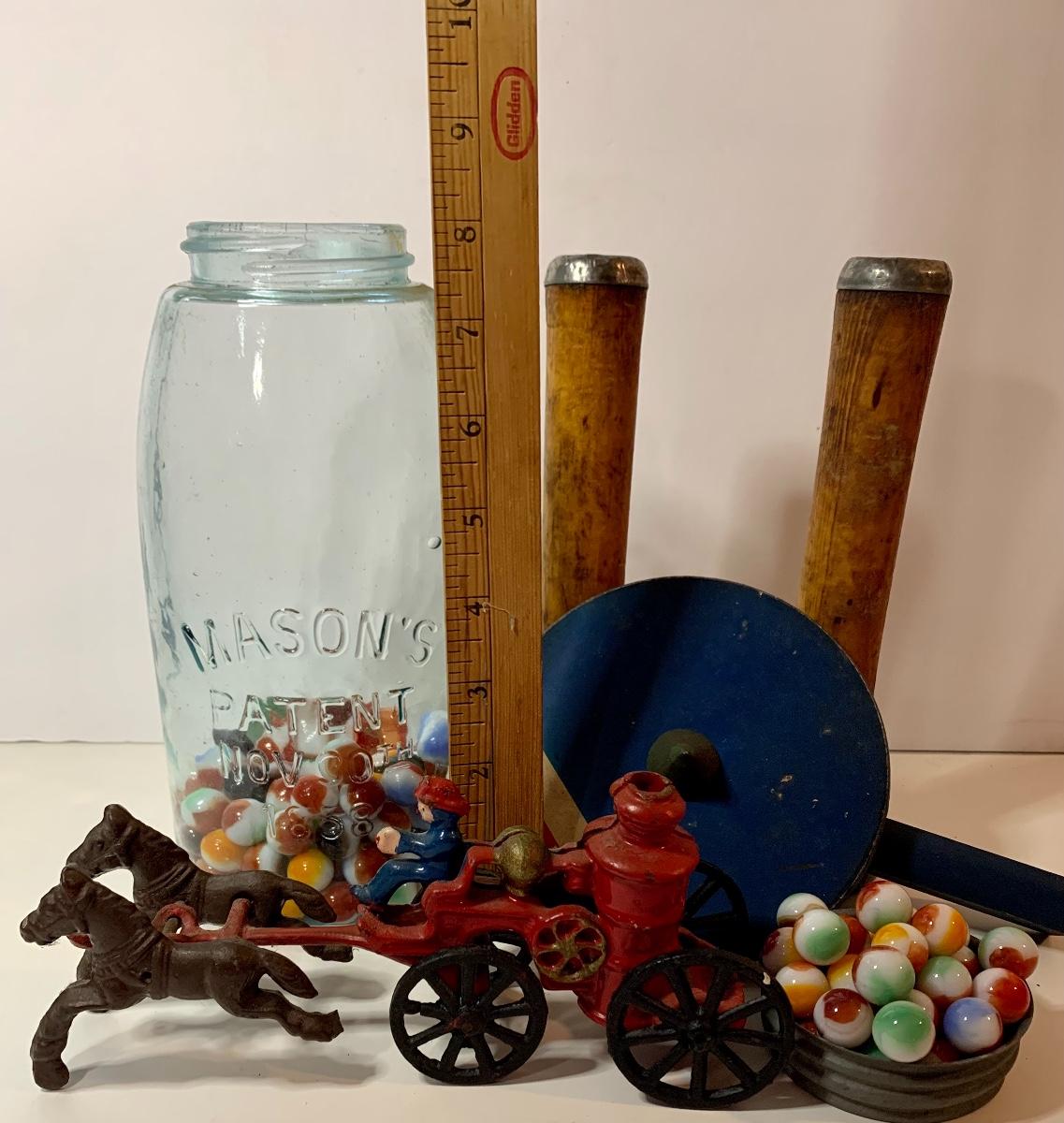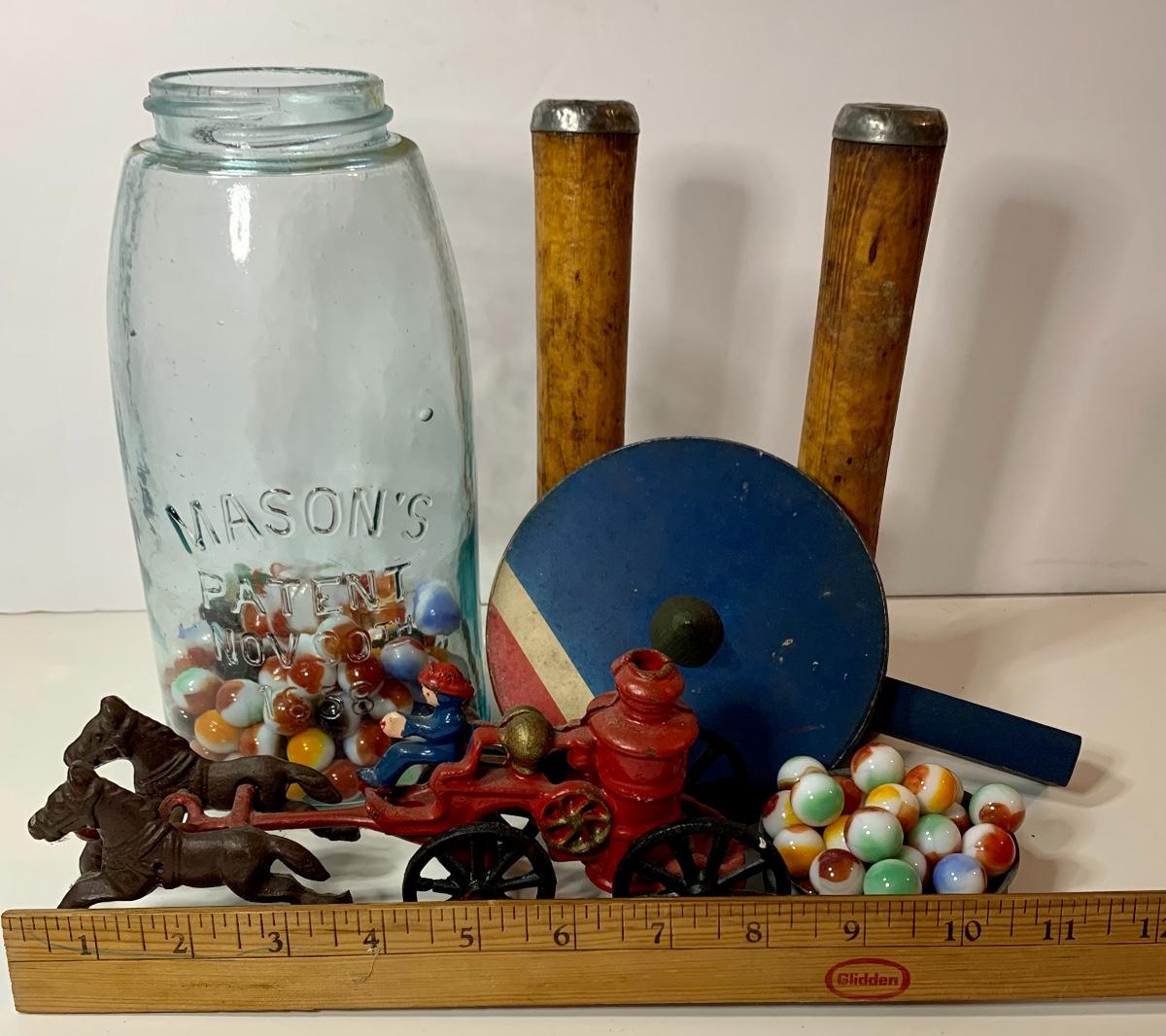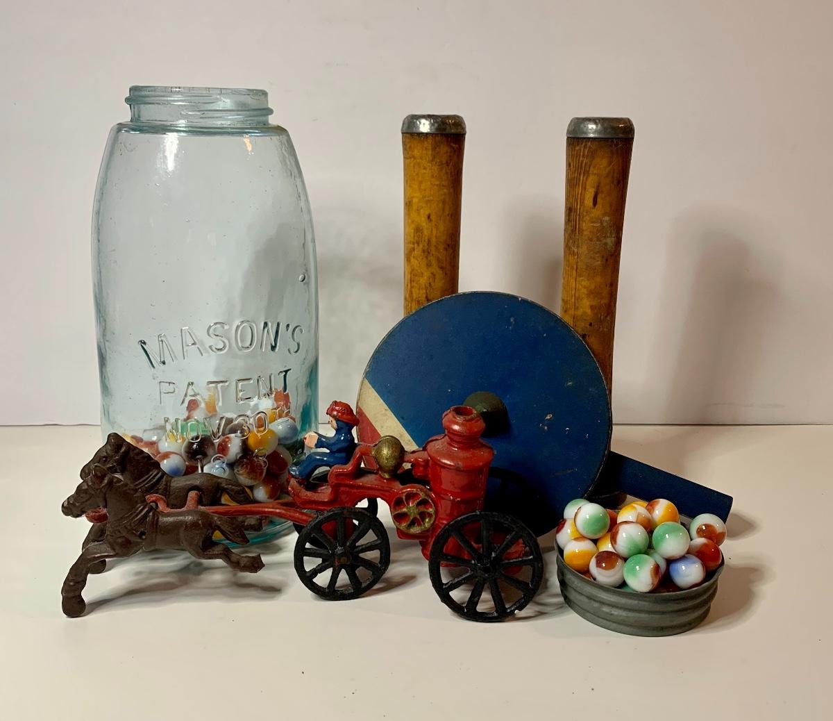 Lot 121: Vintage Marbles, Cast Iron Firetruck, Primitive Painted Spinning Top and More