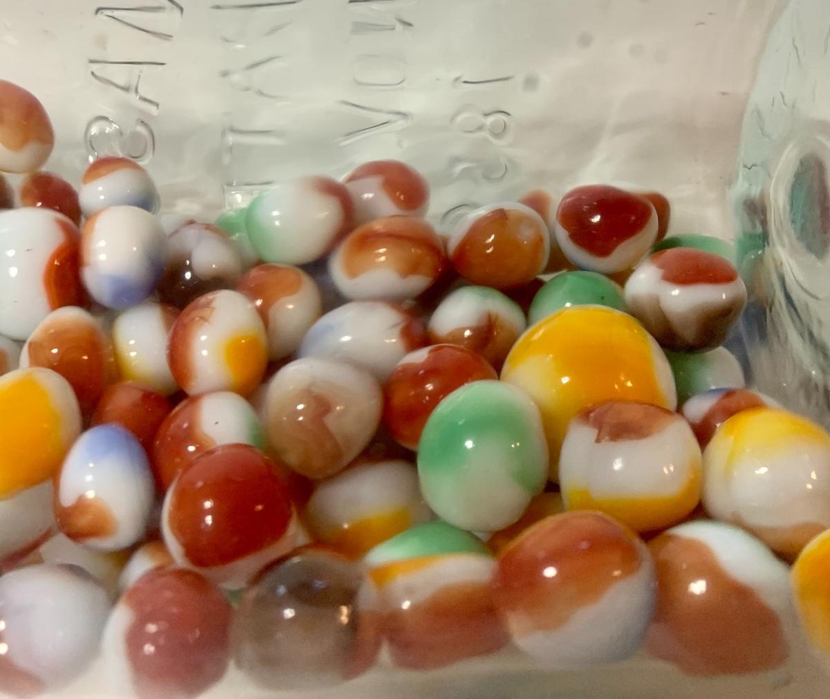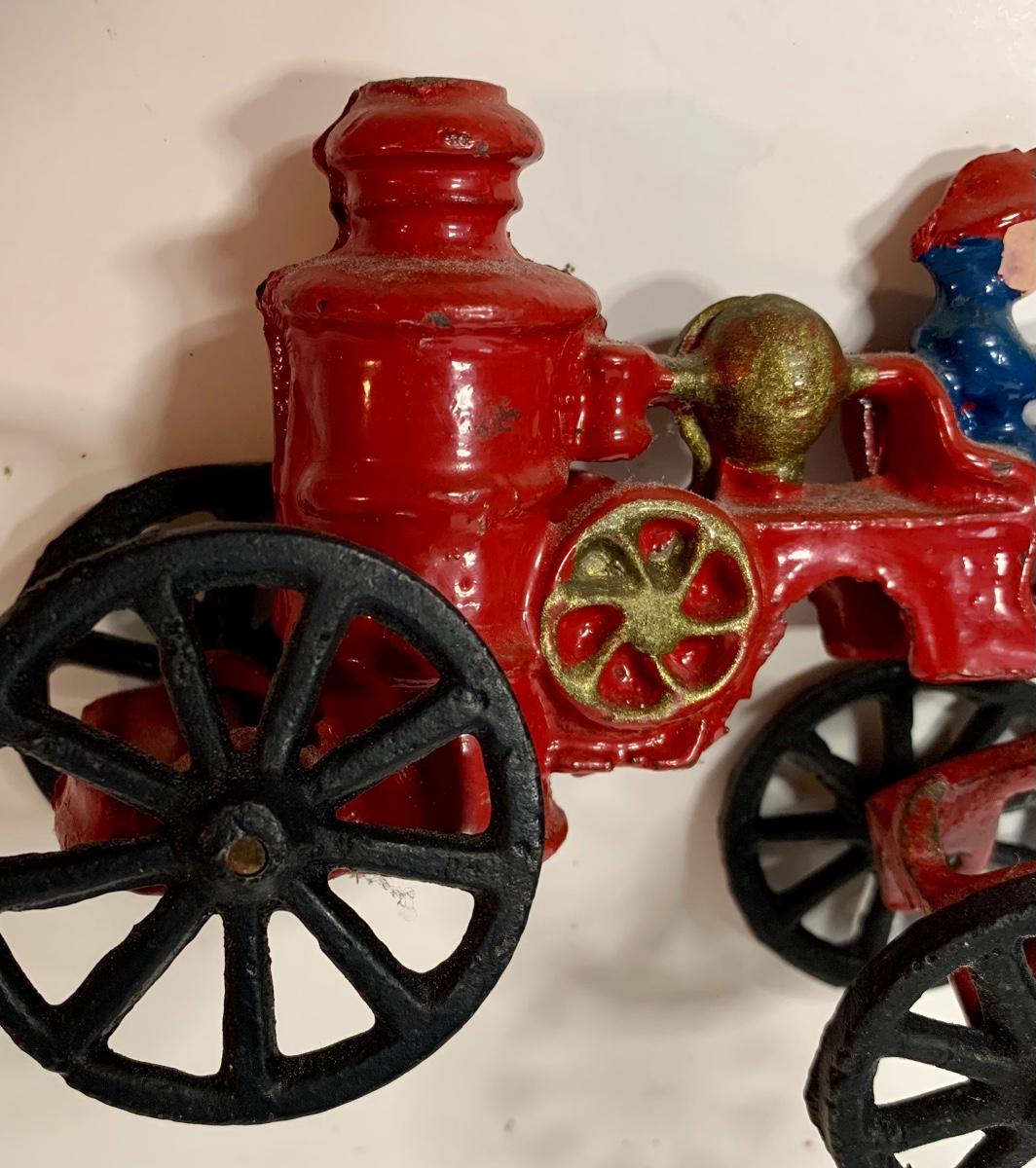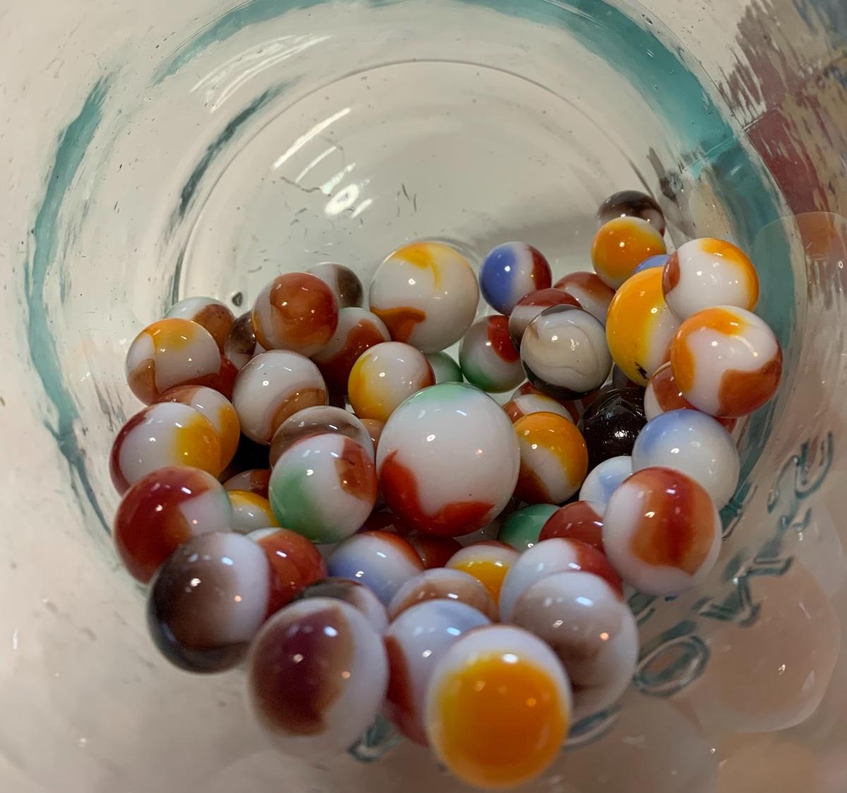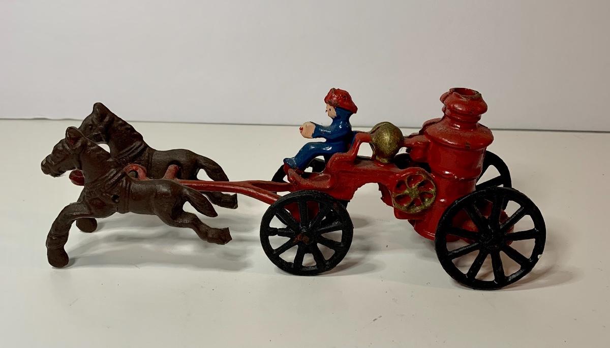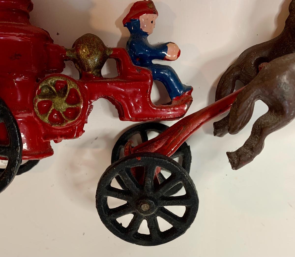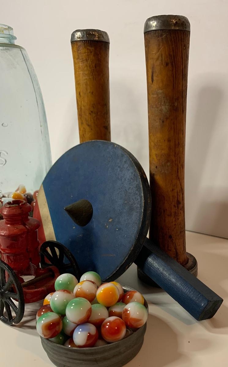 Lot 121: Vintage Marbles, Cast Iron Firetruck, Primitive Painted Spinning Top and More
