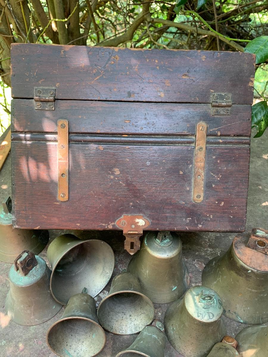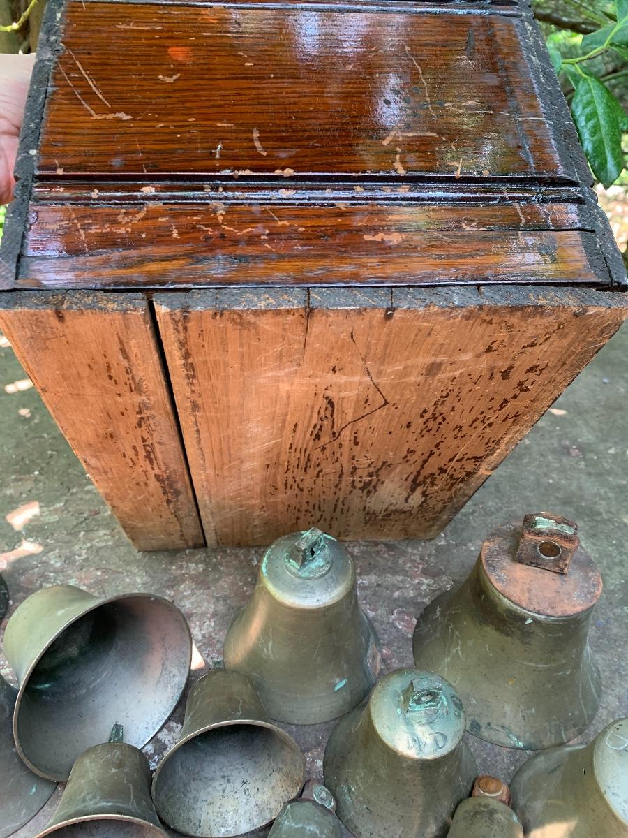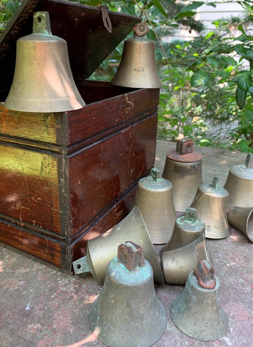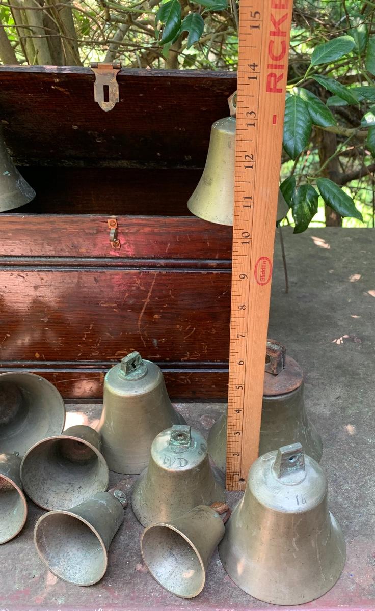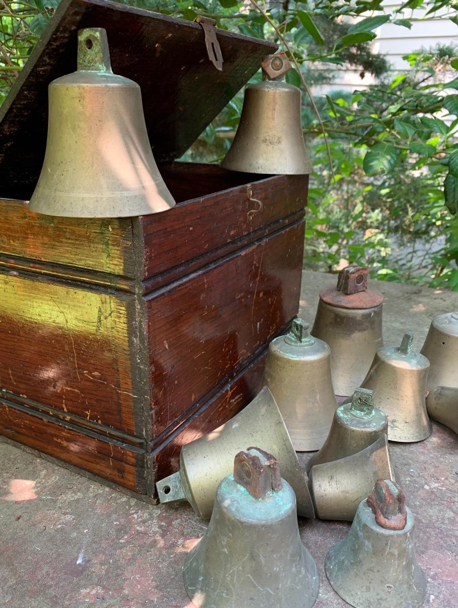 Nice older primitive Box, Large lot of Brass Project Bells all are missing the clapper (metal piece suspended inside a bell.)