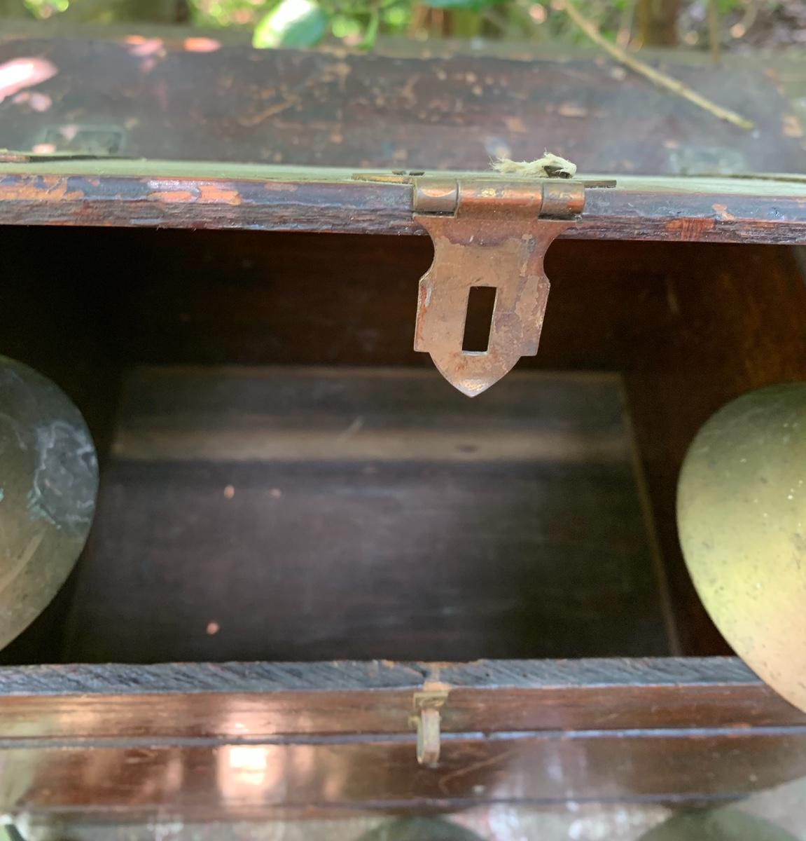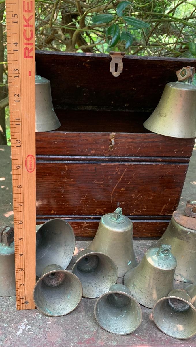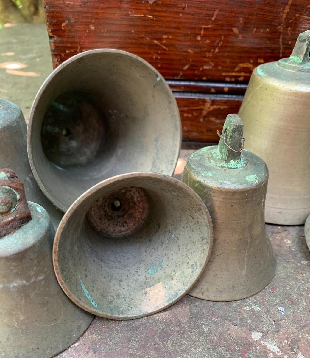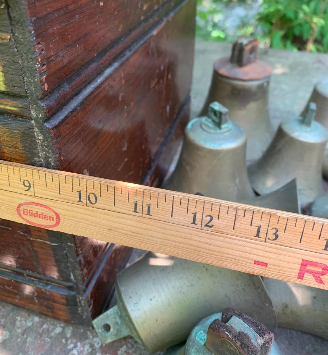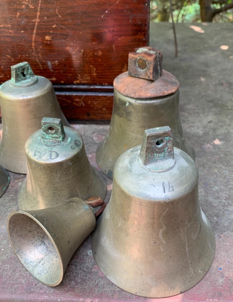 Nice older primitive Box, Large lot of Brass Project Bells all are missing the clapper (metal piece suspended inside a bell.)