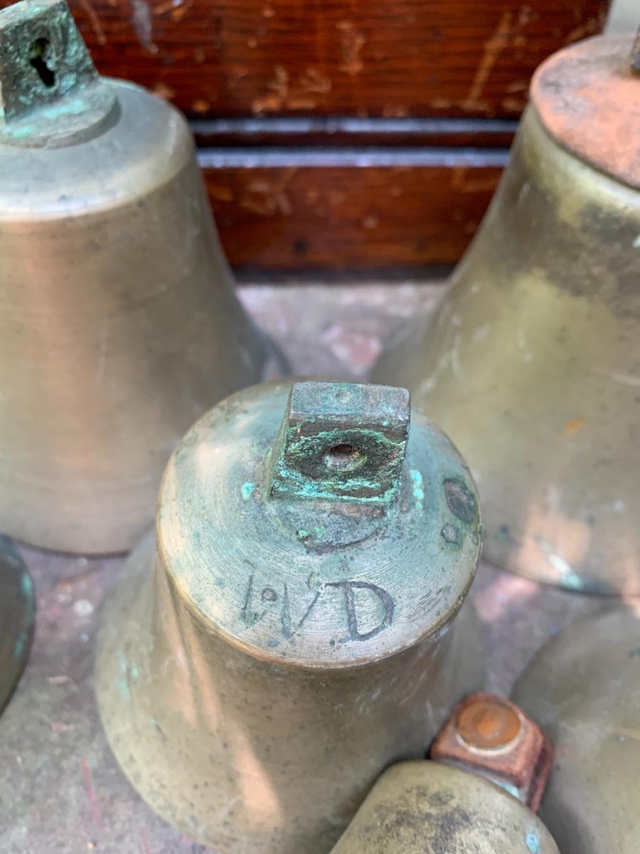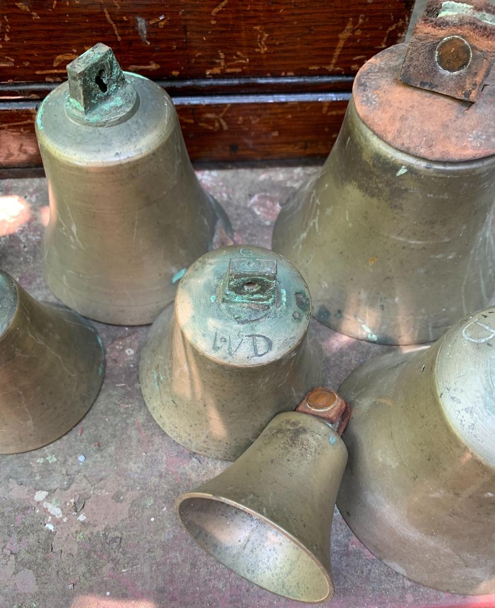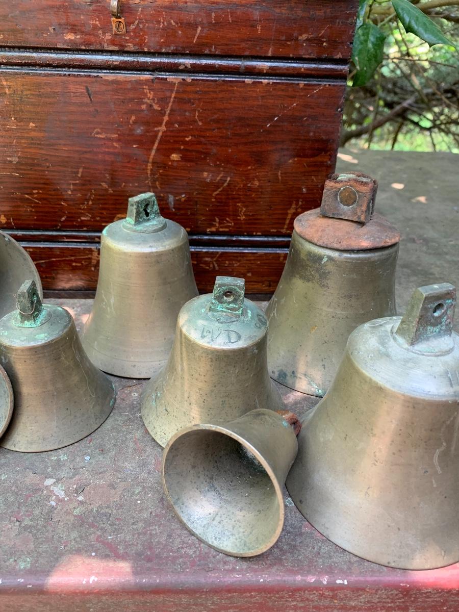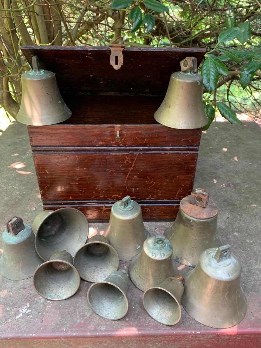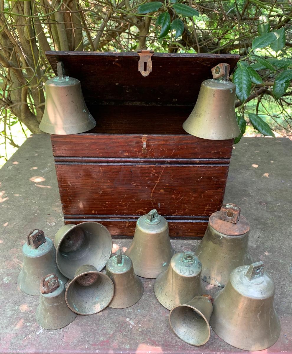 Nice older primitive Box, Large lot of Brass Project Bells all are missing the clapper (metal piece suspended inside a bell.)