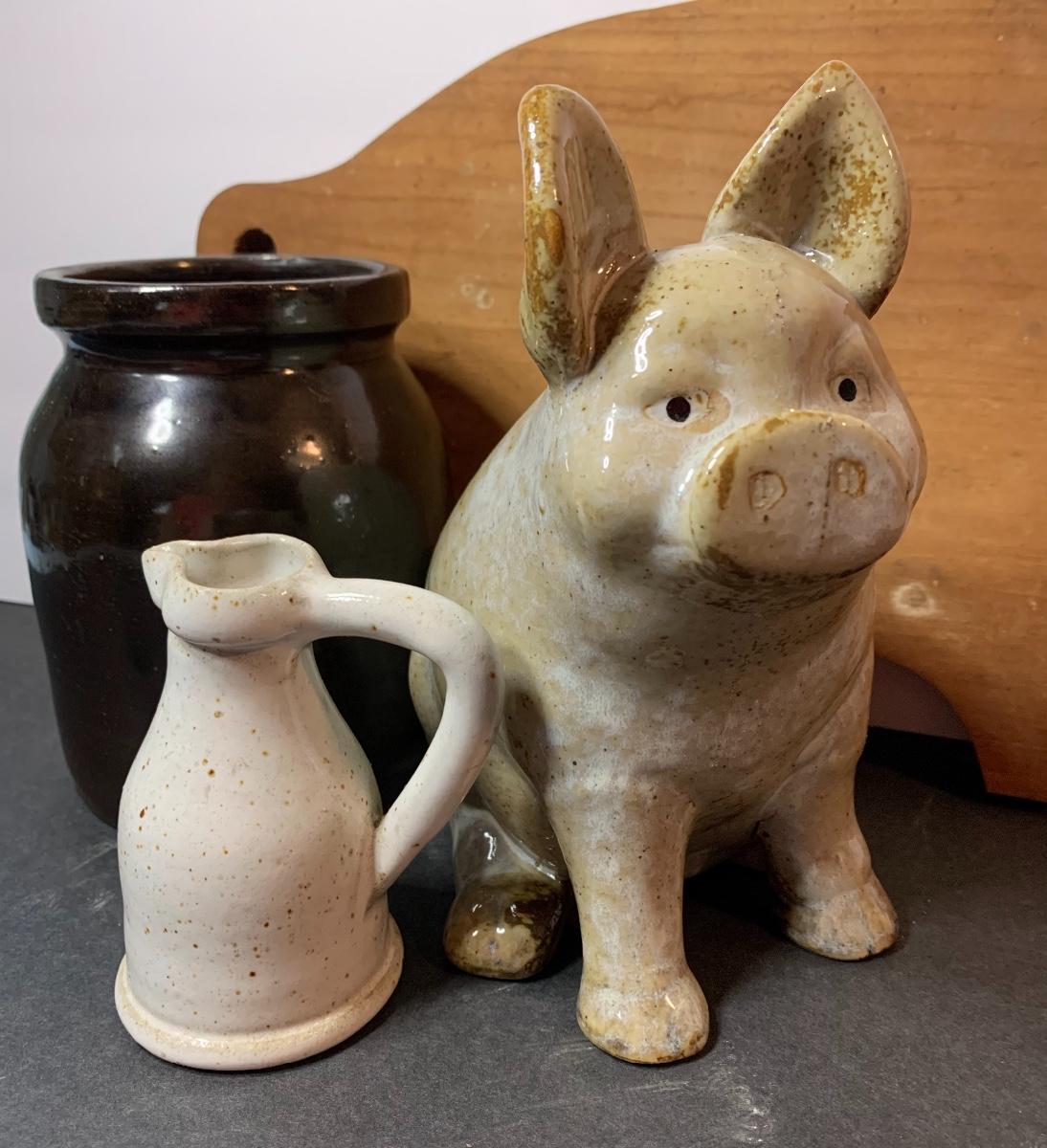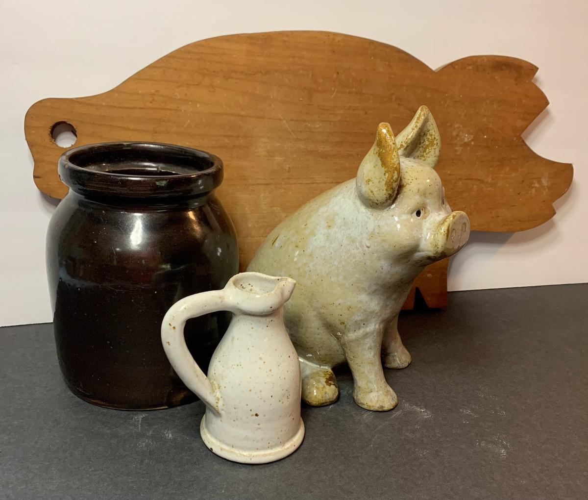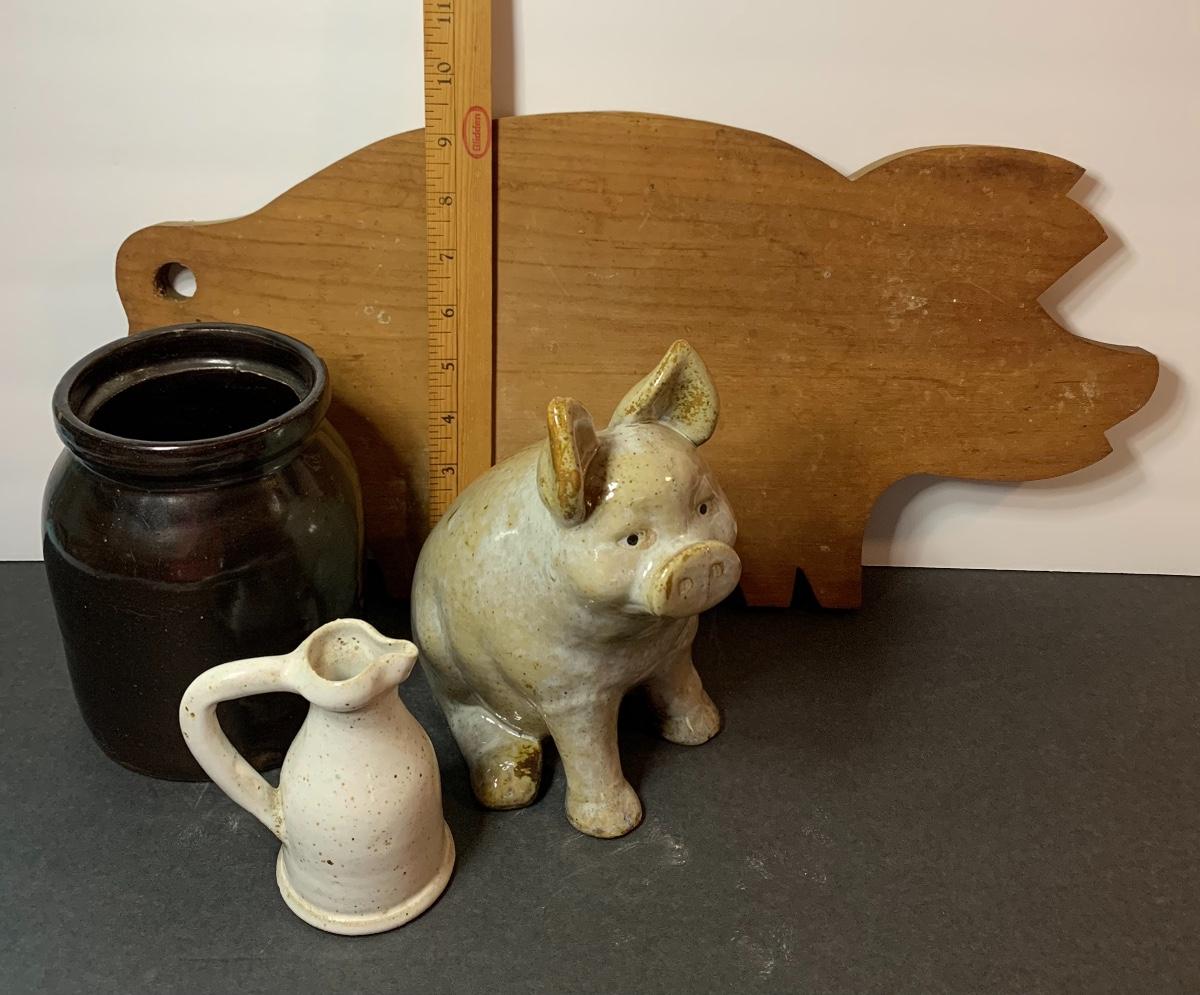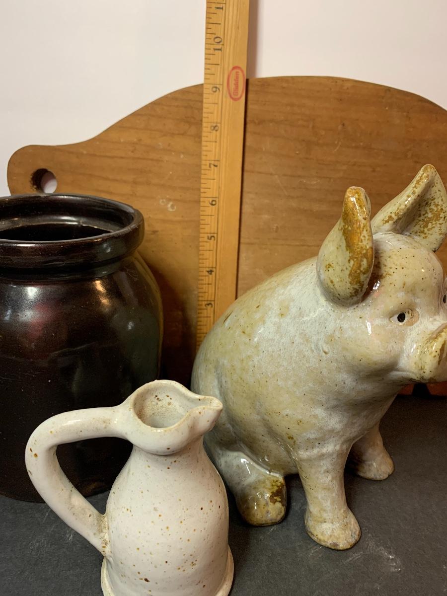 Stoneware Crock, Pig , Sm. Pitcher and Primitive Pig Cutting Board