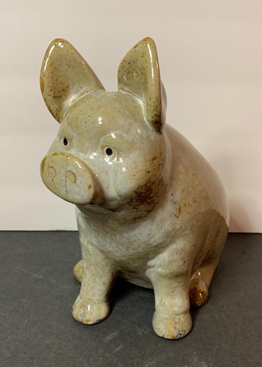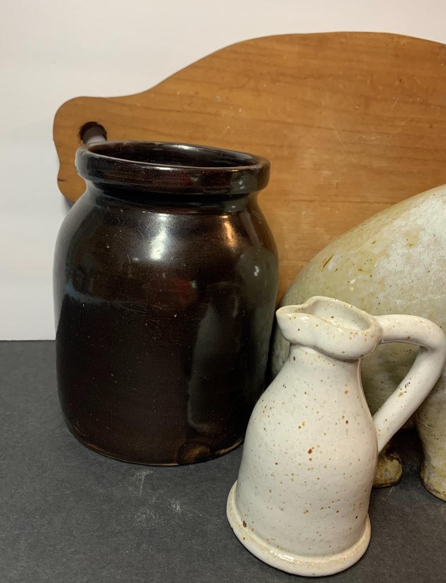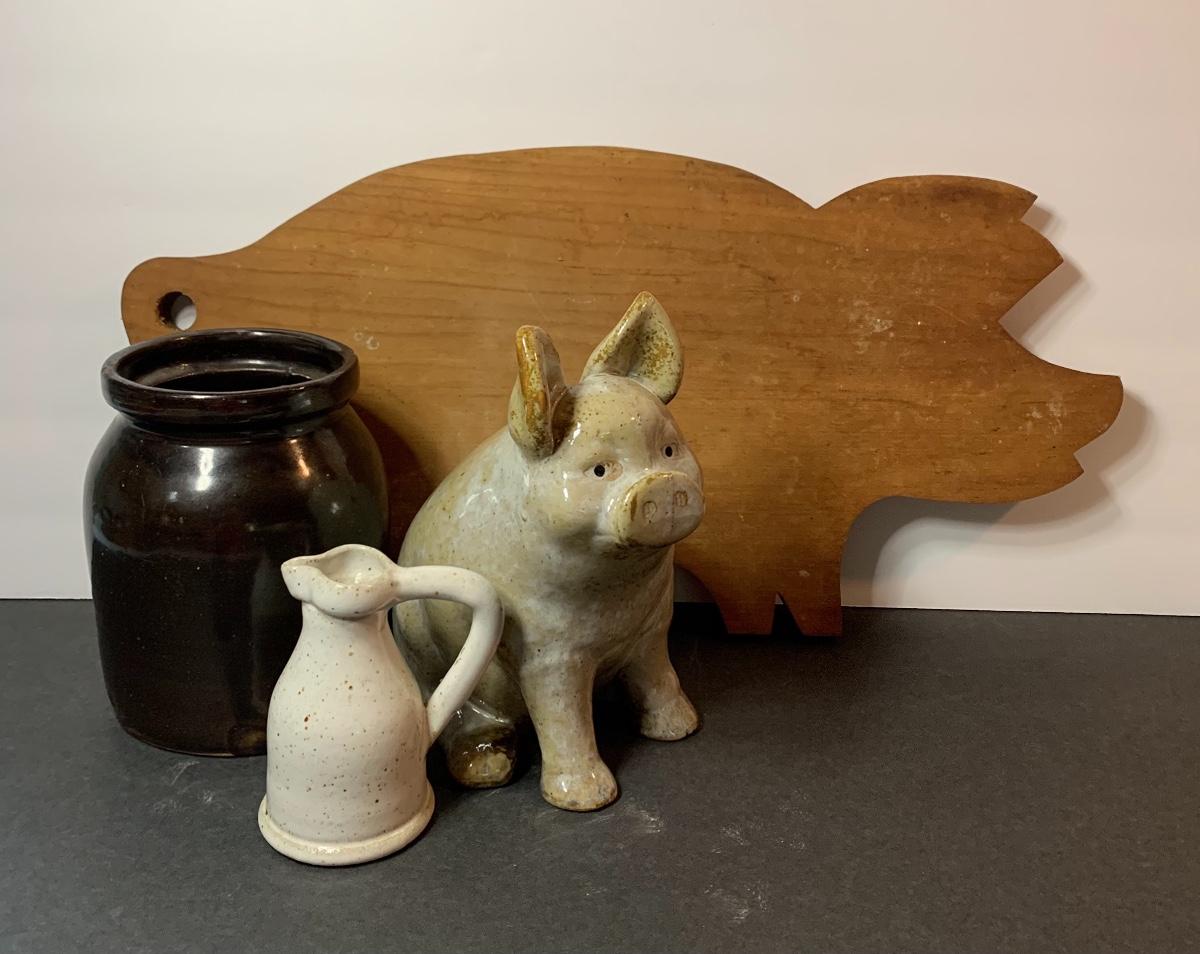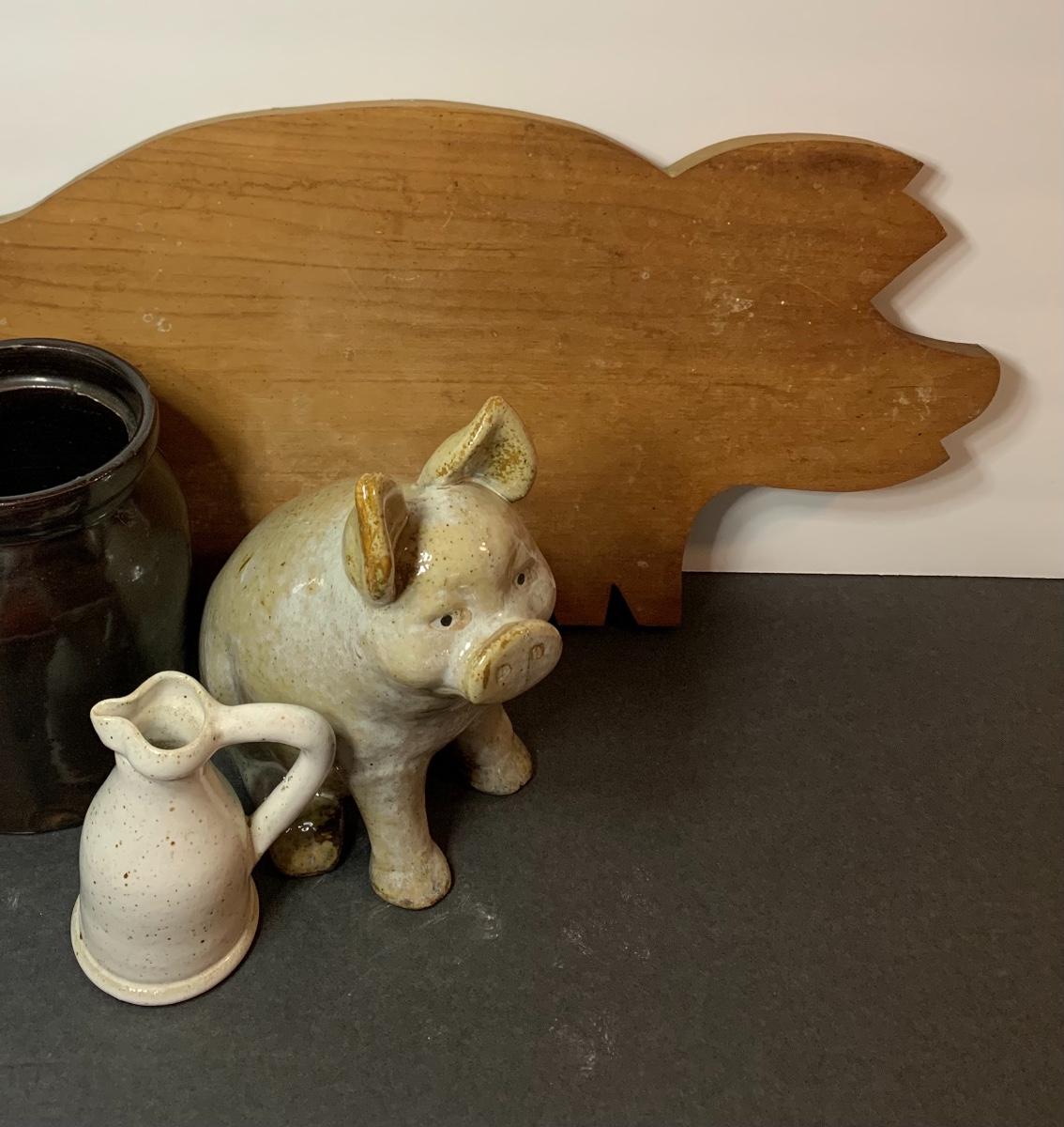 Stoneware Crock, Pig , Sm. Pitcher and Primitive Pig Cutting Board