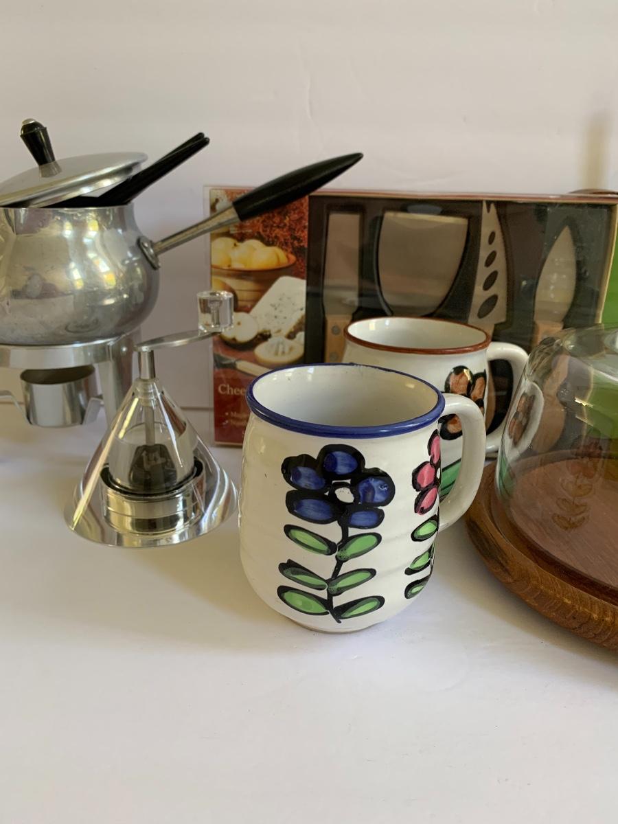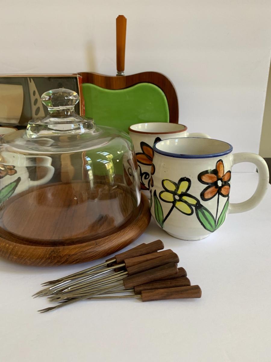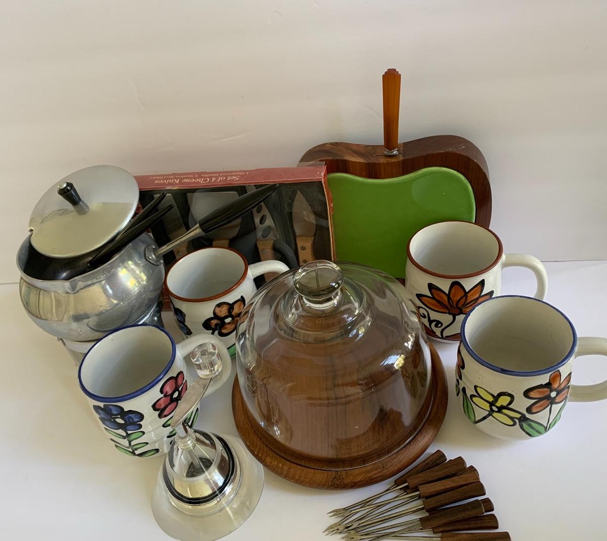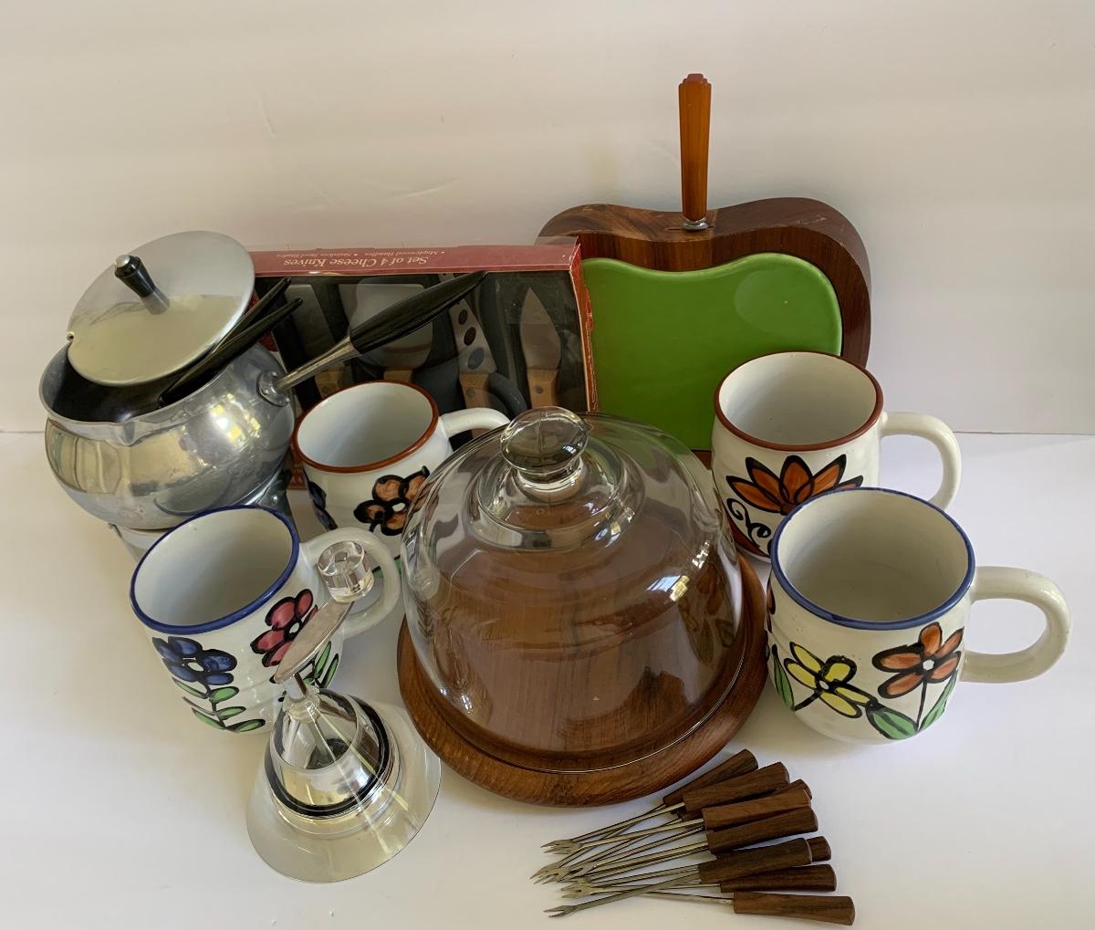 Tidbit forks w/vintage fondue pot, wooden covered cheese dish, wooden apple with ceramic insert cheese cutter/server with knife (not original). MCM floral made in Japan mugs, acrylic salt or pepper shaker, and new in box cheese knives.