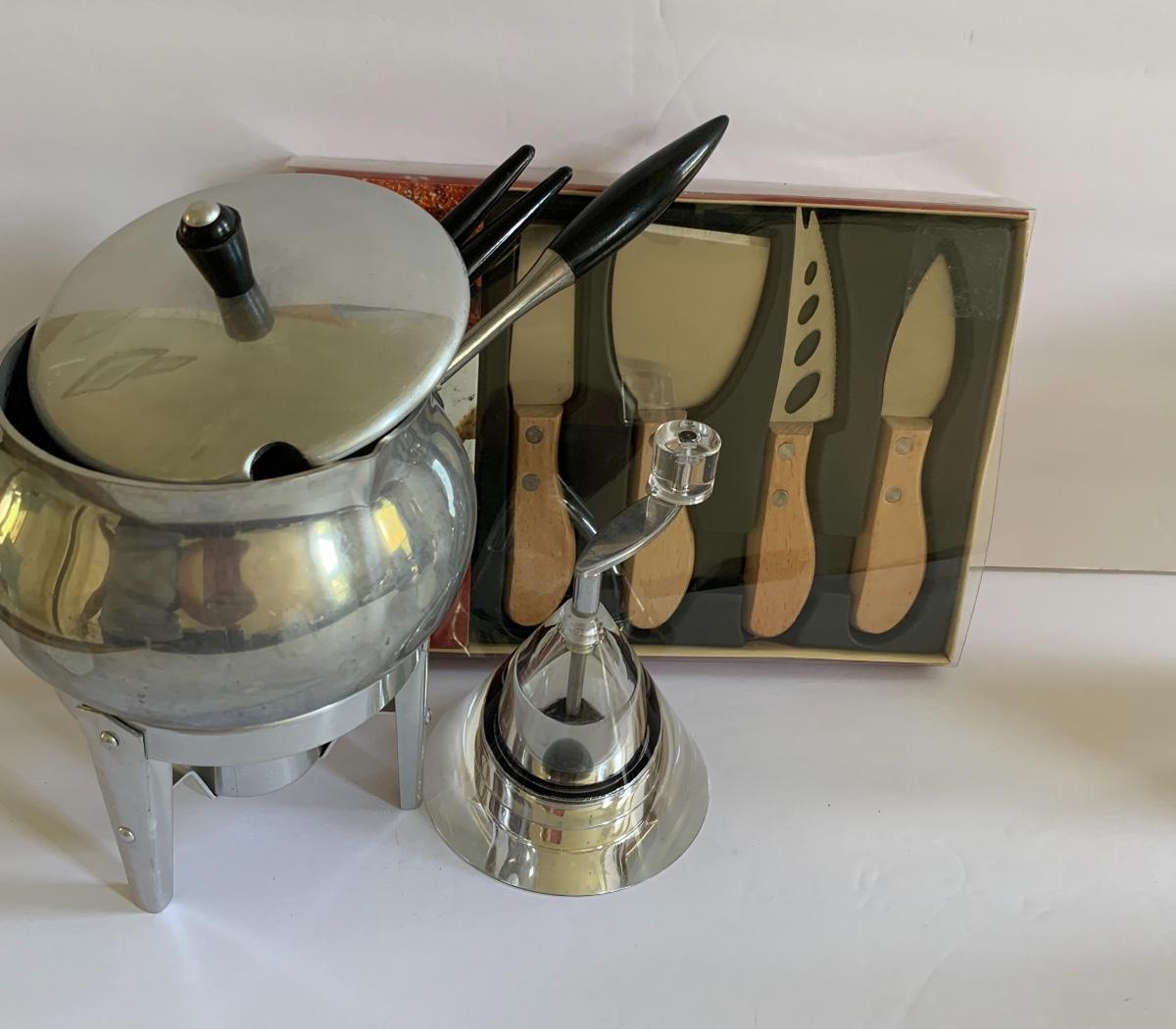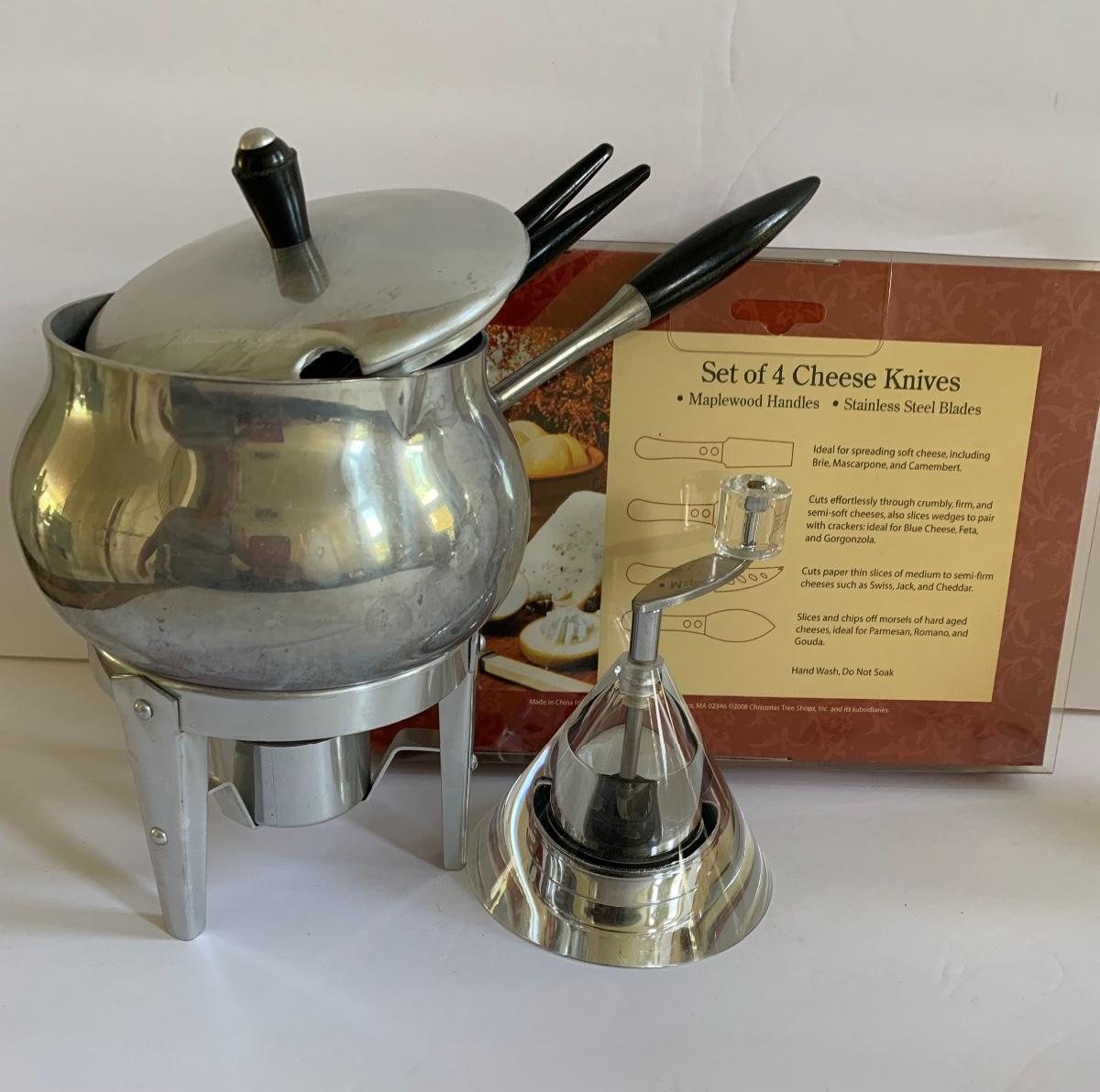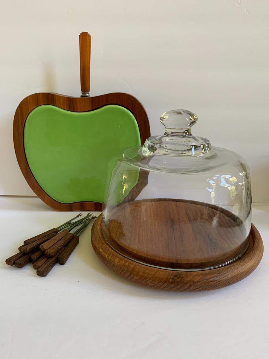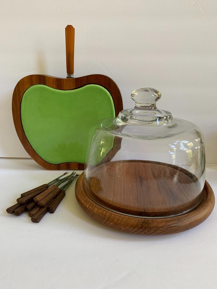 Tidbit forks w/vintage fondue pot, wooden covered cheese dish, wooden apple with ceramic insert cheese cutter/server with knife (not original). MCM floral made in Japan mugs, acrylic salt or pepper shaker, and new in box cheese knives.