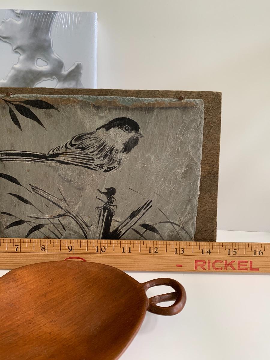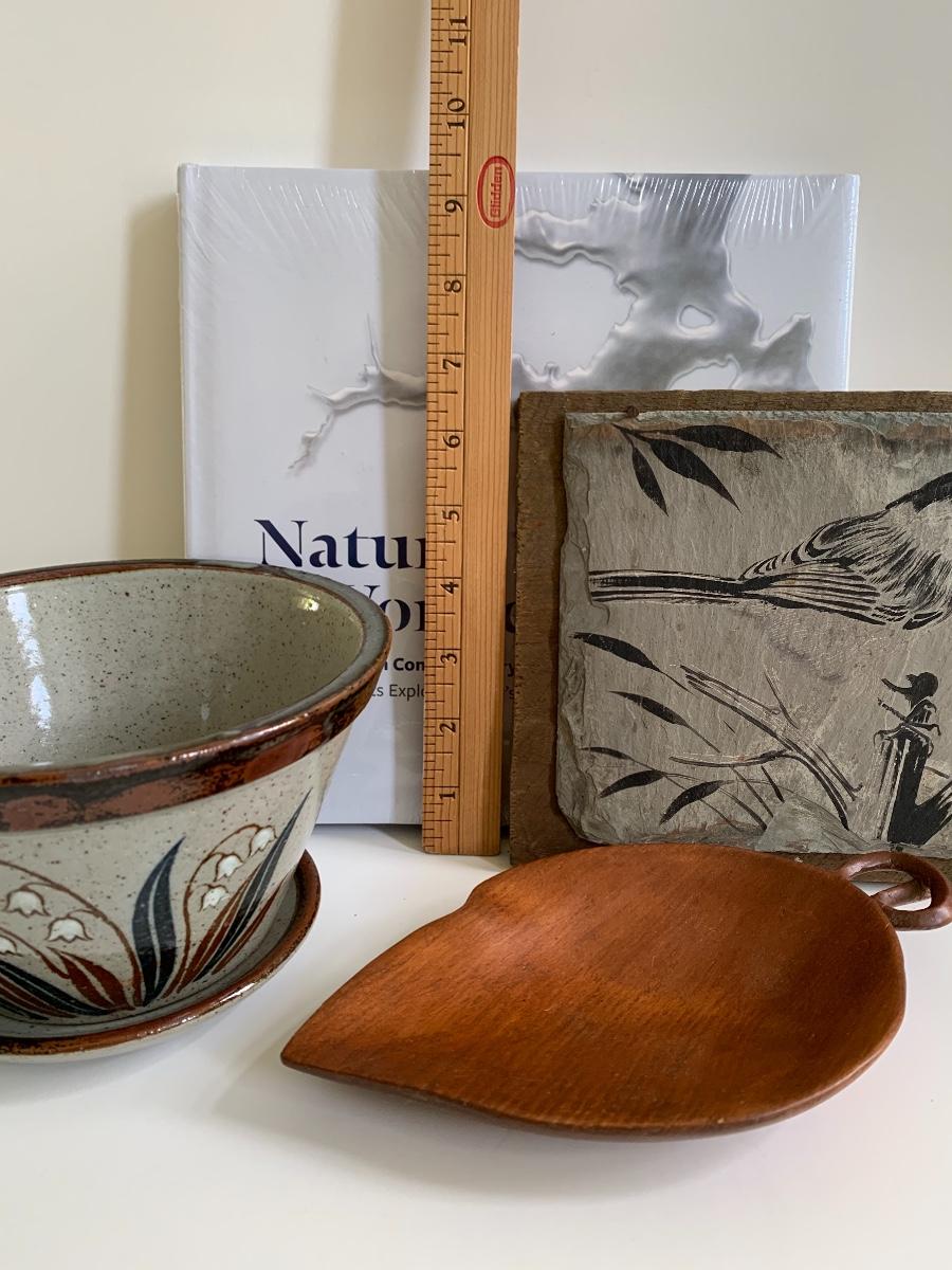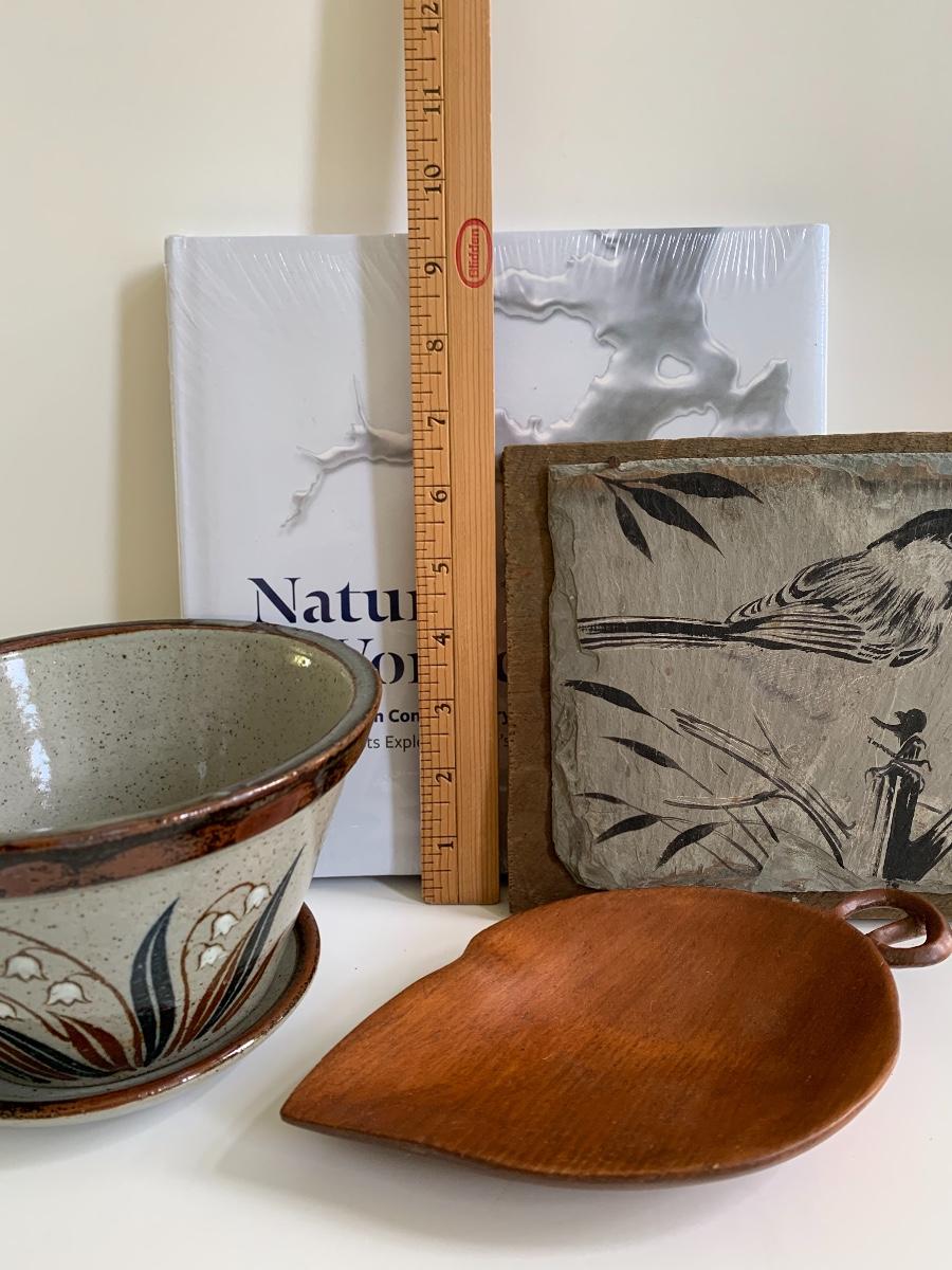 Natural Wonders Book, Hand Painted Pottery Planter, Painted Slate, Book & Wooden Dish.