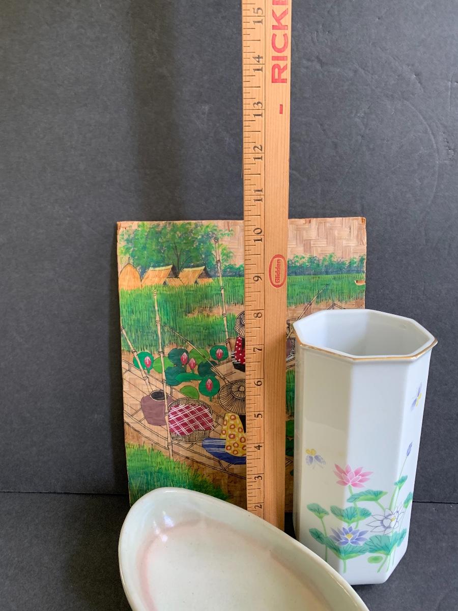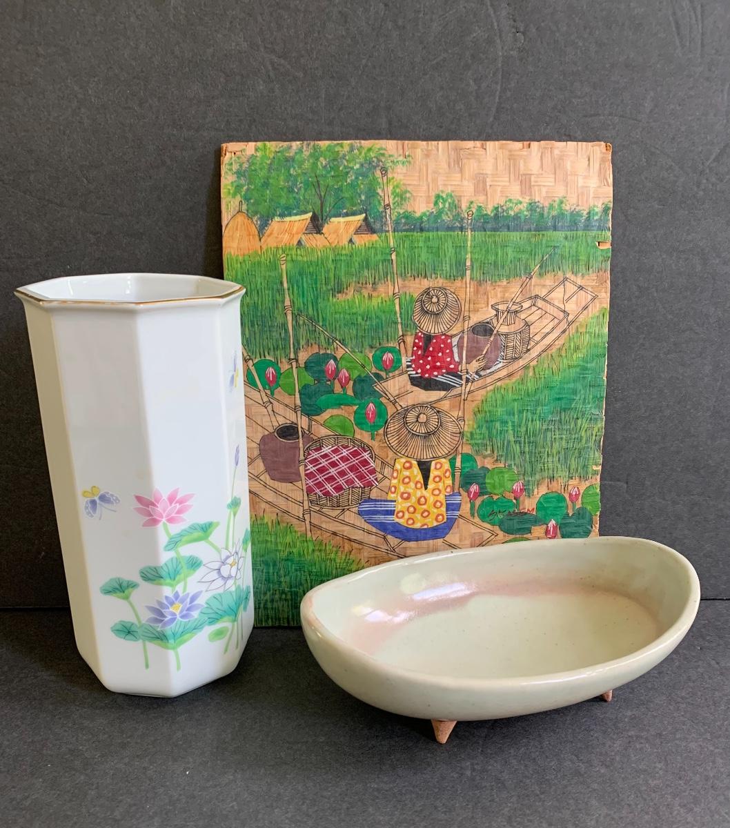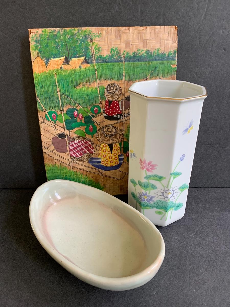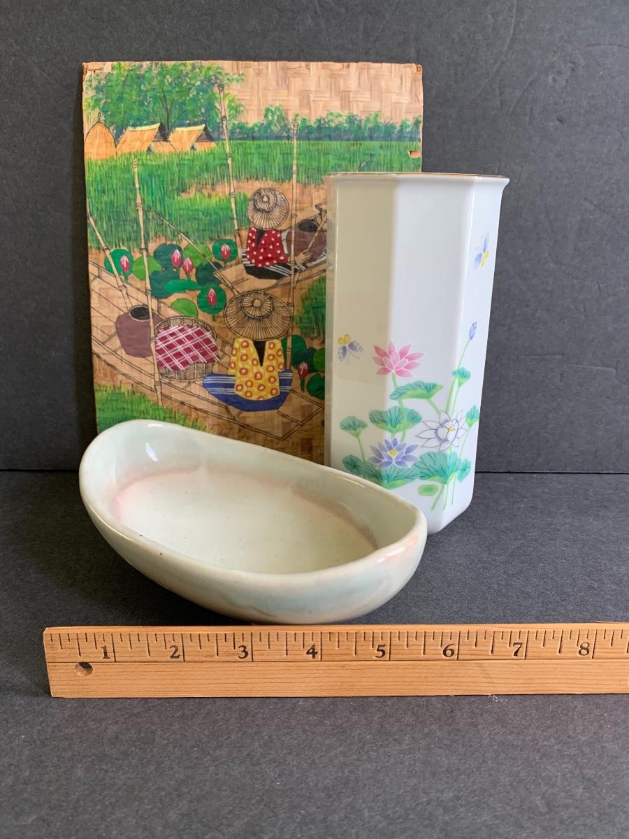 Otagiri Octagon Porcelain Vase with Gold Trim, Lotus Garden Design. Oval Stoneware Dish/Planter and with Hand Painter oil on Bamboo