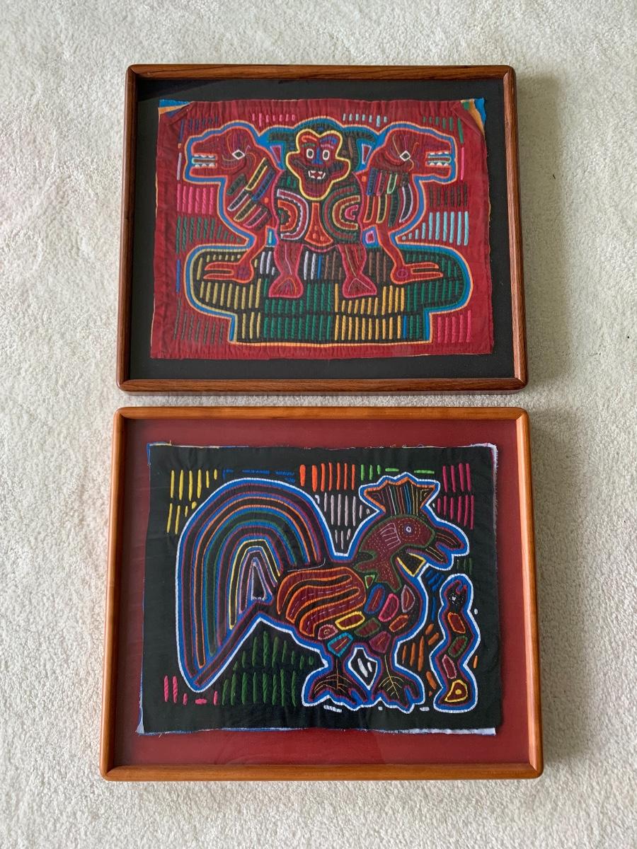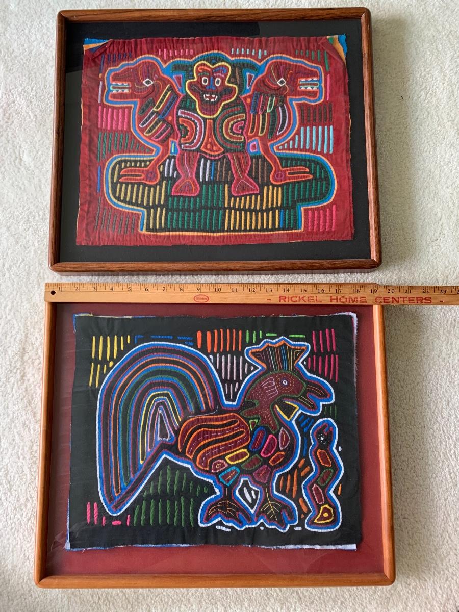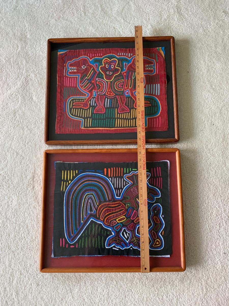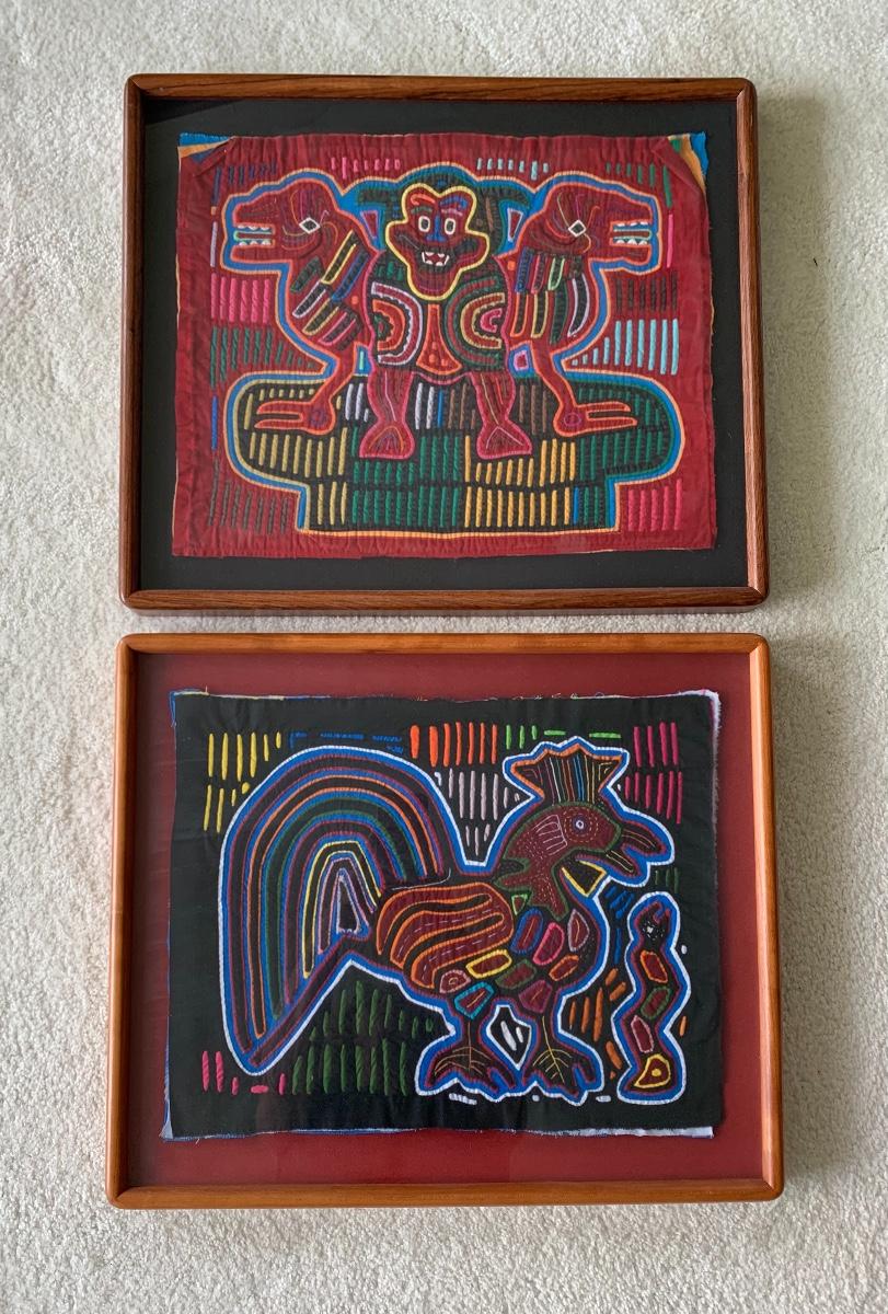 Pair of Framed Mola Art. Mola are is one of the last primitive art forms: a variation of the reverse appliqué craft passed down from generation to generation. Mola is a Cuna word meaning dress or suit. Your Mola was stitched by the skillful hands of a Cuna Indian living on the San Blas Islands off the coast of the Republic of Panama. Their vivid colors remain with no visible fading. Both are beautifully framed.