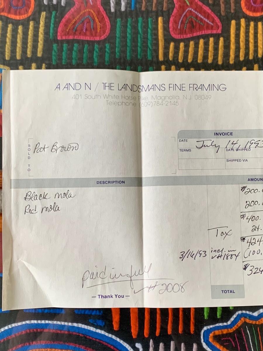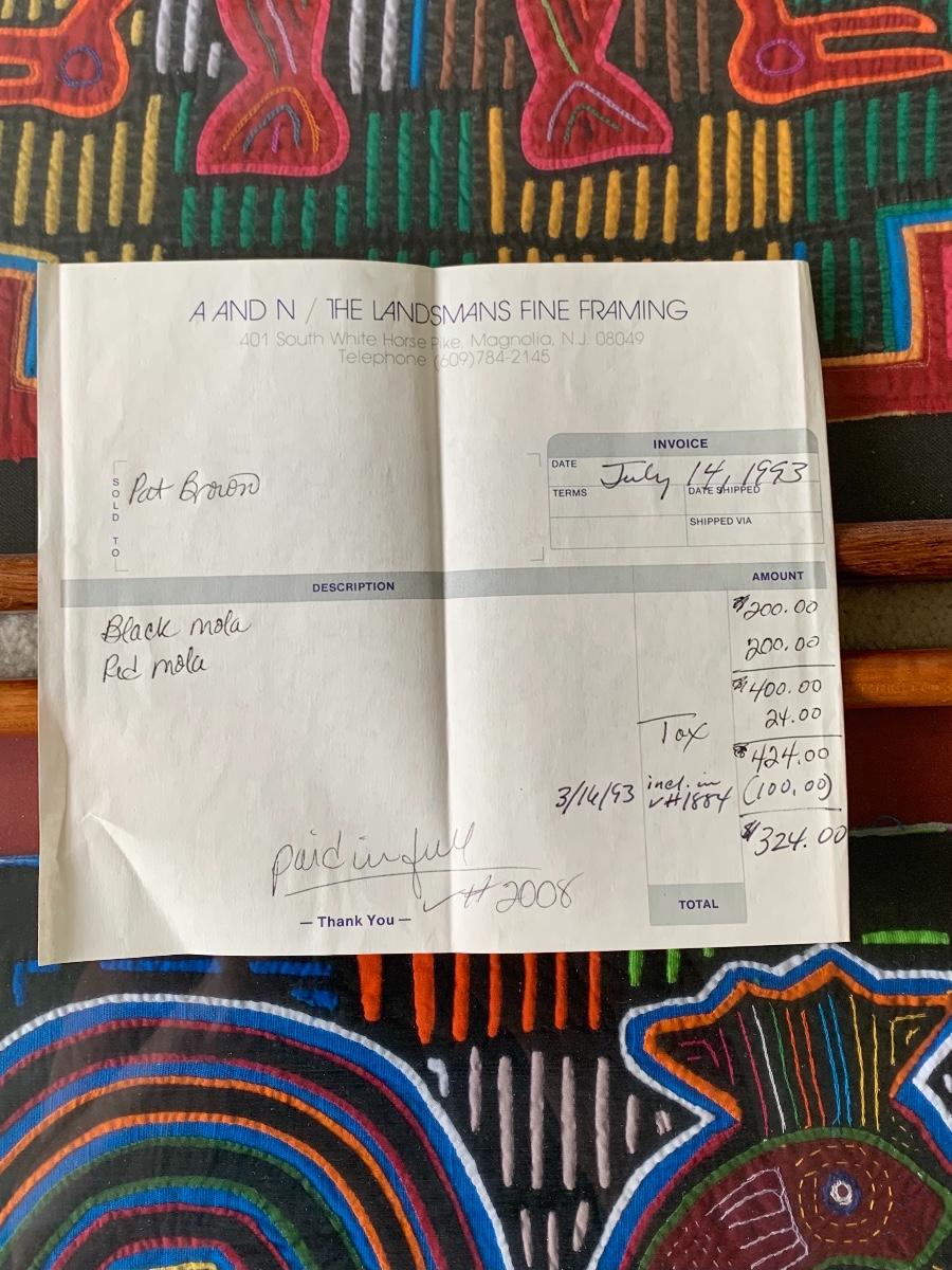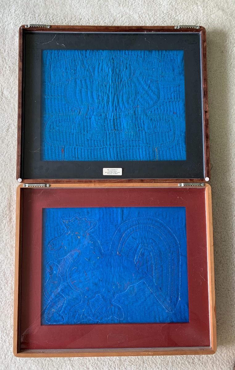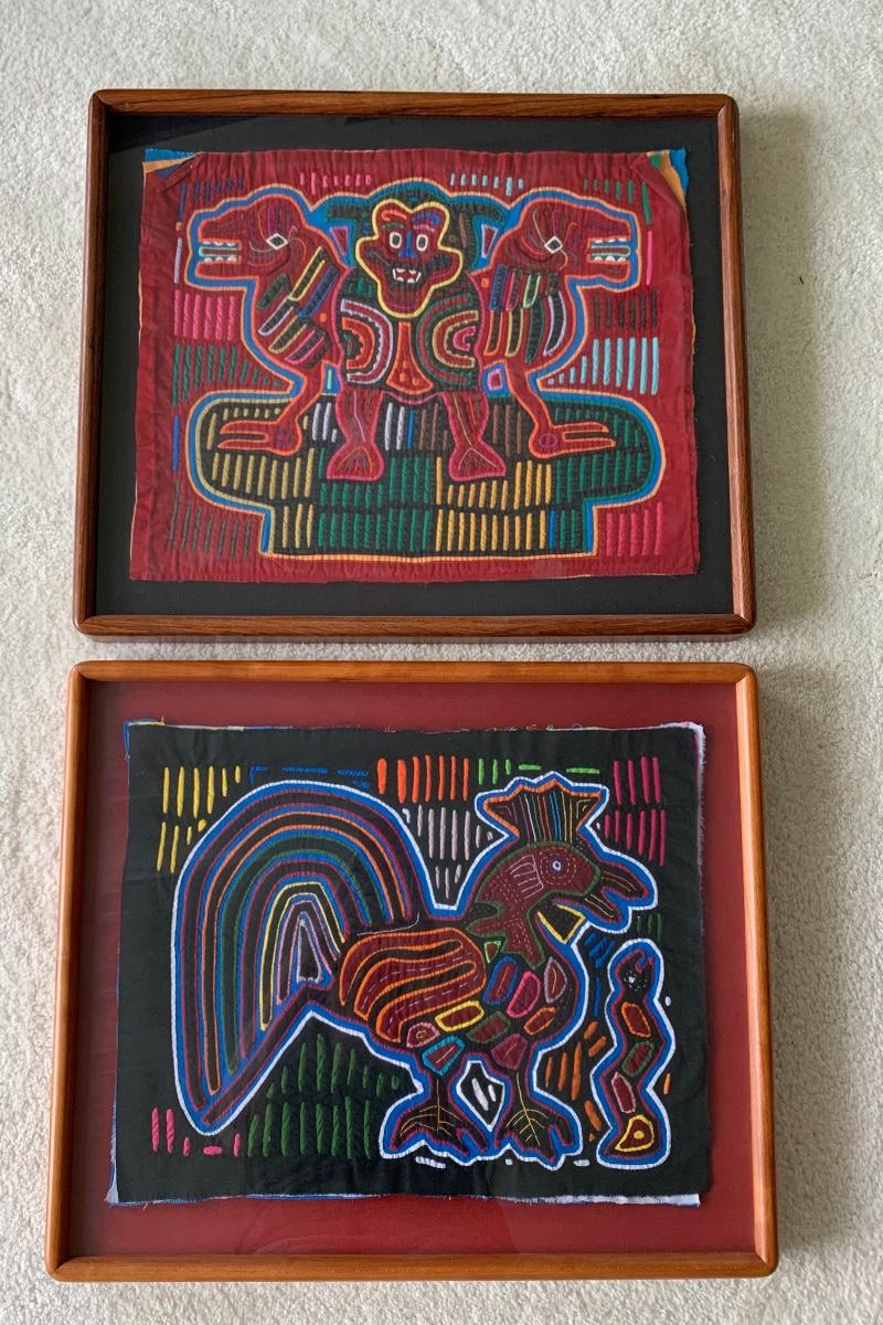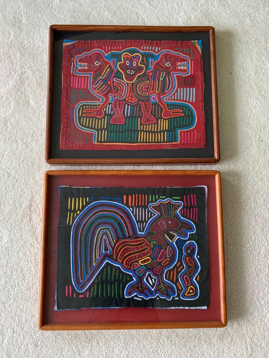 Pair of Framed Mola Art. Mola are is one of the last primitive art forms: a variation of the reverse appliqué craft passed down from generation to generation. Mola is a Cuna word meaning dress or suit. Your Mola was stitched by the skillful hands of a Cuna Indian living on the San Blas Islands off the coast of the Republic of Panama. Their vivid colors remain with no visible fading. Both are beautifully framed.