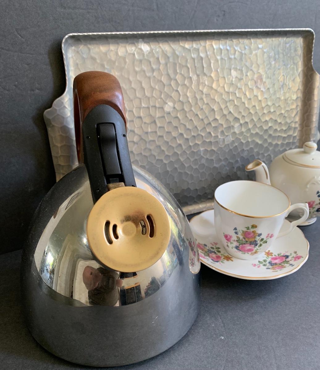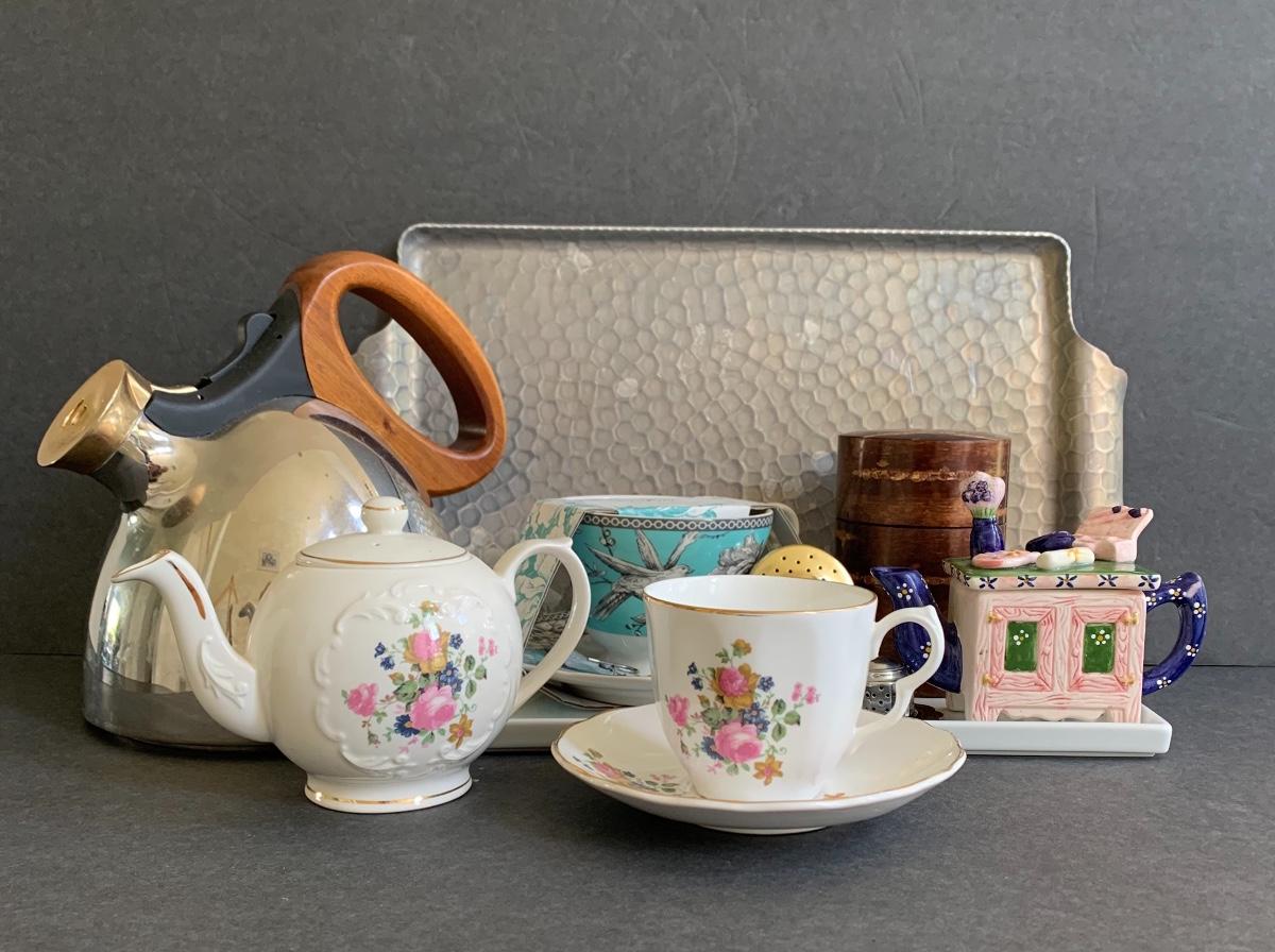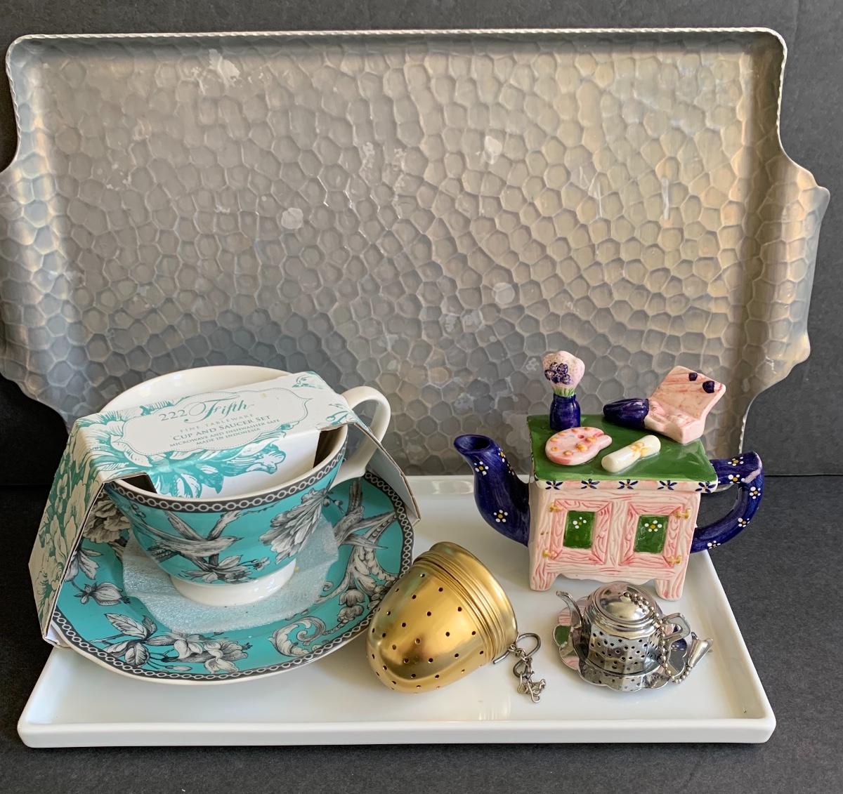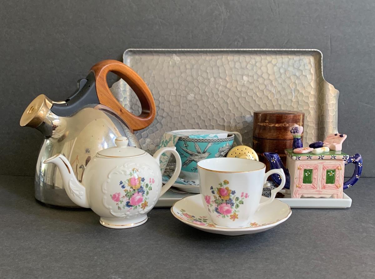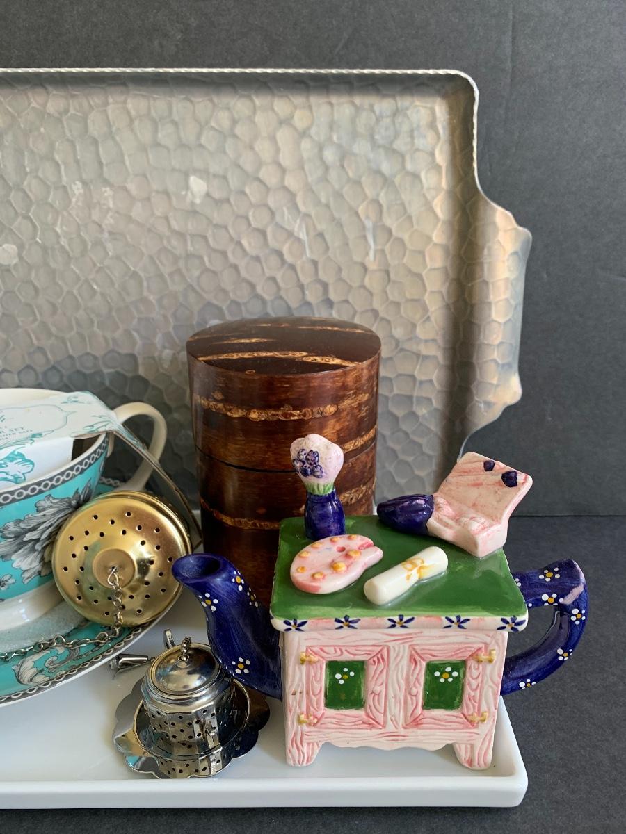 Tea Time: Nambe Tea Pot, Matching Crown, Staffordshire England Teas Pot and Cup, Cherry Bark Tea Canister ( helps to keep tea fresh), tea infuser and more