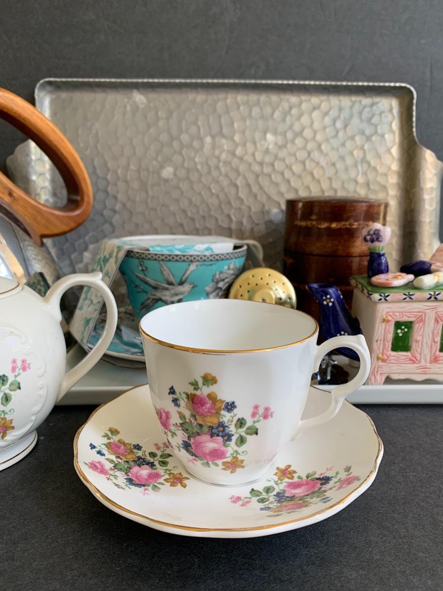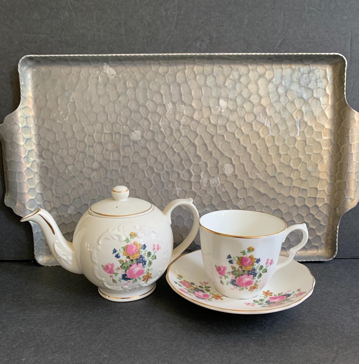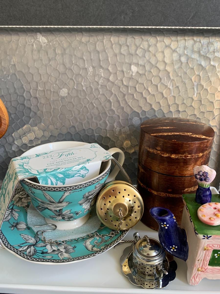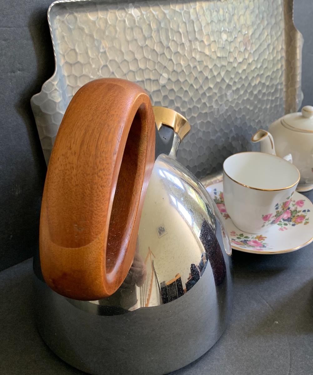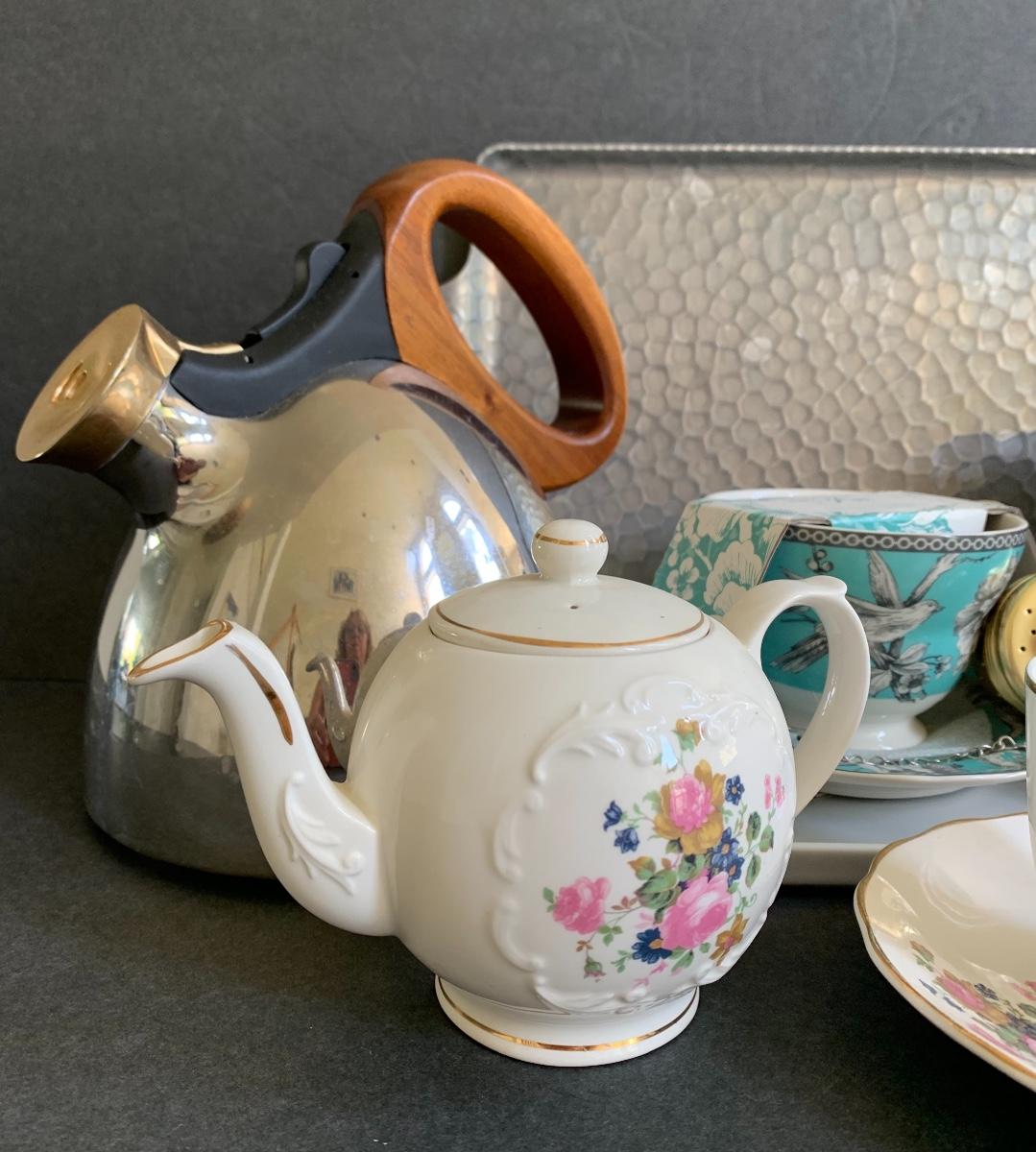 Tea Time: Nambe Tea Pot, Matching Crown, Staffordshire England Teas Pot and Cup, Cherry Bark Tea Canister ( helps to keep tea fresh), tea infuser and more