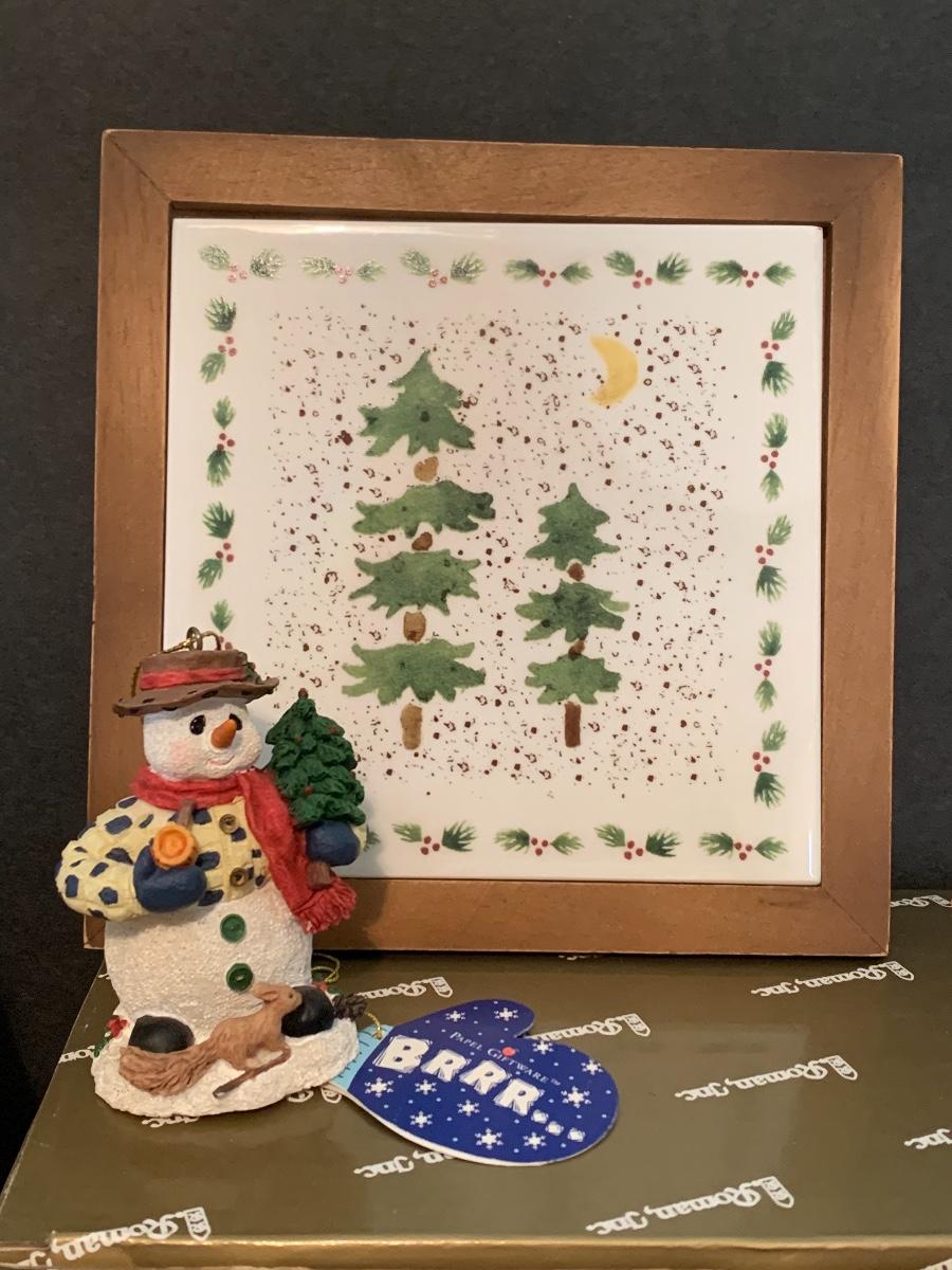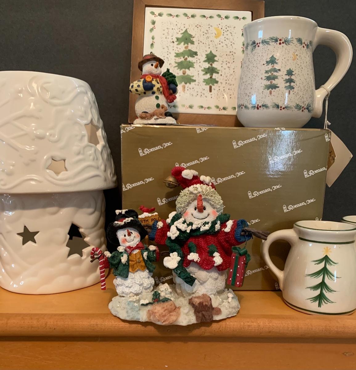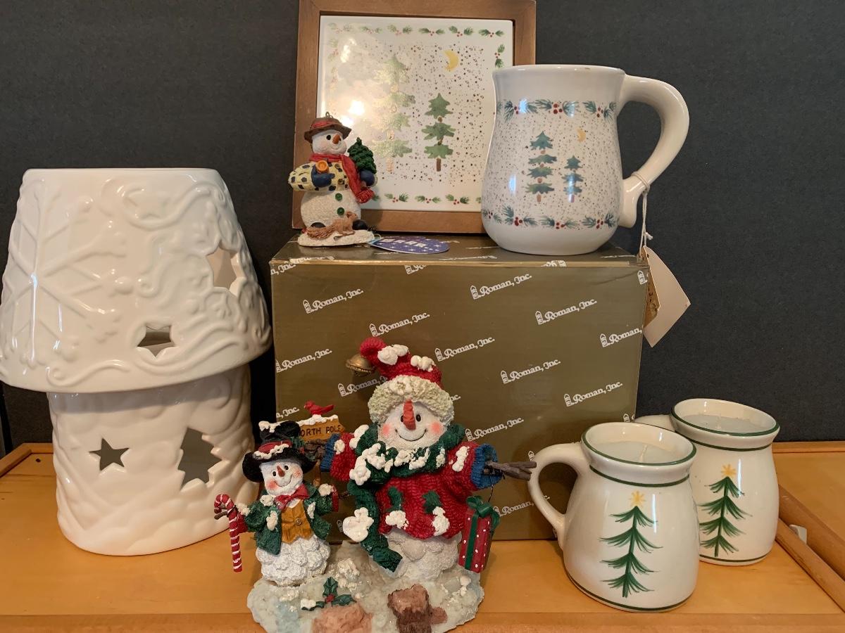 Lot 115: Jar Candle Holder, Matching Moose Creek Lodge Trivet & Mug, Snowman & More