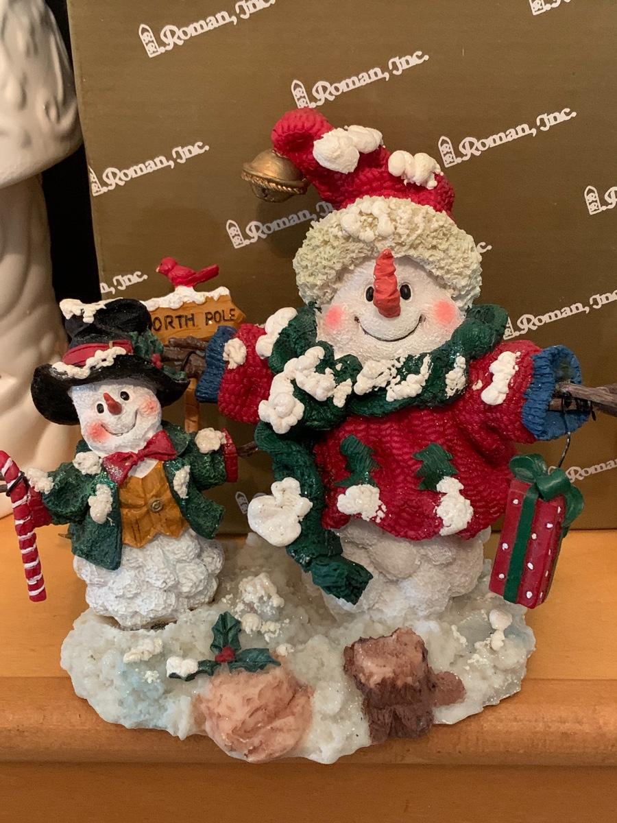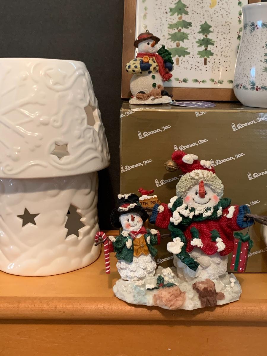 Roman Inc. Snowman Figurines & Candle Jar Holder, Matching Trivet & Mug and Pair of Hand Painted Candles in Mugs.