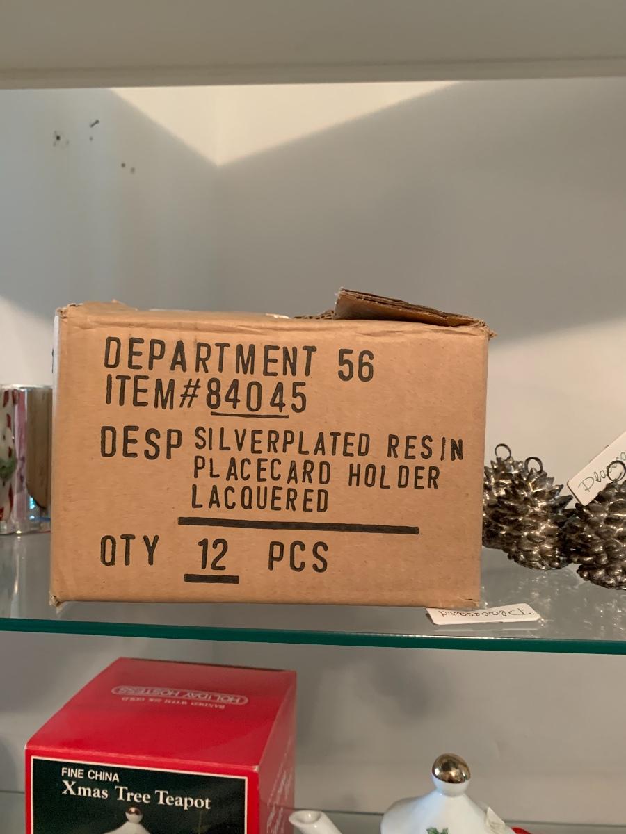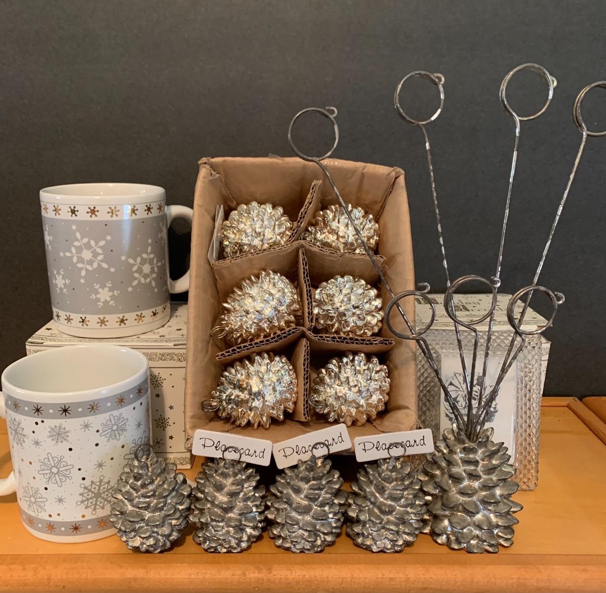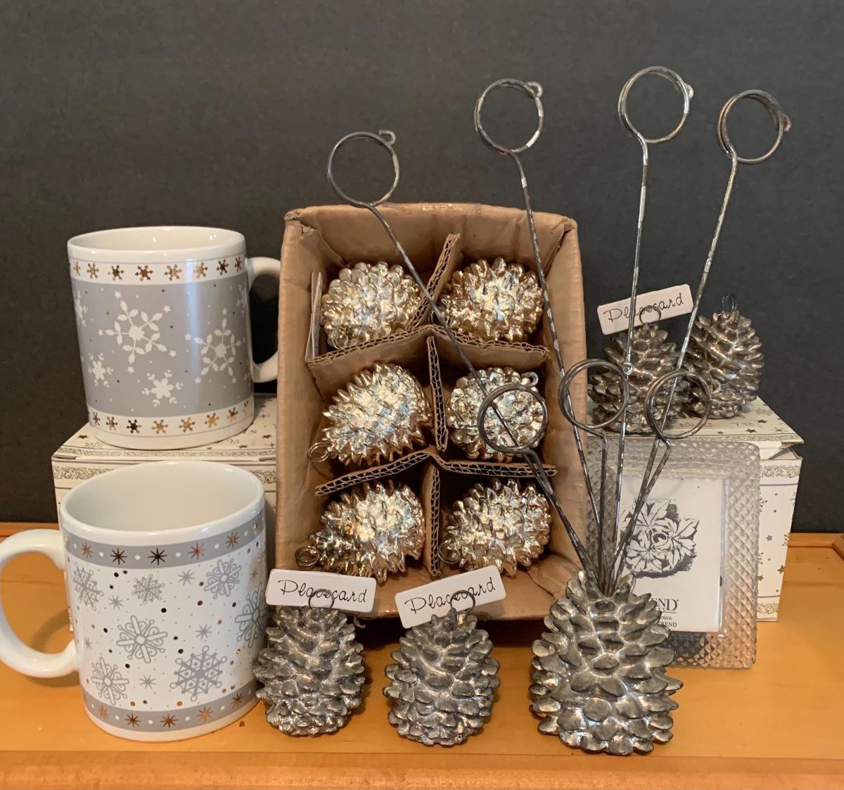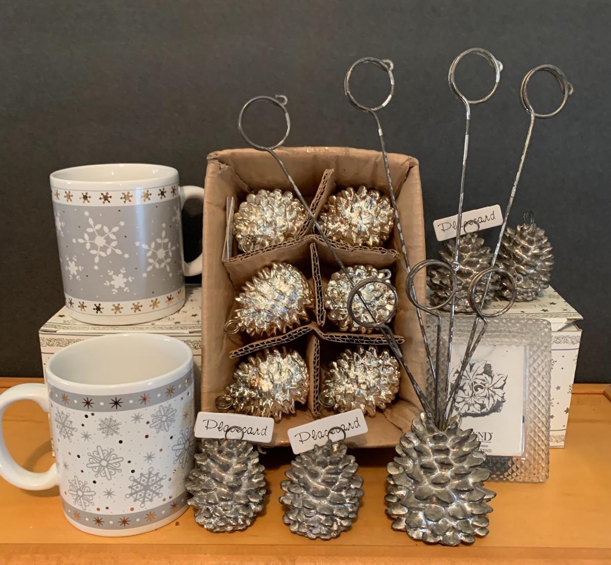 Beautiful pair of mugs with boxes, small glass picture frame. Dept. 56 Pine Cone Place Card Holders and could be used to hold cards or pictures. Silver plated, set of 12 in box plus 4 (loose) and a card/picture holder.