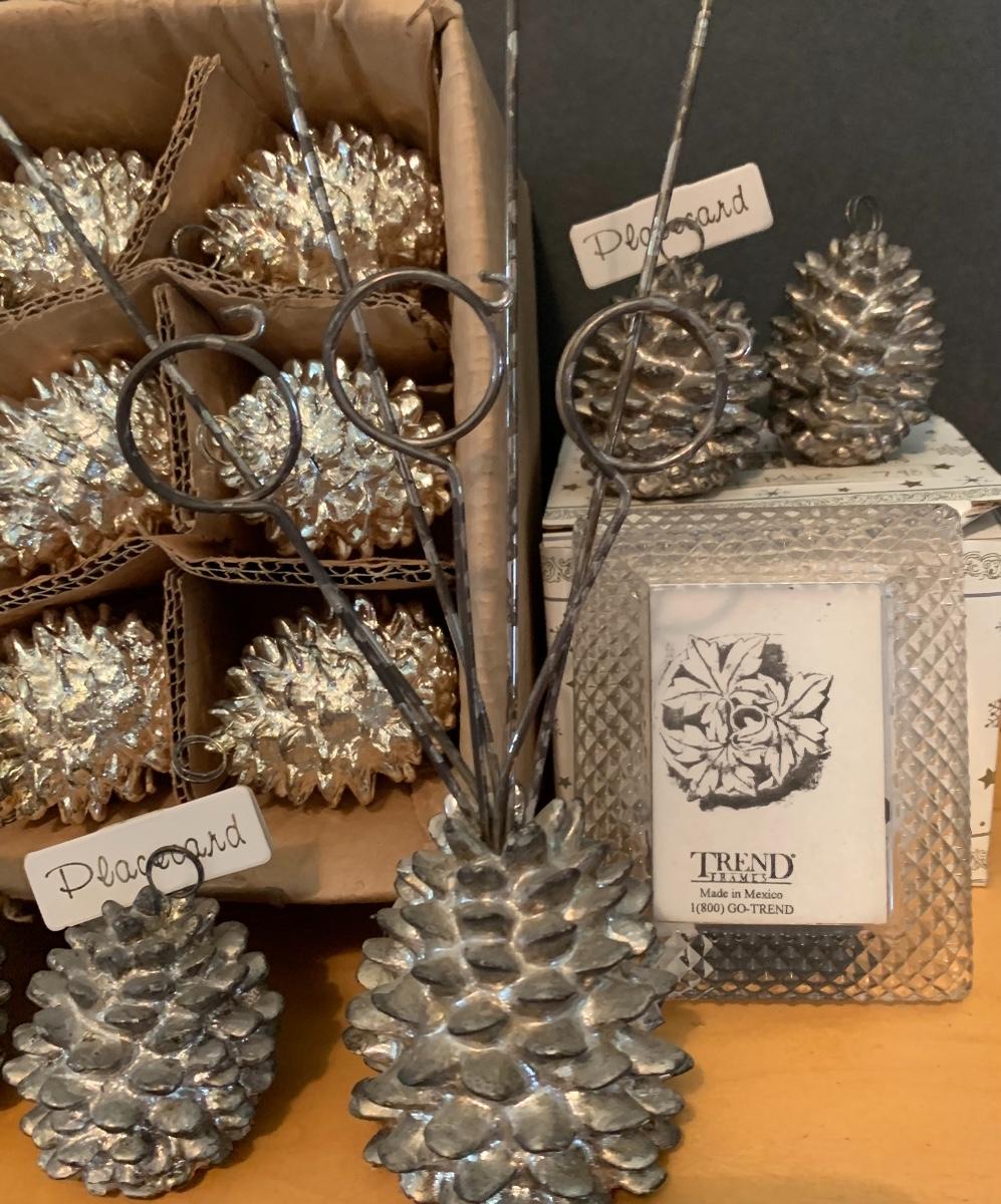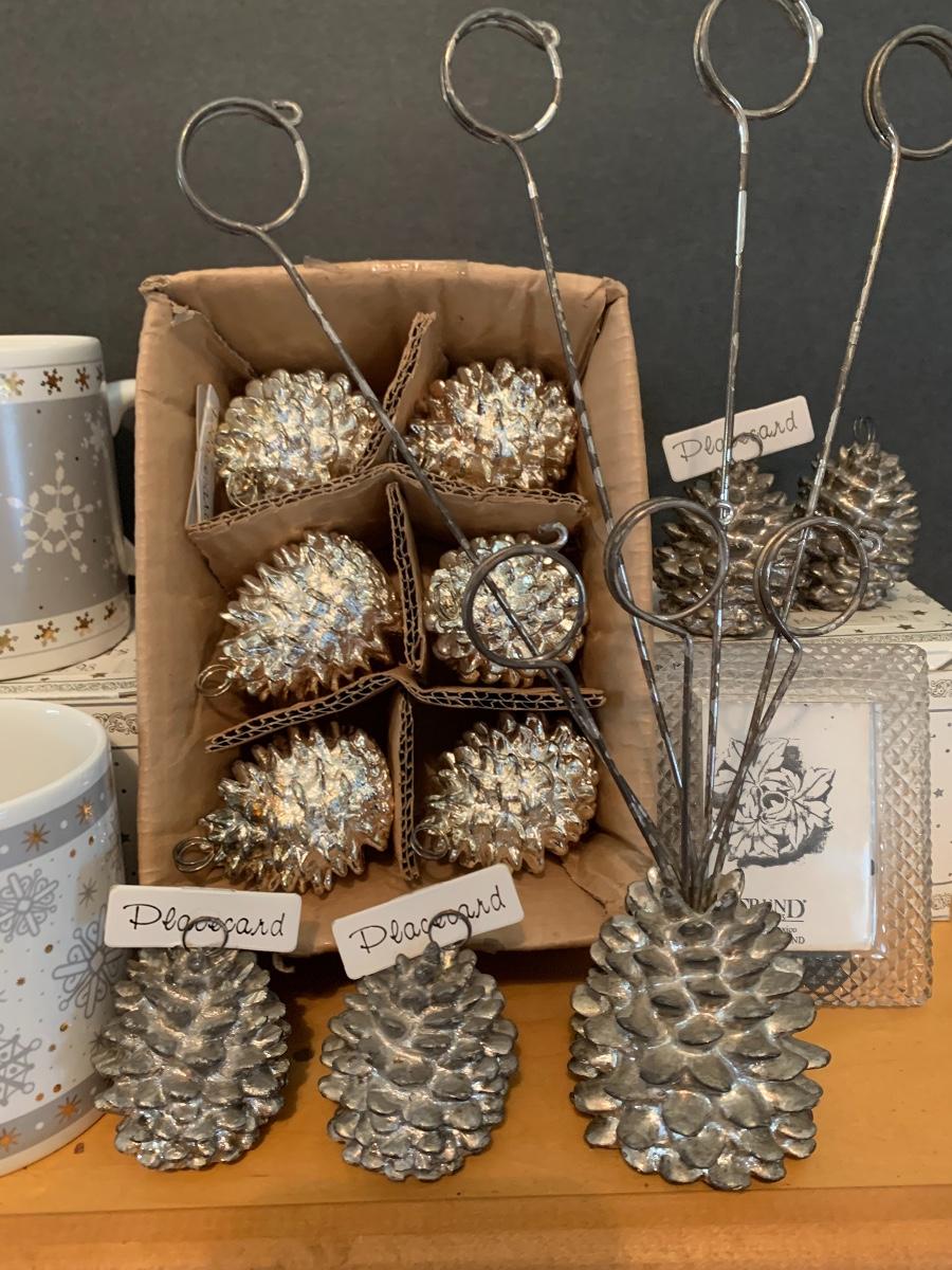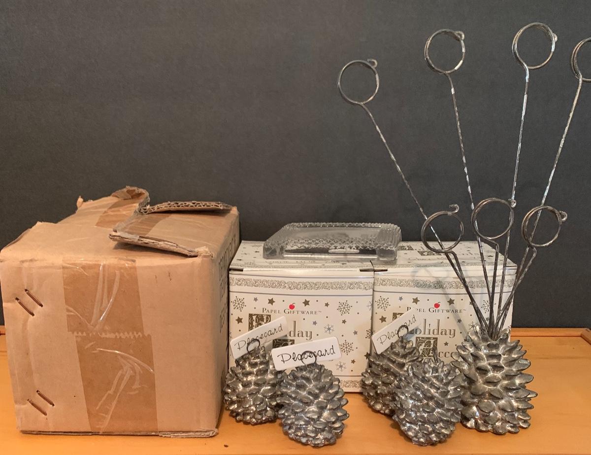Beautiful pair of mugs with boxes, small glass picture frame. Dept. 56 Pine Cone Place Card Holders and could be used to hold cards or pictures. Silver plated, set of 12 in box plus 4 (loose) and a card/picture holder.