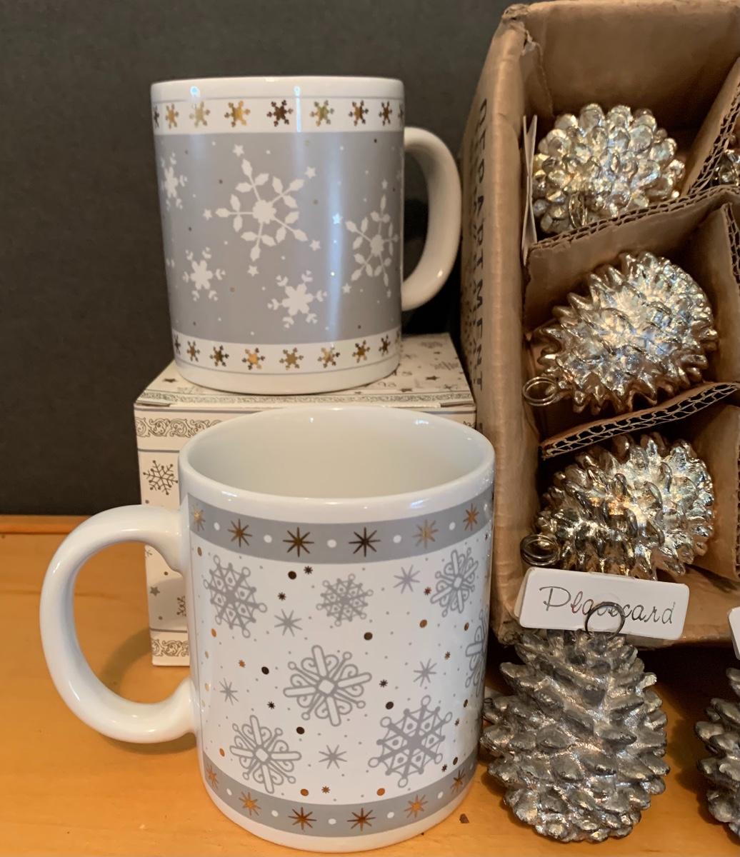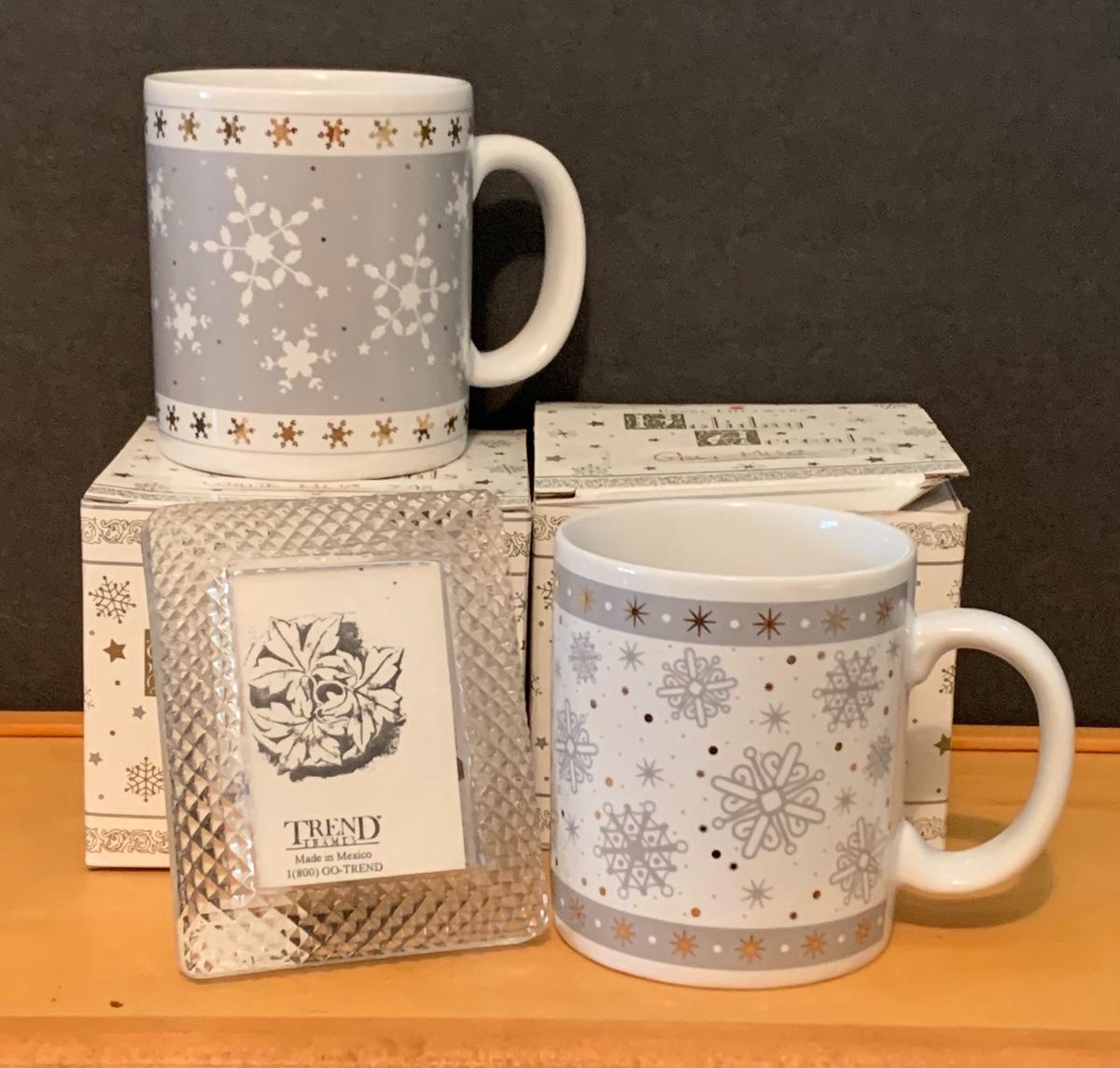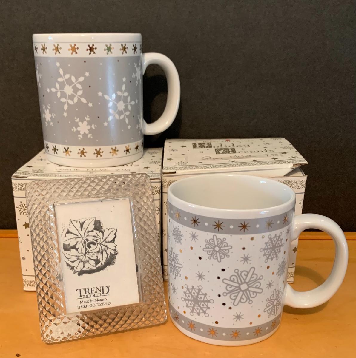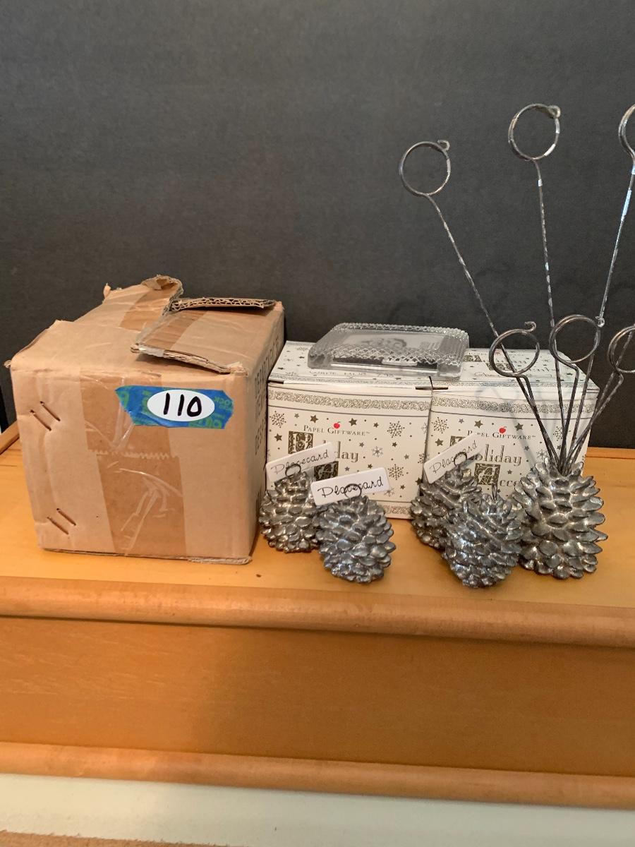 Beautiful pair of mugs with boxes, small glass picture frame. Dept. 56 Pine Cone Place Card Holders and could be used to hold cards or pictures. Silver plated, set of 12 in box plus 4 (loose) and a card/picture holder.